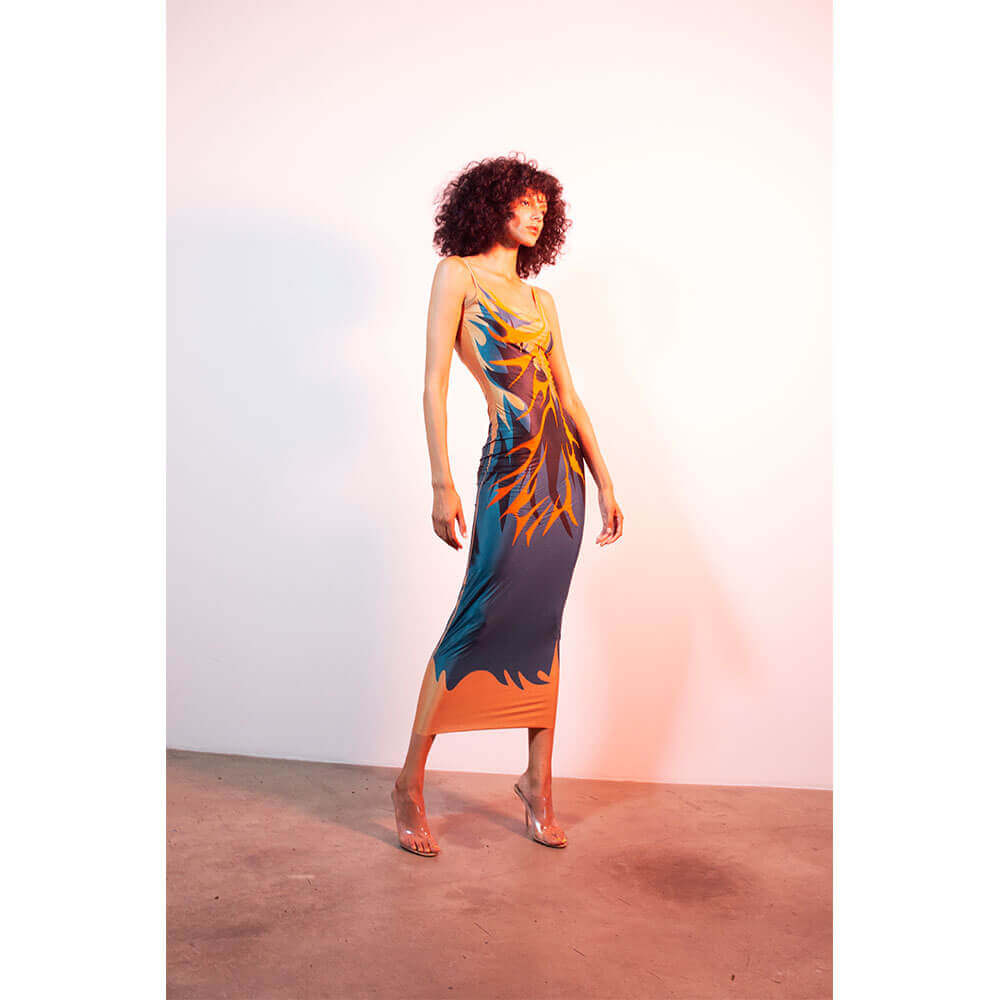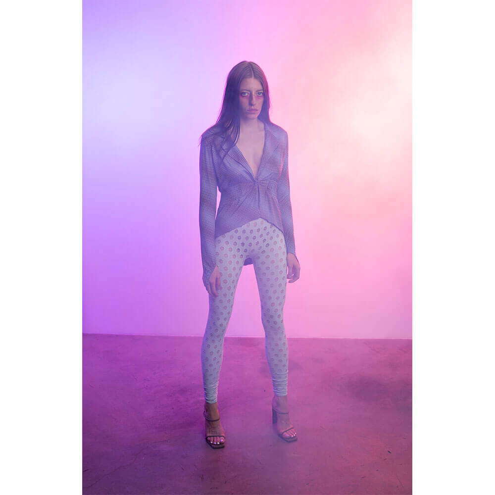 The sprawling white-walled and polished concrete-floored space of the Night Gallery in Downtown LA was the location of Maisie Wilen’s debut presentation. Models stood on plinths and were interspersed amongst the paintings on display, whilst guests including West, Tremaine Emory and Shaun Ross mingled in the impressive space. Styled by Krissie Torerson, the girls looked ready to jump down and attend a private view, these were the kind of clothes you want to be seen in and you want to be photographed in. Form-fitting and fun, inspired by robotics and rhythmic gymnastics and realised in a hyper-saturated colour palette with prints that verged on trippy, Schloss’s first Pre-Spring collection consists of 27 styles and almost 90 individual pieces. “I feel like I could style for days. There are so many great outfits to come out of it,” she says. Pieces range from playfully nostalgic figure-hugging cowl neck mini-dresses, chunky woven skirts, boxy textural jackets and sporty skins woven with holes that anchor to the hands, and will begin dropping in stores in late October and early November.