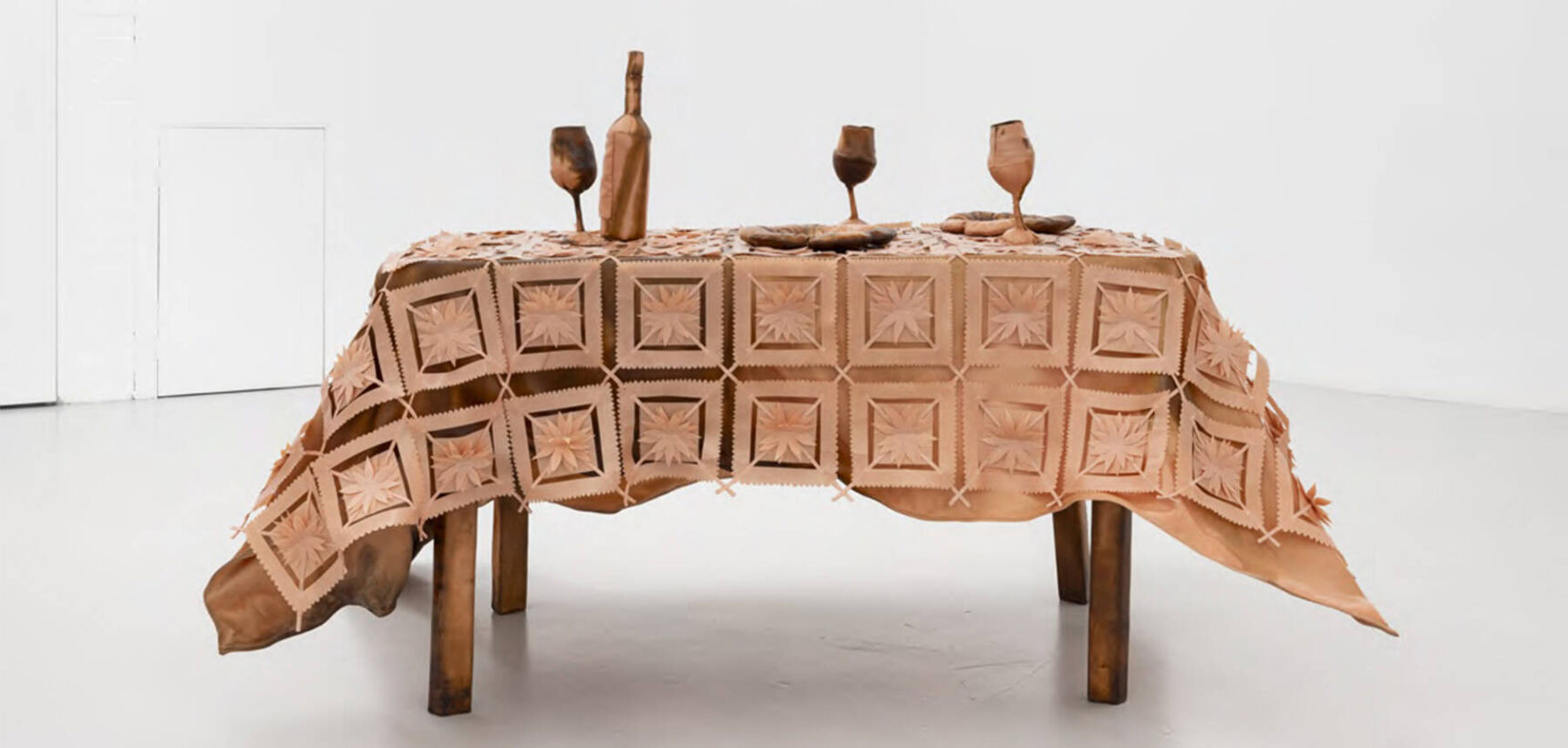Top image: Sandra Poulson; Mesa de 12 Horas, 2023; Satin fabric, MDF, aluminium wire, fabric hardener, textile stuffing 112h x 200w x 160d cm, photography courtesy of Almine Rech