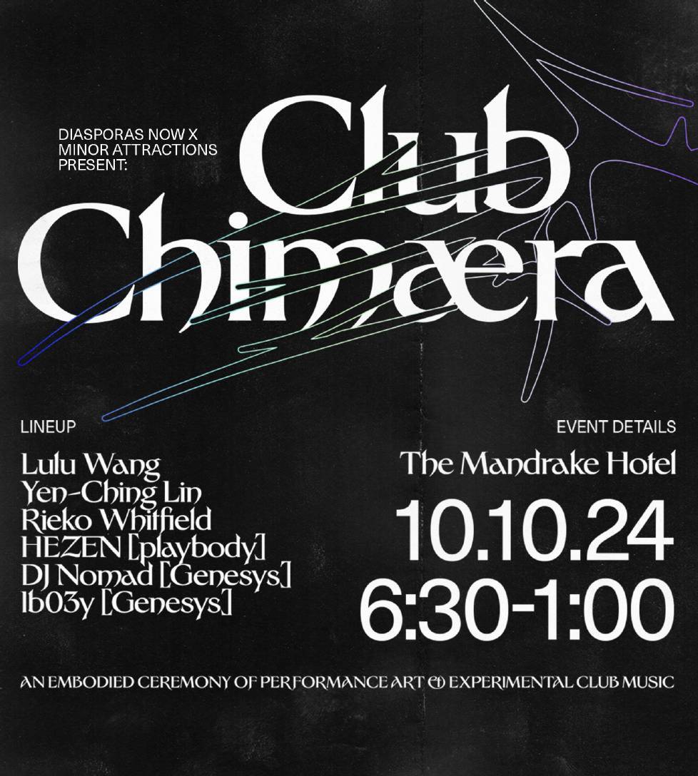 Step into the heart of Fitzrovia’s Mandrake Hotel, and you might just find yourself in the midst of Club Chimaera – a multi-sensory evening celebrating performance art in all its glory. Presented by Diasporas Now and Minor Attractions for Frieze Week, from 6:30pm-1am you can join Lulu Wang or Yen-Ching Lin in their drawing and improvisation workshops. On top of that, there will also be live DJ sets by Rieko Whitfield, Playbody’s Hezen, Genesys’ DJ Nomad and Ib03y. Freya Goodchild-Bridge