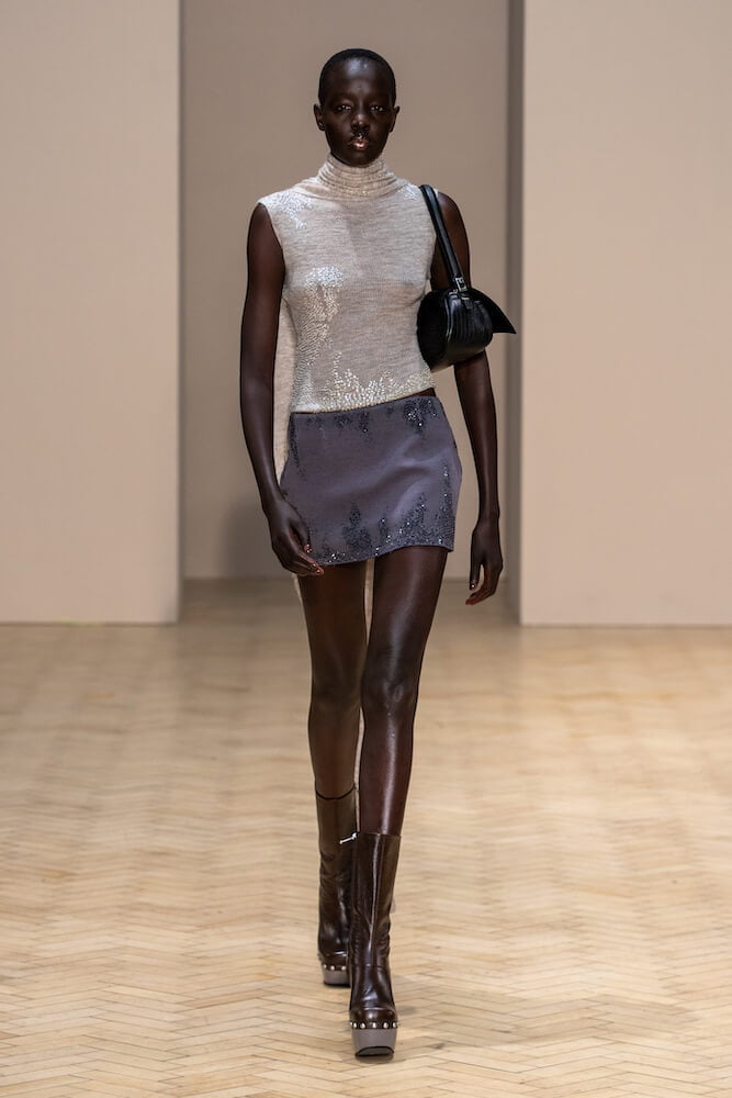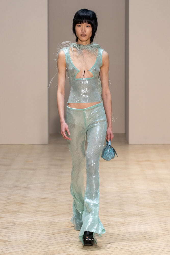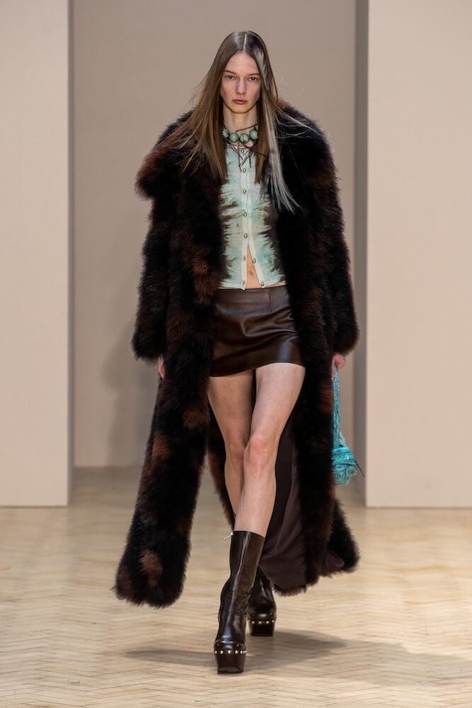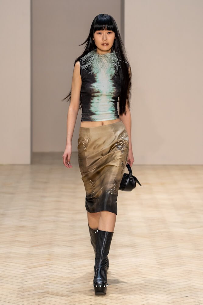 Really special were the hand-treated and dyed feathers unearthed from the label’s archive and concocted by Kikka herself before her passing, paired with low-slung micro-mini skirts and skin-tight vests.