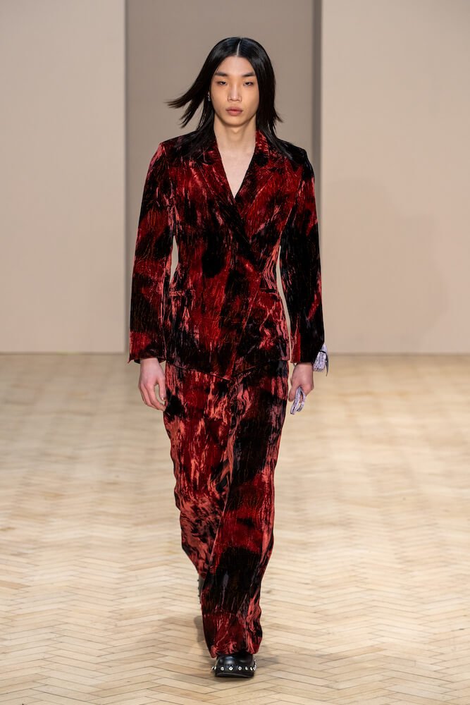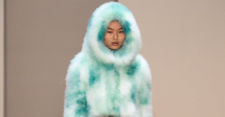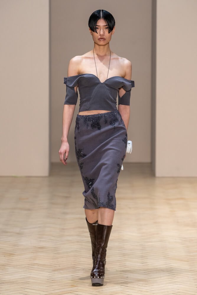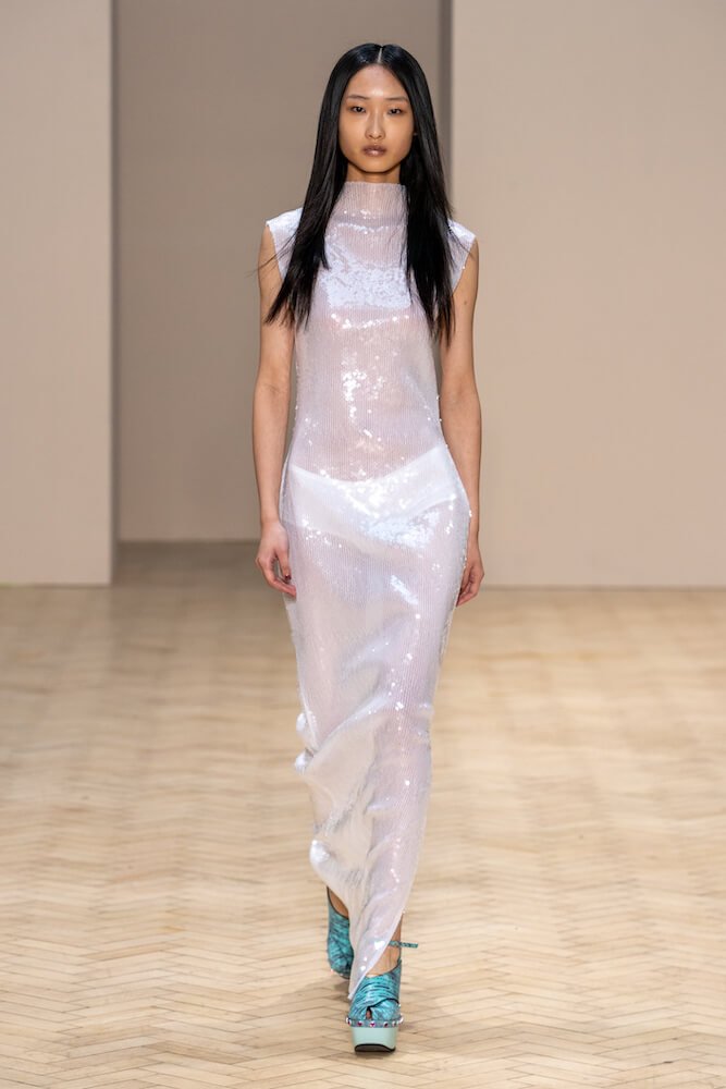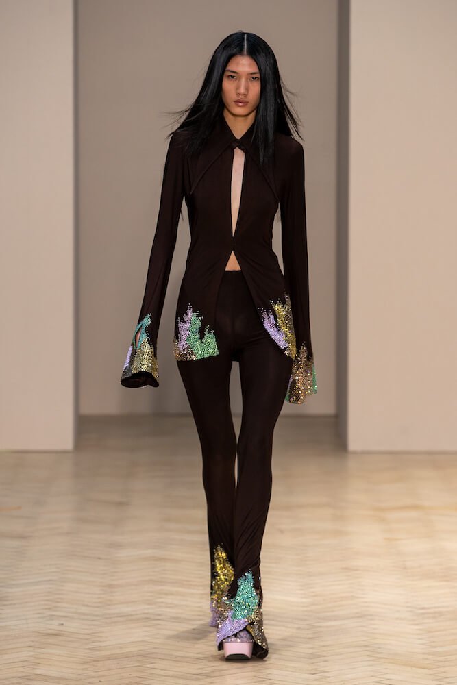 From the very start, Kikka’s peerless style came through in the floor-length monster-marabou coats, the wet-look feather scarves, the furry bucket hats and the waistcoats. Recognizable as ‘so her’, sky-high platform clogs and tailored razor-sharp shoulders were intrinsically glamorous. Dripping with fluid glitter detailing, crystals fell like tears across slate-grey gowns, exceptionally cut and tailored – each garment named after a star.
