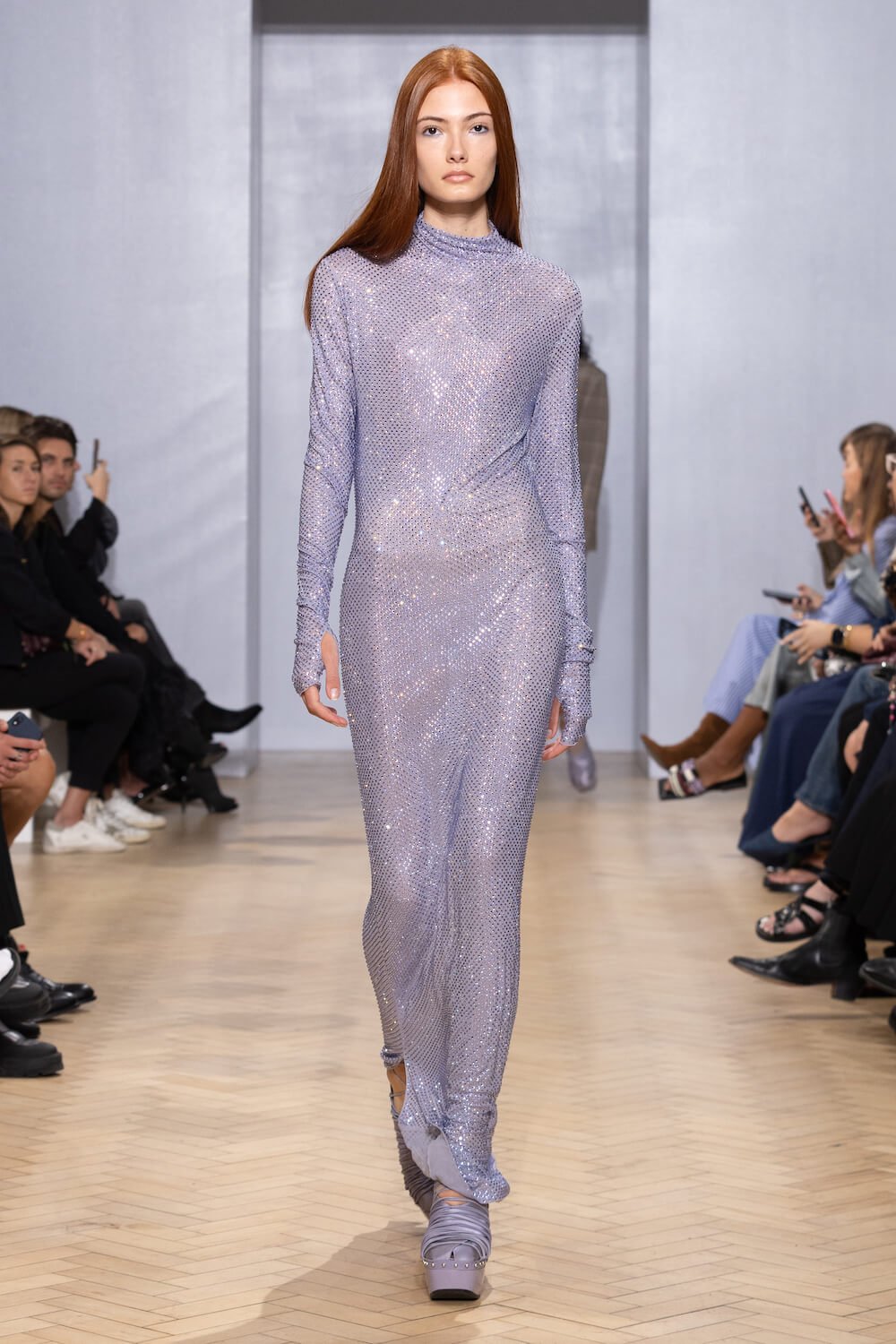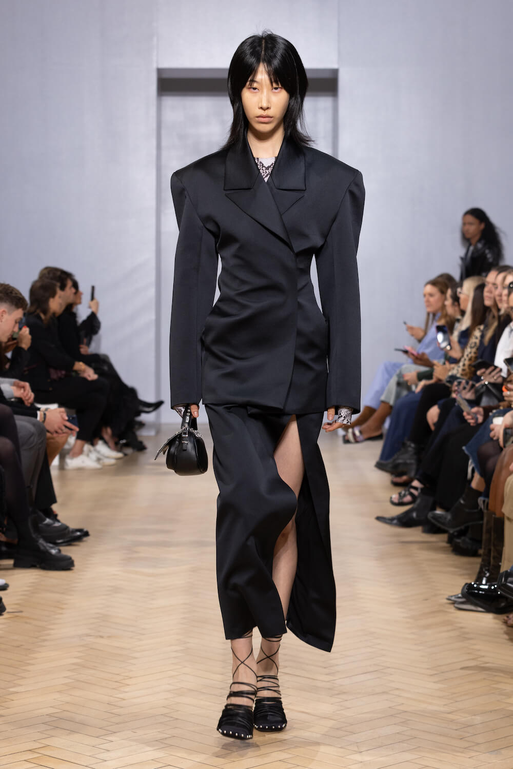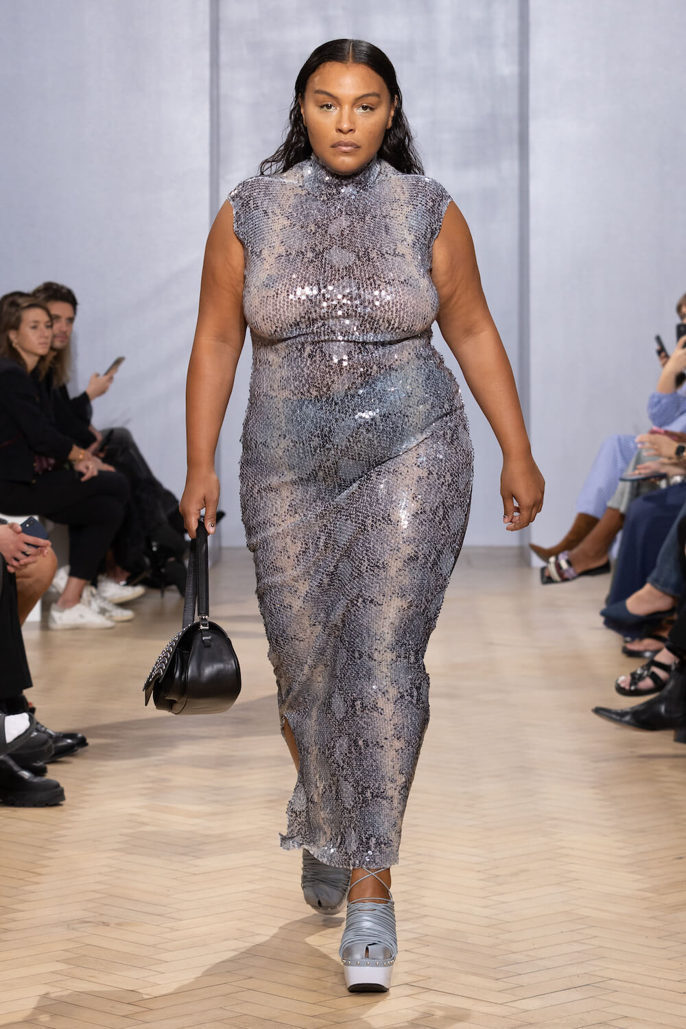 But it wasn’t all love and light, black-on-black looks added a touch of Lydia Deetz’s gothic glamour to the offering, paired with sinister sky-high platform clogs decorated with studs, grommets and gladiator straps.