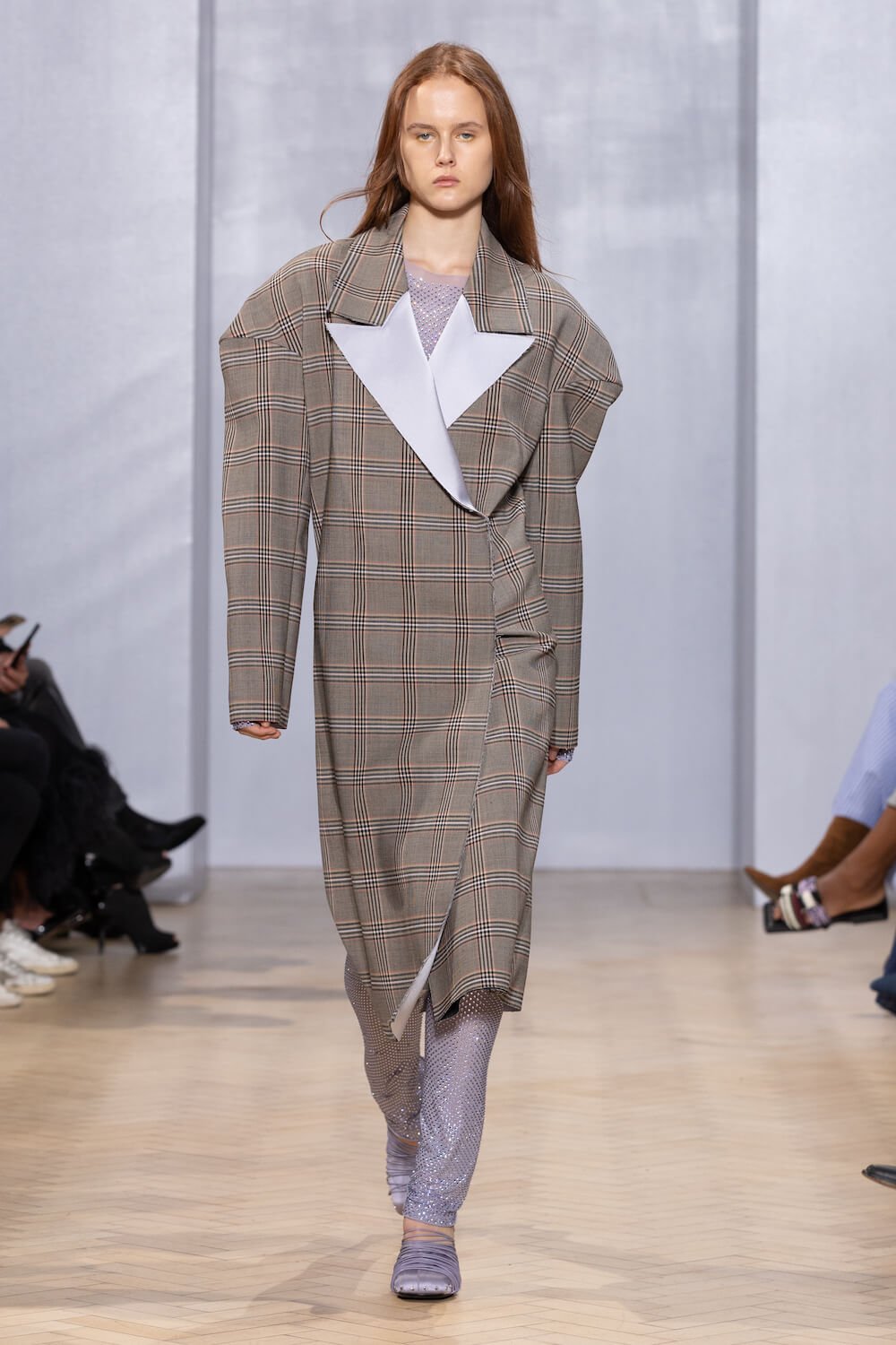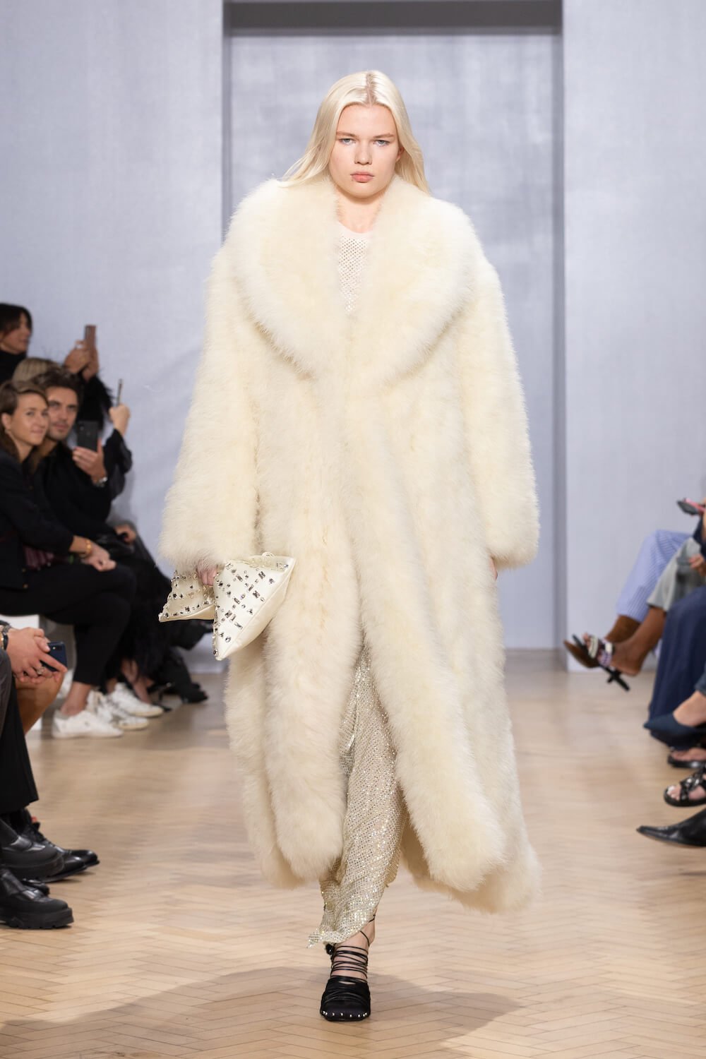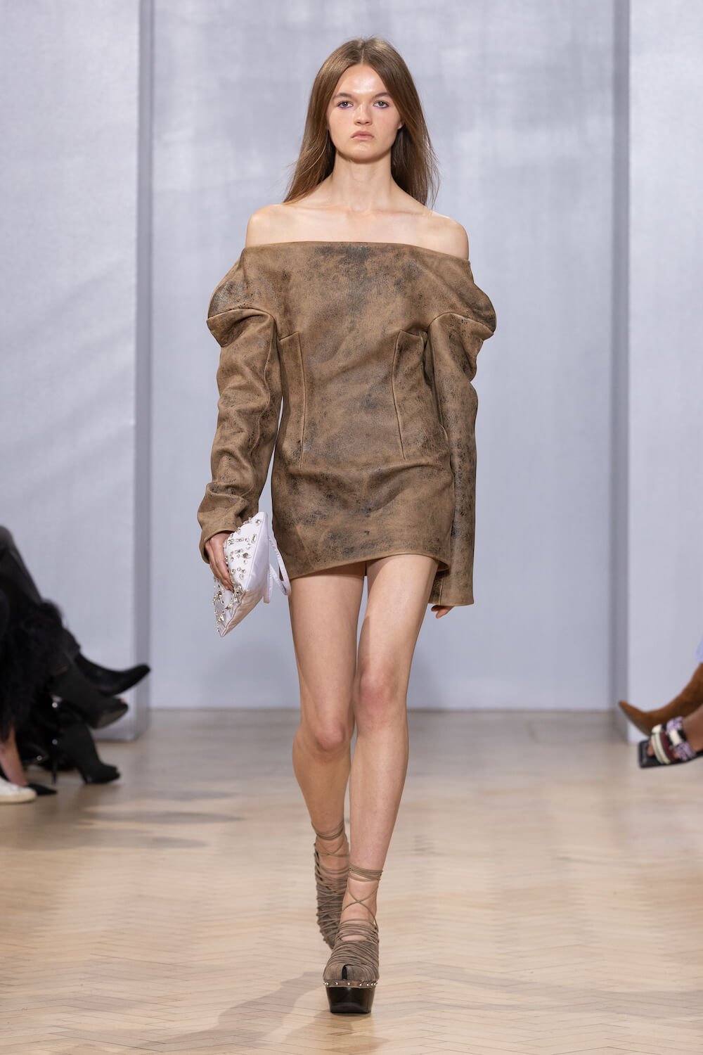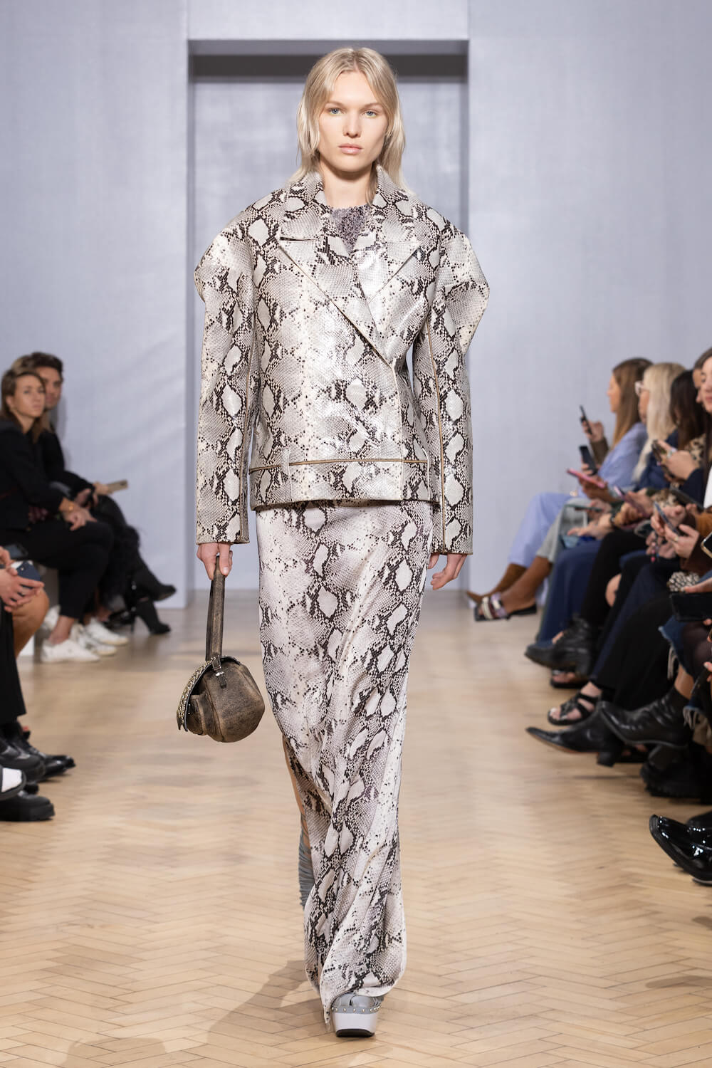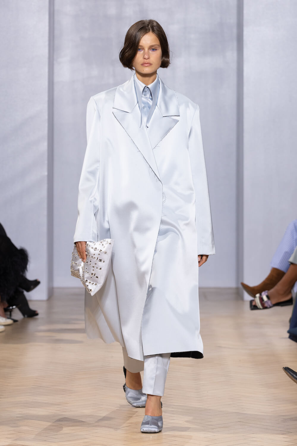 Spacious, strapless slips – with pockets! – were coated in Swarovski crystals and counterposed by marabou faux-fur coats, python prints and rugged-look leather. Minimalistic outerwear was exceptionally cut and tailored from raw-edged silk satins too, with sharp power shoulders and floor-skimming hemlines.
