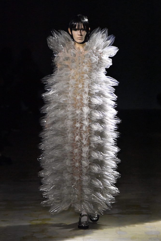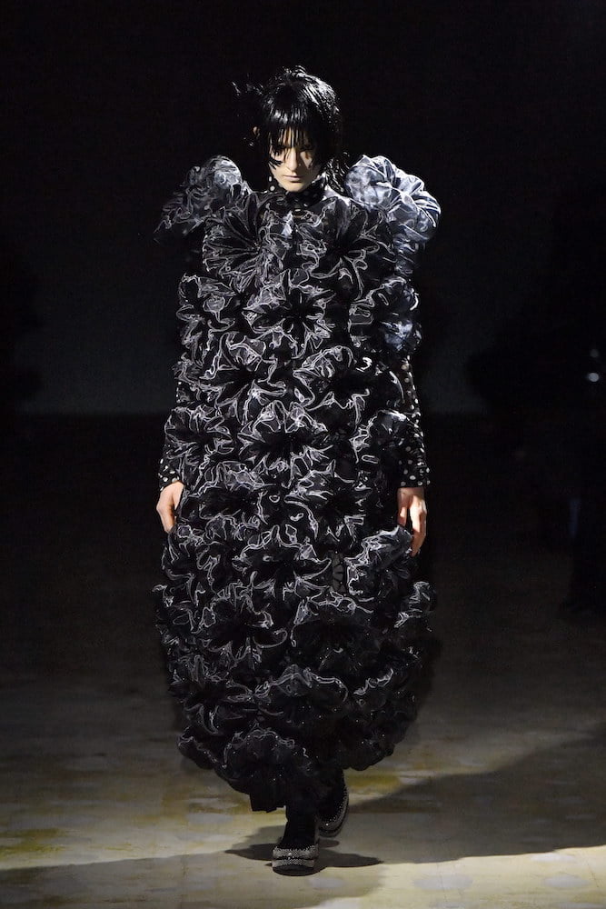 Organza concoctions kept in spirit with Ninomiya’s gothic side, paired alongside polka-dotted dresses which had an air of Comme and a spikey puffa jacket which appeared like a cluster of outlandish matter – all worn alongside the brand’s latest collab with Church’s. You could call it escapist fashion, though Kei Ninomiya’s protective layers couldn’t feel more attuned to reality.