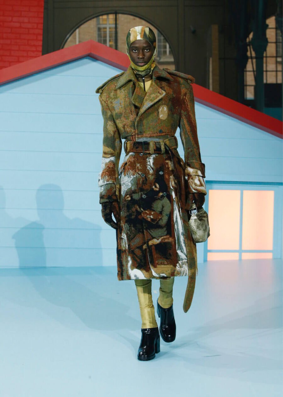 There was the drama of a new hourglass tailored silhouette, the inventiveness of bags shaped like takeaway meals and bouquets of flowers and the crafted virtuosity of the all-over tapestry pieces which were renditions of paintings by Gustave Courbet and Giorgio de Chirico. Playful varsity jackets were embellished with cartoon characters, veiled lace ‘bridal’ baseball caps brought an air of romance to the show as did the heavenly presence of three lace-winged angels in the model line-up. At the end, the whole design studio took a bow on the catwalk and hugged each other as the orchestra played. It was Virgil’s last show but not the end