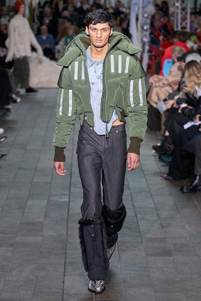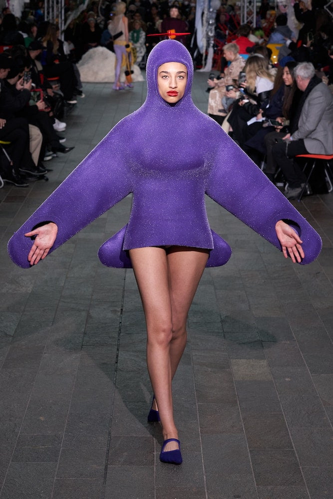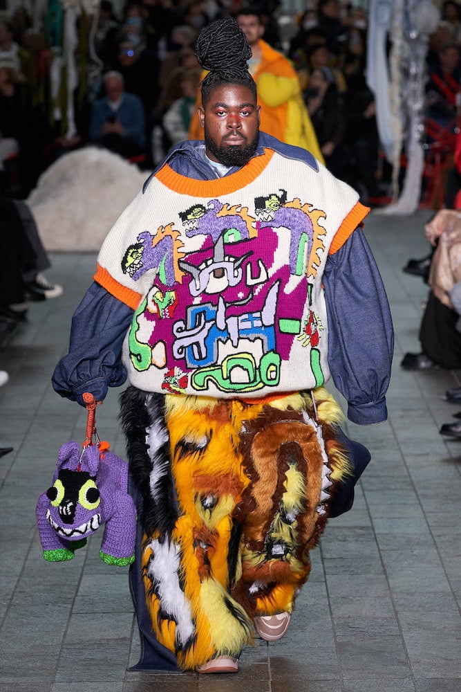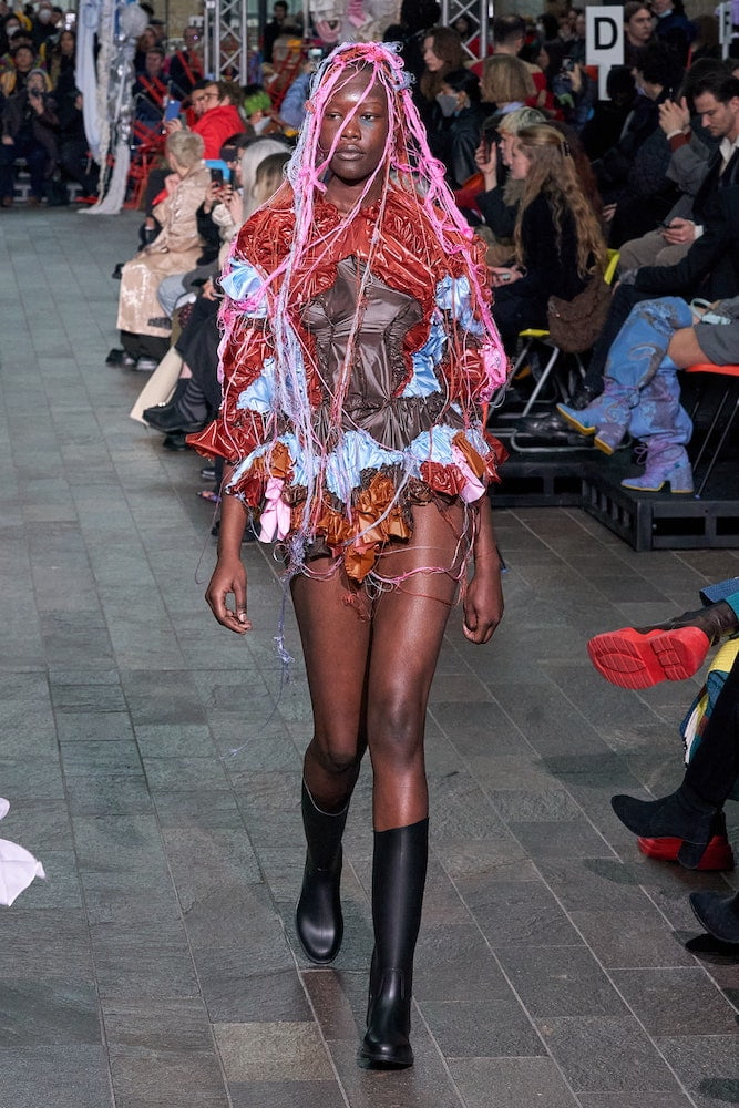 Elsewhere, James Walsh turned miscellaneous objects into crampy fashions, be it an aeroplane mini dress with an automatic propeller or a chihuahua toy baguette bag, and Charlie Constantinou made puffer fabric look like melting lava. The elevated men’s staples of Aaron Esh looked instantly shoppable, walking alongside the torn-up party garb of Shakila Thebe and the queered couture of Joe Pearson’s boys, with elegant bundles of fabric covering his models’ bits and bobs in all the right places.