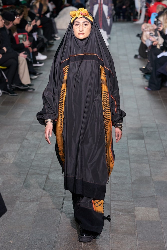 A name to keep an eye on is Kazna Asker, who was the first designer to have a hijabi collection featured in the MA CSM show. She fashioned traditional dress out of sportswear fabrics, laden in brash graphics which speak directly to the young, inner-city Muslims who wear trainers and tracksuits with their chadors and kaftans.