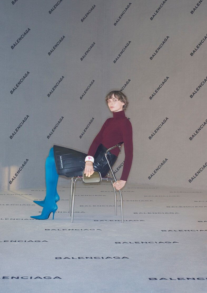 Okay, so the first thing we need to talk about in regards to Balenciaga’s AW17 campaign is the revelation that yes, you can actually sit down in the car mat skirt. Which is good news, because it’s genius, but we did fear it was one of those those fashion “oh no she ain’t gonna be wearing that on the tube” sort of things. Yay. It’s the star of the campaign, the third to be helmed by Demna Gvasalia and this time shot by Johnny Dufort (styled as per, by the brilliant Lotta Volkova). The images have a very… hmm, “who me?! I’m just sitting/standing/crouching on this chair minding my own business” realness to them. Or, in the more qualified words of the house themselves: “the series portrays a viewpoint specific to creative director Demna Gvasalia: the attitude that embeds his ideas about fashion in real life observation and the co-option of the surprise of the ordinary.”