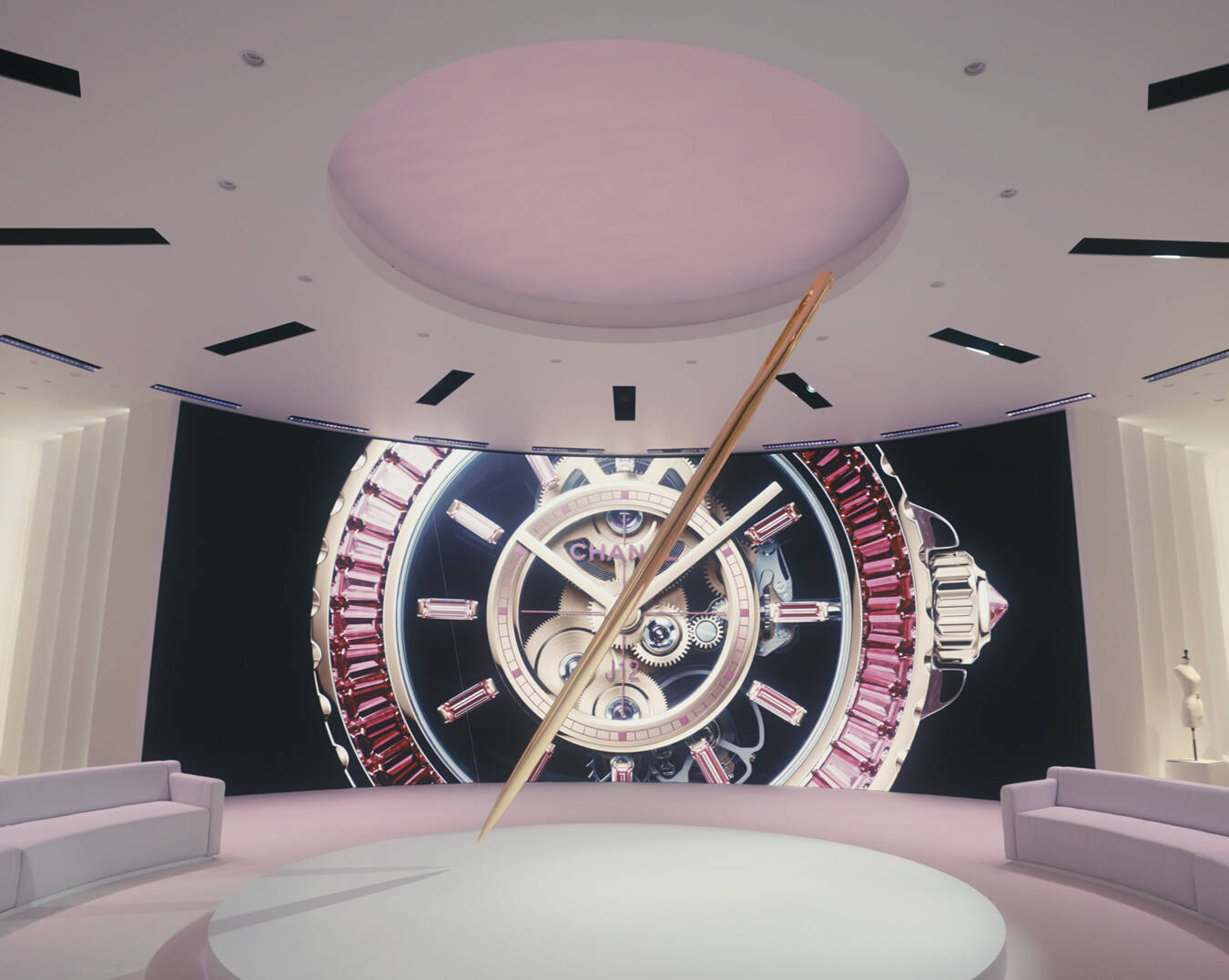 the curved pink structure that housed the latest Chanel Haute Horlogerie creations