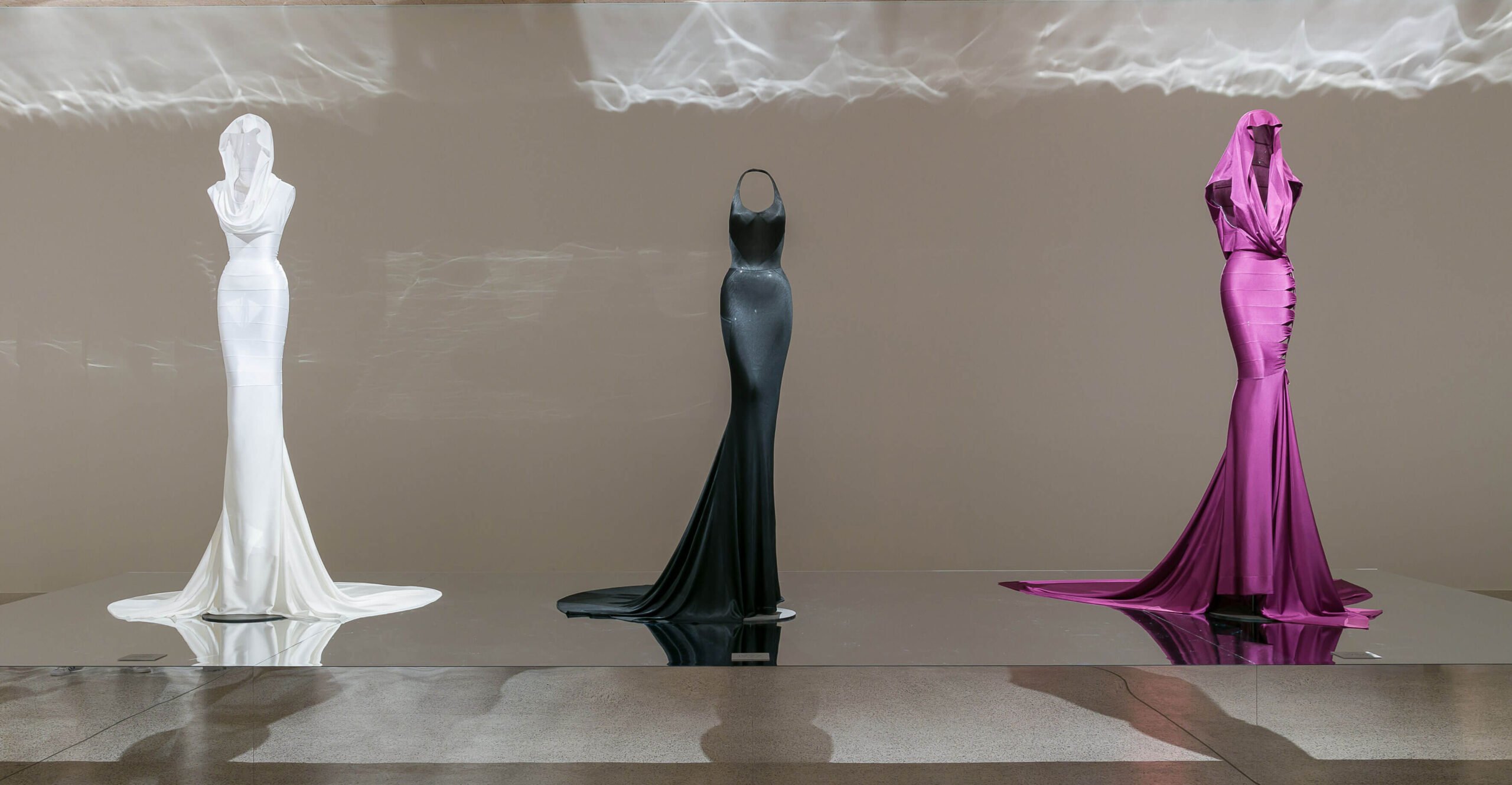 Black silhouettes stand tall together, coven-like and sleek, the chicest plunging gowns, so perfectly tailored, cinch those waists in, panther-esque. The way Alaïa sculpted a woman’s figure was the epitome of expert workmanship, his technique unrivalled. Even in those dark, wild, leather bondage-like pieces, his brilliance glints in flashes of yellow and emerald beads, his humour evoked so slyly in his creations. A velvet dress dripping in blood red and a midnight black glinting in the light sit amongst the exhibition that is divided by specially commissioned artworks by Ronan & Erwan Bouroullec, Konstantin Grcic, Marc Newson and Kris Ruhs. Rihanna’s fire engine red hot Grammys dress in all it’s cascading sheer fabulousness is there, but honestly we see Rihanna in any of these Alaïa pieces. For fearless women. Unapologetic. The lineup of the bandage and hooded dresses dominate this world, the Supremes, in their wrapped forms slicked to the skin so skilfully. We could talk for hours about every piece but we won’t. One must see for oneself. Alaïa’s heart is in all of these pieces, his genius transcends time, that quiet mystery and total understanding of what women want to wear is sensed so deeply. As he once said: “My obsession is to make women beautiful. when you create with that in mind, things can’t go out of fashion.” There’s a glamour and knowingness felt so powerfully in every Alaïa piece here. For women who rule their own worlds.