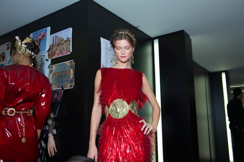 There’s something of one of those old films about ancient Rome in the SS14 Dolce & Gabbana collection. You know, the ones they play midweek on Channel 4, around noon. The ones that start with some idyllic vision of ancient times in black and white, surrounded by a fresco of pale blooms. There are fresco prints on the dresses – on the columns, too. A voiceover starts and the screen slowly fills with colour. “Welcome to ancient Rome,” it says. Or something like that. Then a technicolour panorama of an ancient temple on the water, cutting to Cleopatra in a milky bath, reaching for a loofah. On her head is a gold star, resembling (ever so slightly) a lace doily. But less lacy. More Lurex. “This is Cleopatra,” says the voiceover. “The fabulous Queen of the Nile, whose only resemblance to an iceberg is that no more than one-tenth of her is visible, while nine-tenths, and the better part of her, is beneath the surface. Fate has decreed that the mighty leader of the Roman Empire and Cleopatra should be flung together into the melting pot of history.” Fate also seems to have decreed that that, a few hundred years down the line, they should be flung together by Dolce & Gabbana. Except that they did not slip on Cleopatra’s loofah and plunge headfirst into her bath. Which means that we will never know what she was wearing beneath that milky surface. I like to think it was Look 9: not only is it appropriate for swimming but it also gives the wearer an air of ancient, regal statue, covered in climbing, intertwined blooms. Instead, they looked to history. To Sicily. And Ancient Greece. To 750 BC, when the Ancient Greeks first settled in Sicily. And while it’s true that Cleopatra ruled Egypt, she was of Greek origin and had children with two Romans, so you could say that there’s a vague historical link, from vaguely the same period, but seeing as this is fashion and not a history lesson, historical accuracy is not high on my list of concerns. Take, for example, the dress from Look 28. It’s made of gold coins. Is there anything that could pay better tribute to a mighty leader of the Roman Empire, maybe Julius Caesar, and the last pharaoh of Ancient Egypt? Caesar once had his profile on a gold coin, whereas Cleo liked to dress in gold and enjoyed riches, as any pharaoh would. After all, she killed several siblings to get where she did, so why not enjoy the fruits of her sacrifice? Why not celebrate the things you enjoy via fashion? It’s rumoured that she also had a rather wide nose. One to rival Caesar’s. Which begs the question, is it Caesar or Cleo on the Dolce coins? Or is it like one of those weird Magic Eye things, where if you look at it from one angle you see Caesar, but from another you see Cleo? What better way to pay tribute to a queen and the island from which you hail?