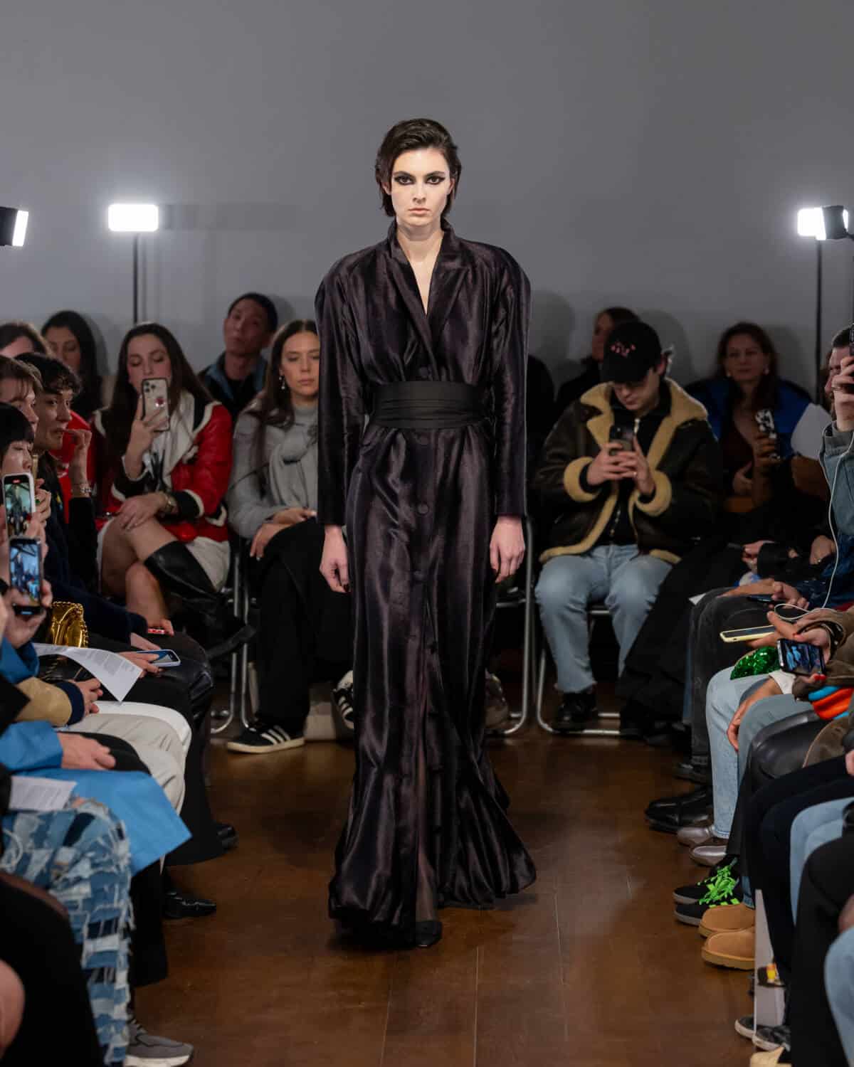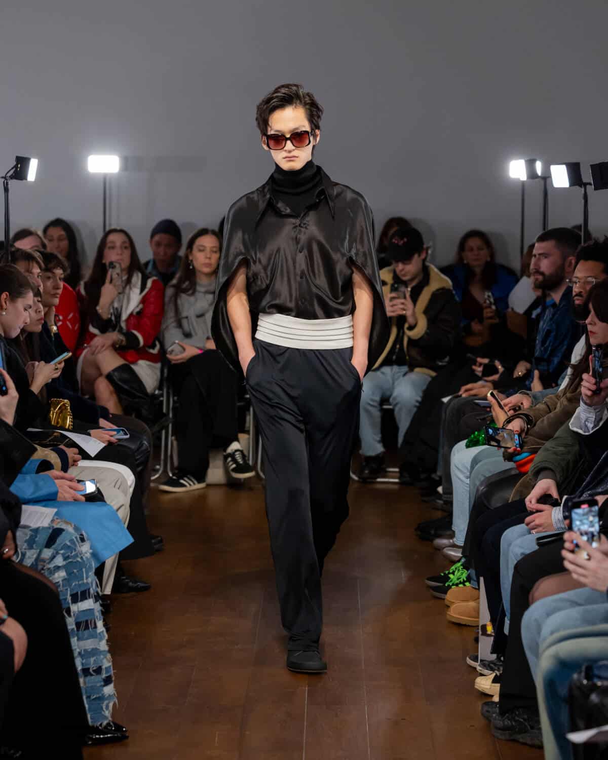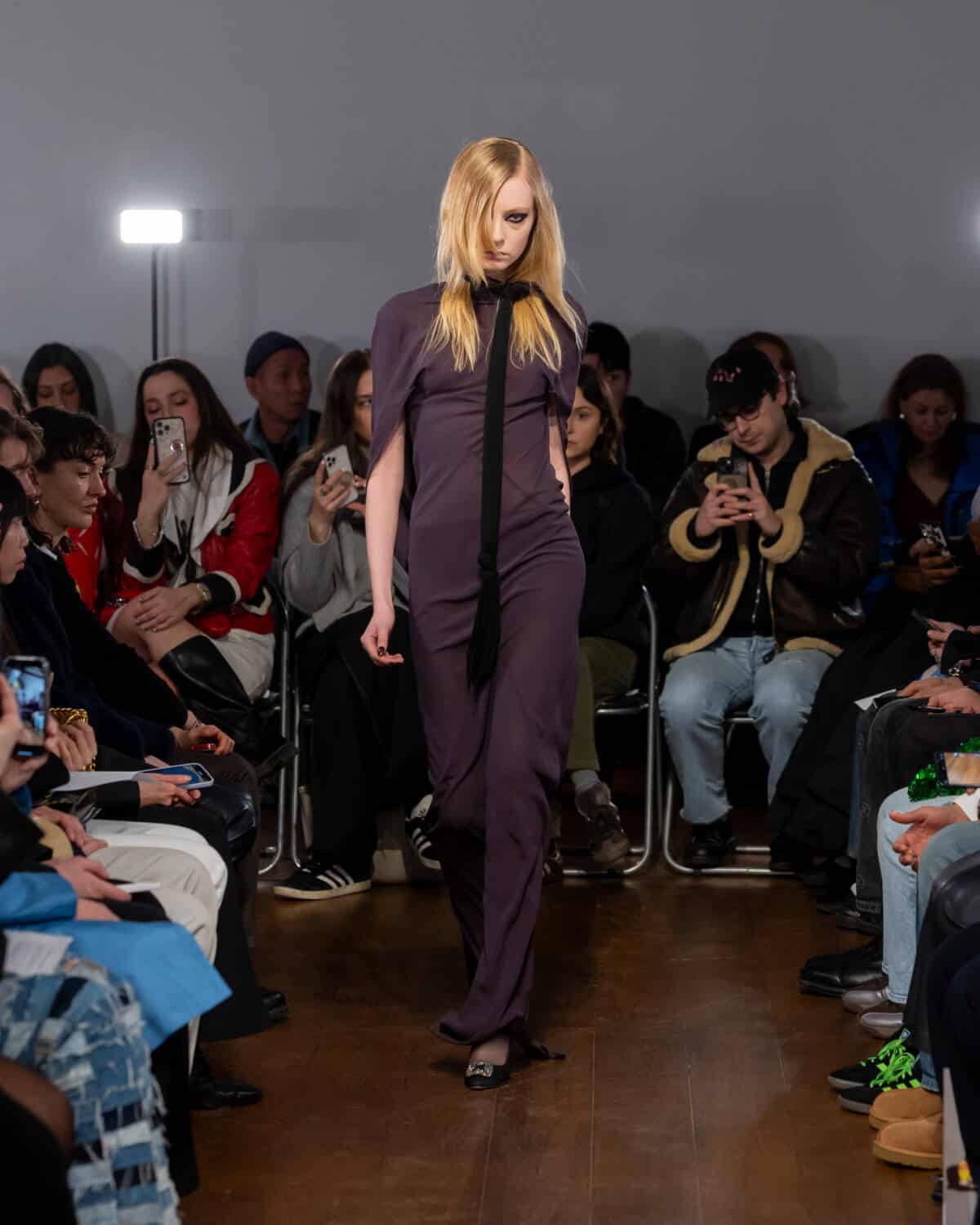 Following his London Fashion Week debut in September, Aaron Esh brought the fash pack to the Sarabande Foundation in Haggerston – which offers studio spaces to emerging talent, like Esh, at subsidised rates – for his intimate sophomore show. There’s a lot of excitement around the rising star, whose elegant designs feel on par with the craftsmanship shown on the runways of Milan and Paris. But Esh is a born and bred London boy, and the glow of the city informs his practice entirely. In creating the collection, he was thinking about beauty in banality; the flickers of inner-city glamour you see day-to-day. Like the girl walking home from the club down Kingsland Road at 5am in floor-length frock. Or the fashion darling who will save up to buy an Alaïa coat on Vestiaire Collective, but will throw it over a basic hoodie to nip down the offie for a pouch of baccy.