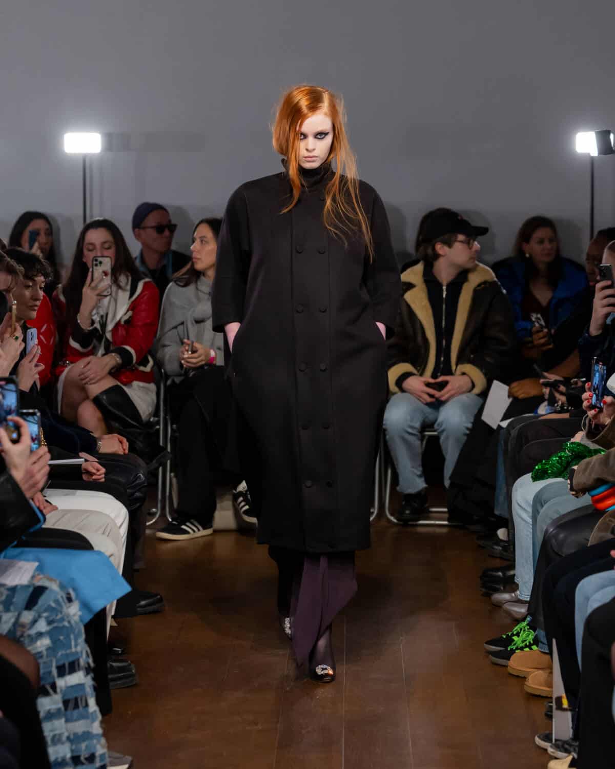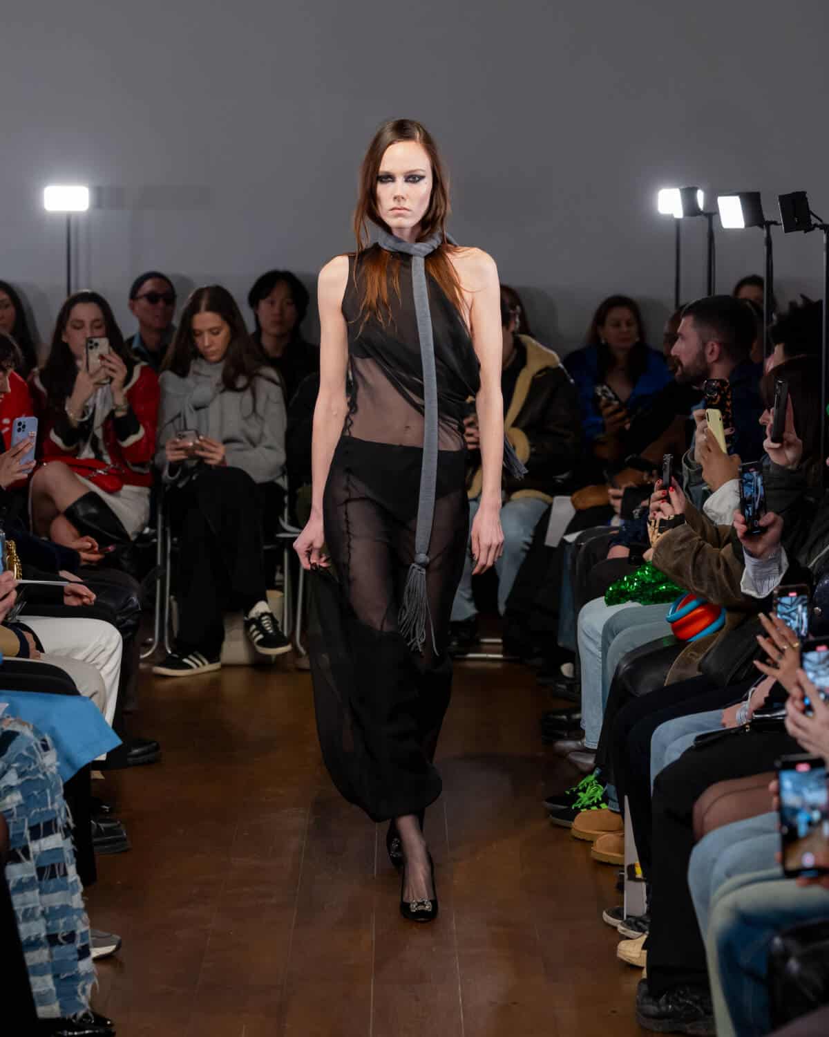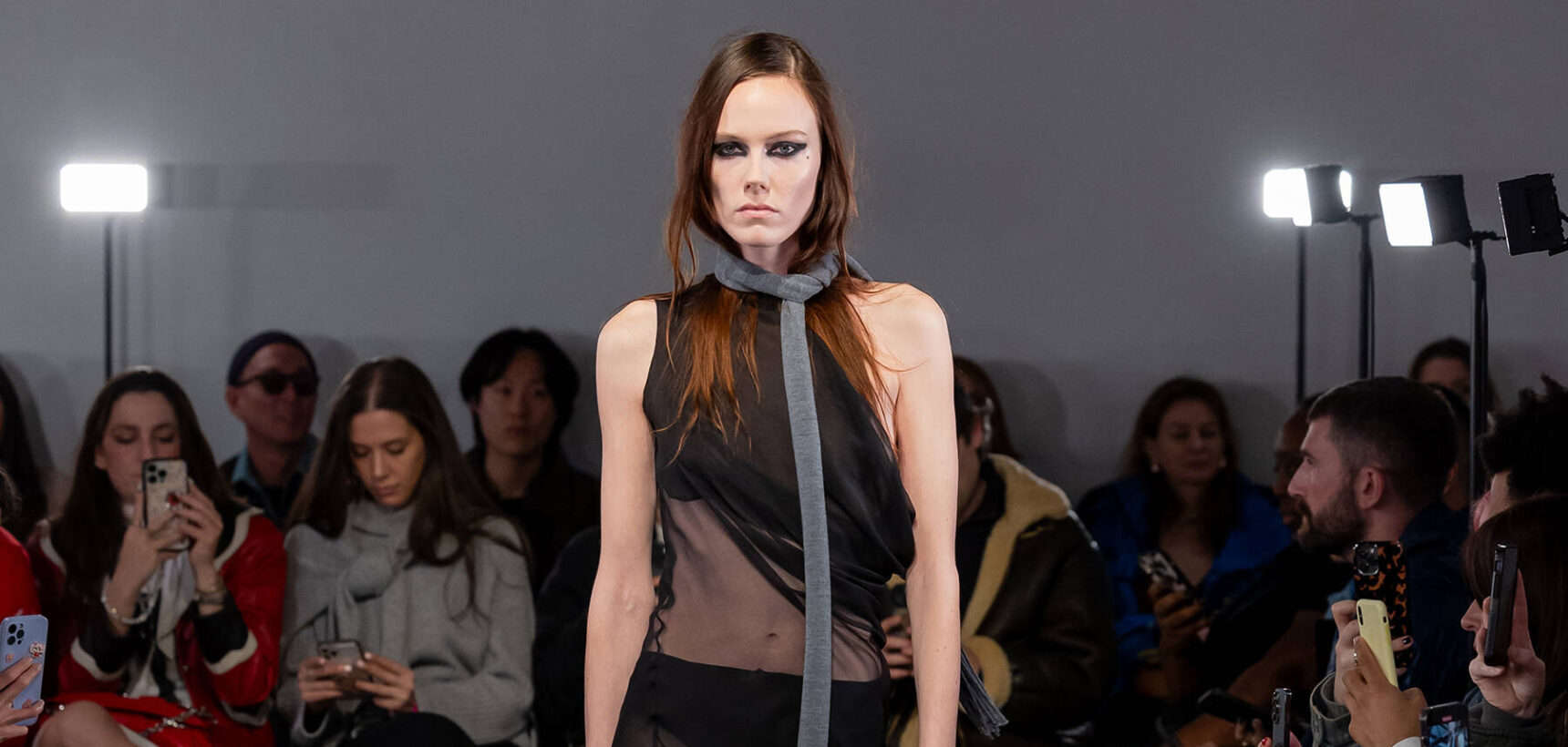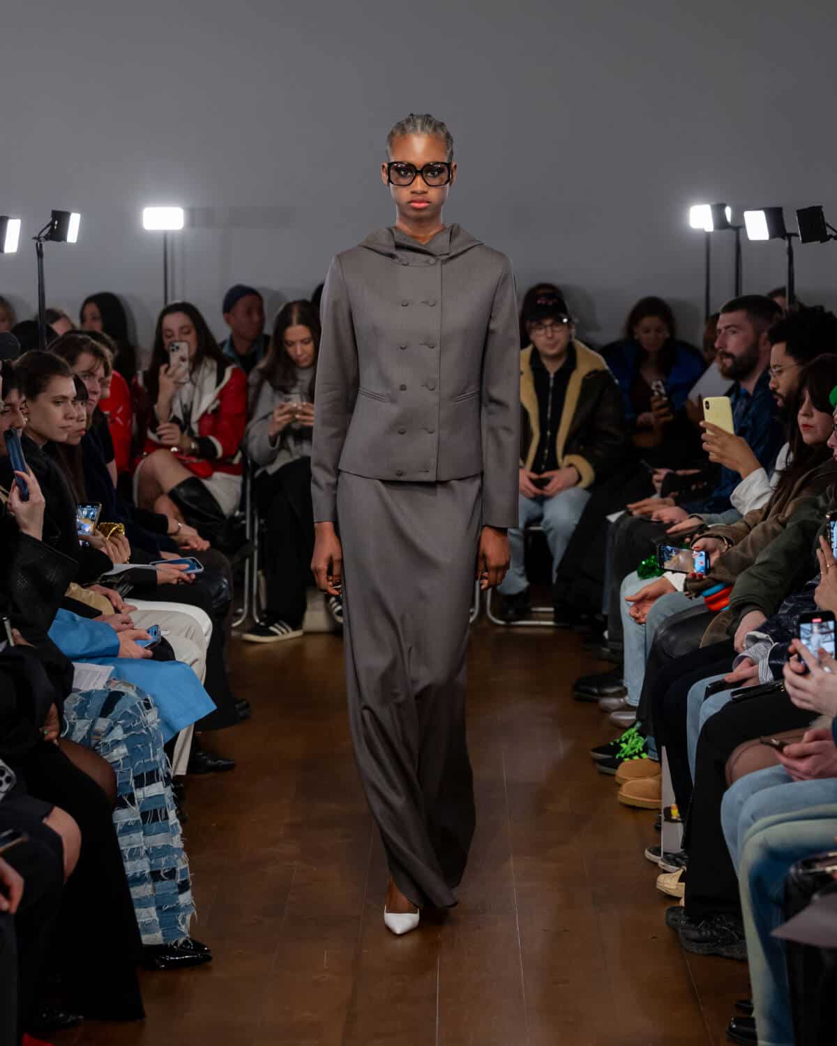 Following his London Fashion Week debut in September, Aaron Esh brought the fash pack to the Sarabande Foundation in Haggerston – which offers studio spaces to emerging talent, like Esh, at subsidised rates – for his intimate sophomore show. There’s a lot of excitement around the rising star, whose elegant designs feel on par with the craftsmanship shown on the runways of Milan and Paris. But Esh is a born and bred London boy, and the glow of the city informs his practice entirely. In creating the collection, he was thinking about beauty in banality; the flickers of inner-city glamour you see day-to-day. Like the girl walking home from the club down Kingsland Road at 5am in floor-length frock. Or the fashion darling who will save up to buy an Alaïa coat on Vestiaire Collective, but will throw it over a basic hoodie to nip down the offie for a pouch of baccy.