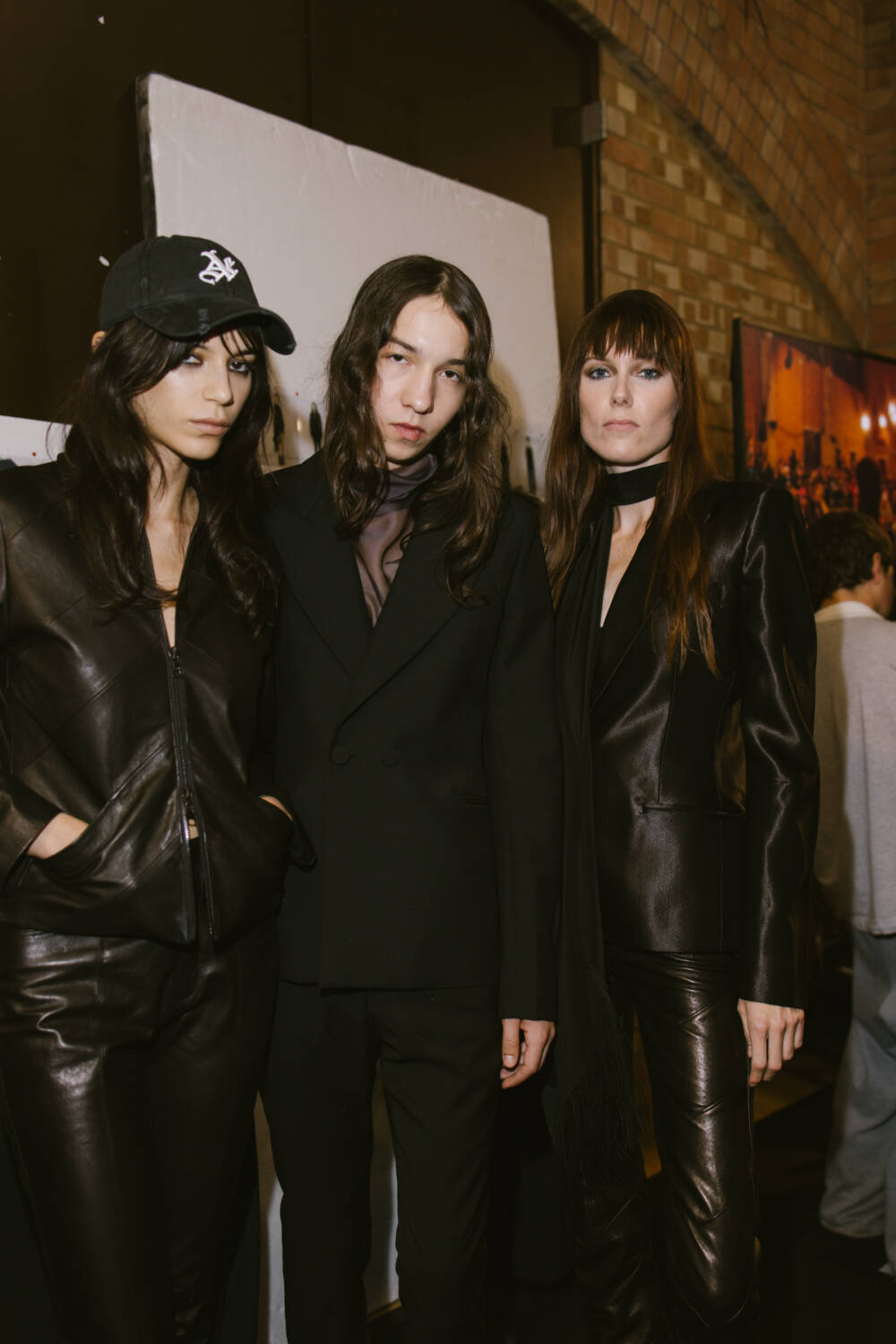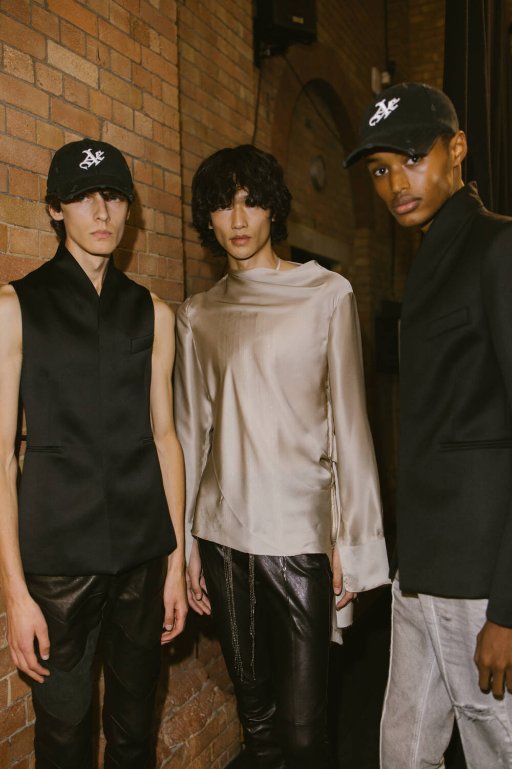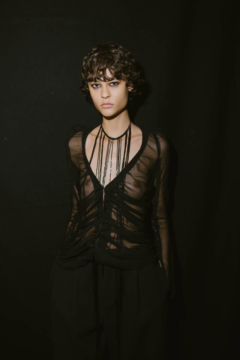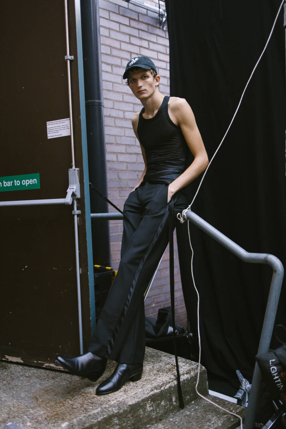In his most elevated outing yet – Esh has recently begun working with legendary stylist Katy England – the designer spoke backstage of admiring the boys you see in Dalston “in the most elevated, sophisticated wardrobe”; those who save up six months to buy their dream Vestiaire finds that they’ll treasure for life. It was all about dressing up and dressing down in a singular notion. Think midnight-blue velvet suit jackets worn with drainpipe leather trousers and indie rocker boots. Or silk blouses with trailing hems paired with frayed baseball caps and morning-after bug eye shades. Add in sculpted blousons, skinny scarfs and casual sheer tanks and you have the ideal wardrobe for all sorts of nocturnal adventures – whether that’s glitzy bars in Mayfair or a dingy club basement in Hackney.