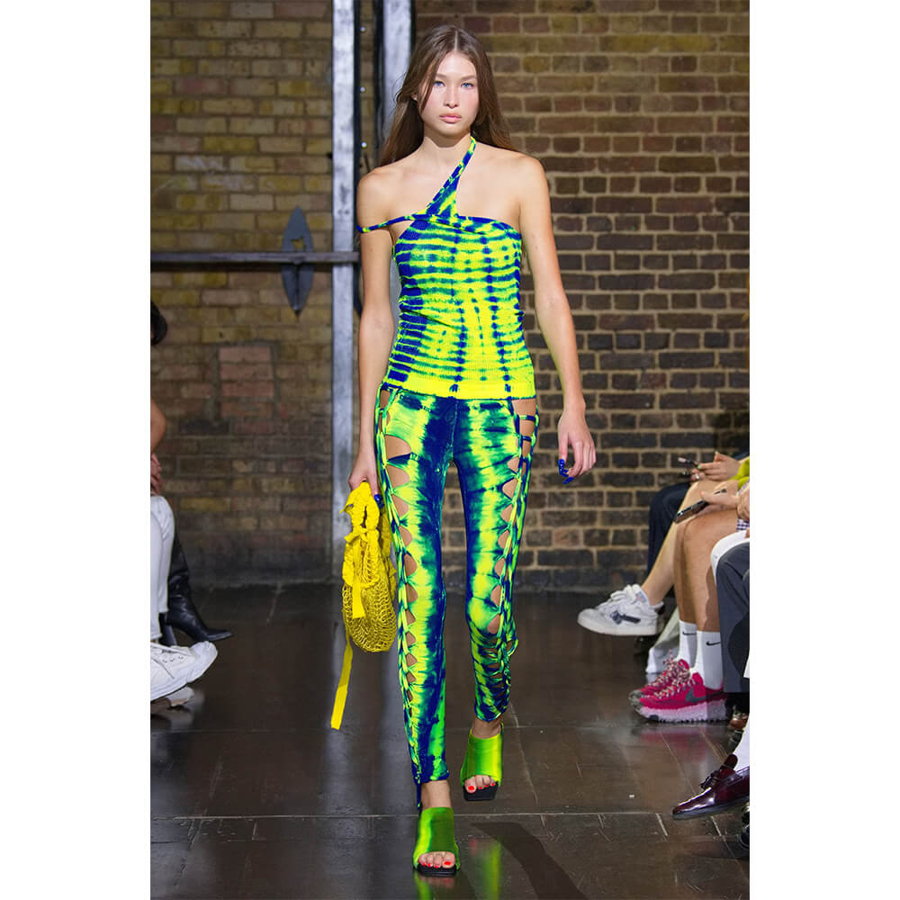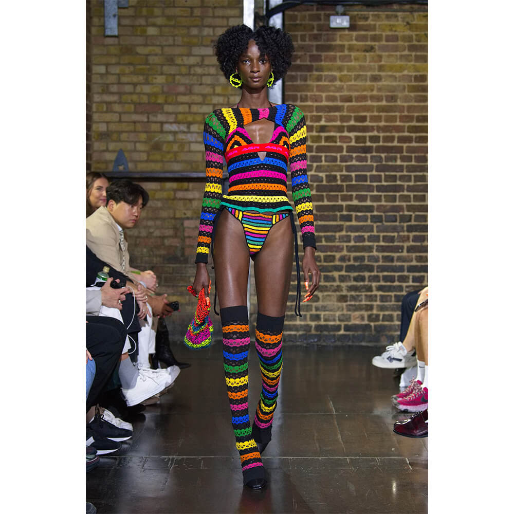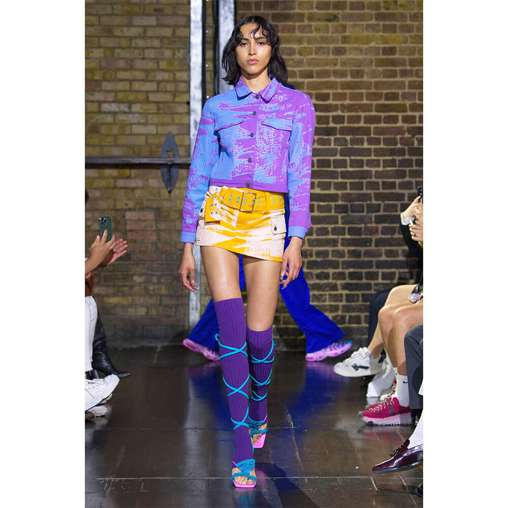 Called Dripping in Colour, Robinson was able to speak boldly through hues for SS23, sending colour-coated models stomping down the catwalk like a gang of groovy late-night city kids-cum-beach party animals. Think recycled denim jogging suits, elastic-knit bodycon dresses, interlinked cutout leggings, screen-printed and tye-dye micro-mini skirts and knitted pointelle lycra tops – each and every garment crafted to evoke joy and promote body positivity. What’s more, the vibrant prints cascading across the catwalk were inspired by Katharina Grosse’s fabric installations as well as references to ’90s sandblasted jeans, glistening swimwear and Sonia Rykiel’s iconic stripes.