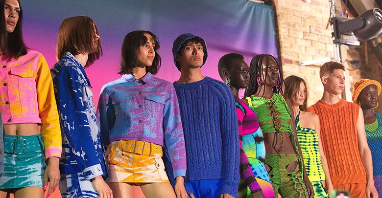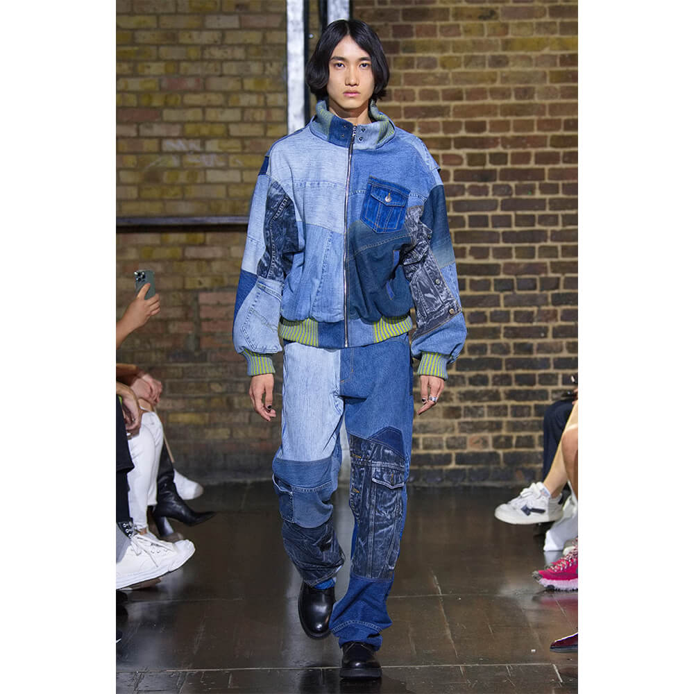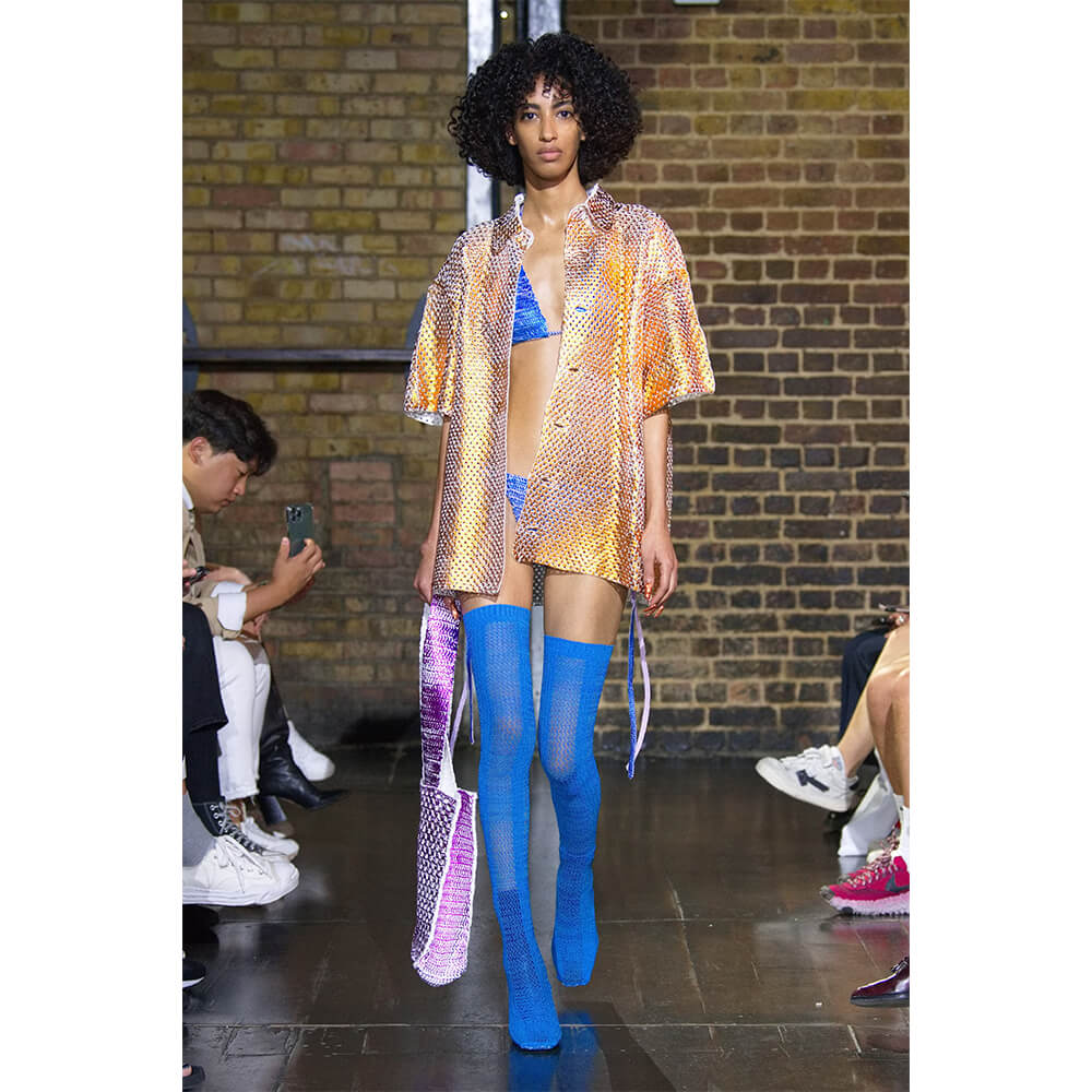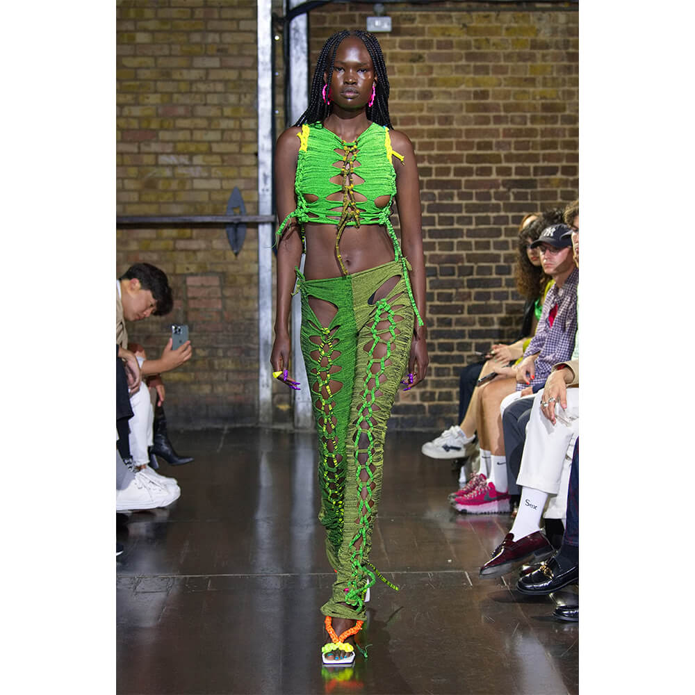 Called Dripping in Colour, Robinson was able to speak boldly through hues for SS23, sending colour-coated models stomping down the catwalk like a gang of groovy late-night city kids-cum-beach party animals. Think recycled denim jogging suits, elastic-knit bodycon dresses, interlinked cutout leggings, screen-printed and tye-dye micro-mini skirts and knitted pointelle lycra tops – each and every garment crafted to evoke joy and promote body positivity. What’s more, the vibrant prints cascading across the catwalk were inspired by Katharina Grosse’s fabric installations as well as references to ’90s sandblasted jeans, glistening swimwear and Sonia Rykiel’s iconic stripes.