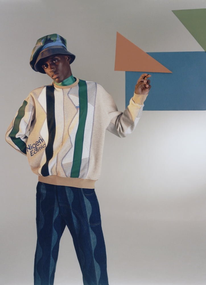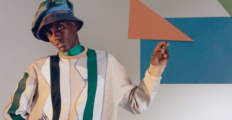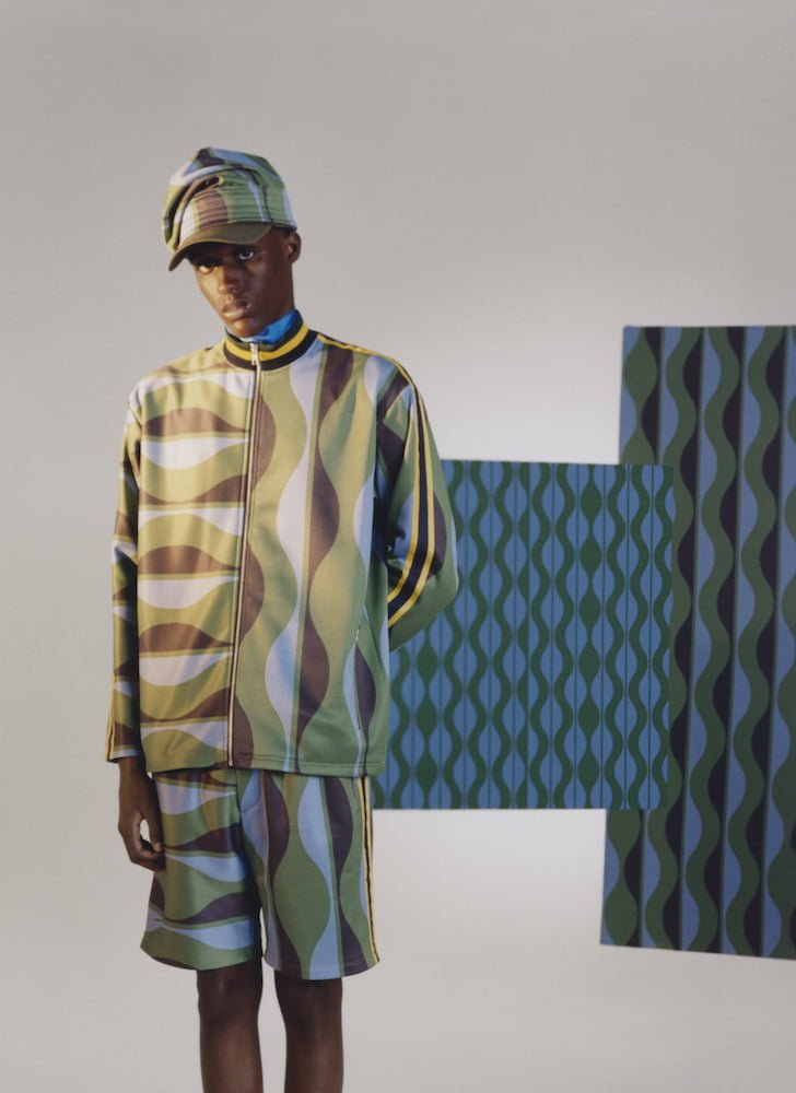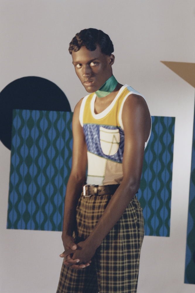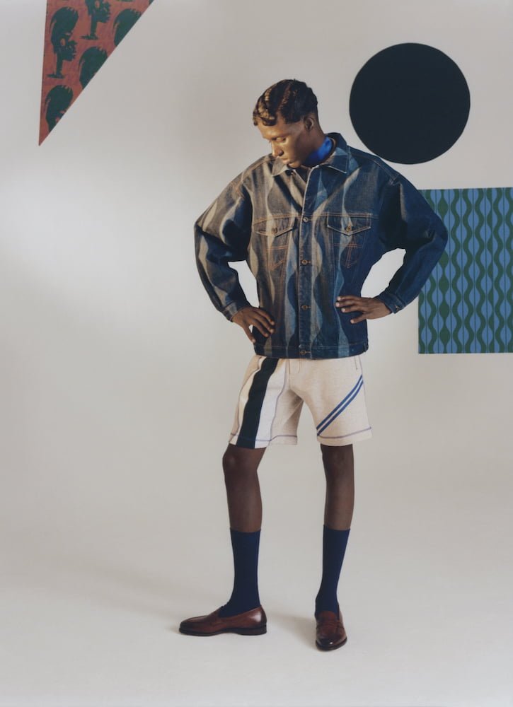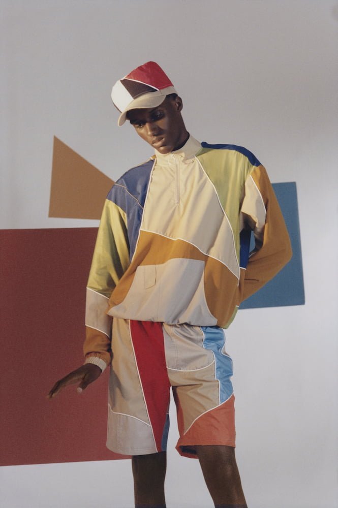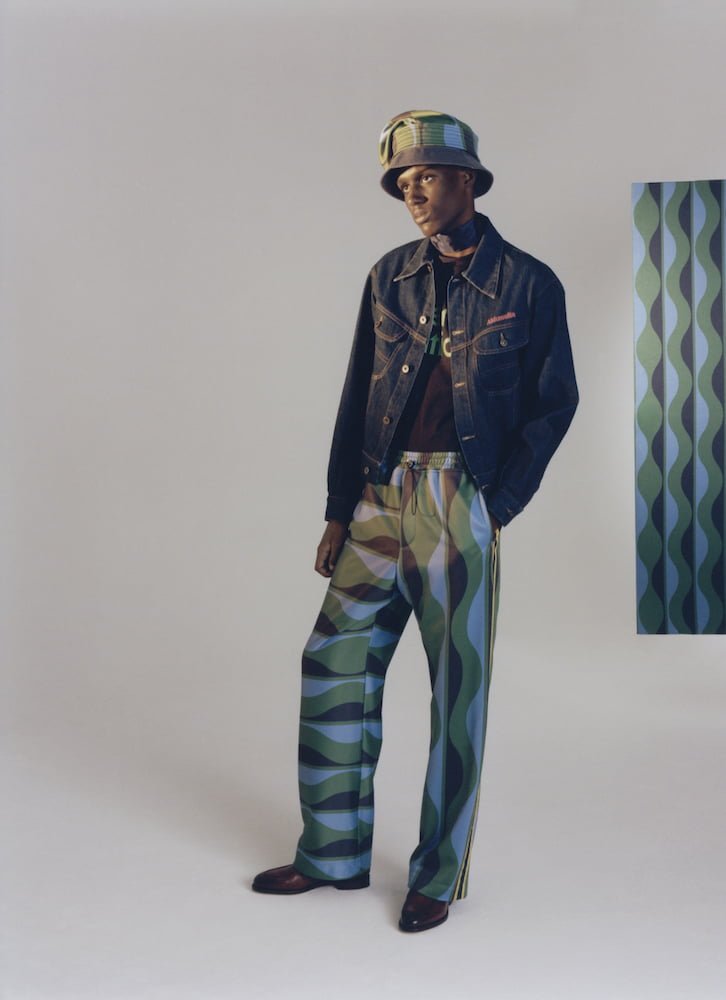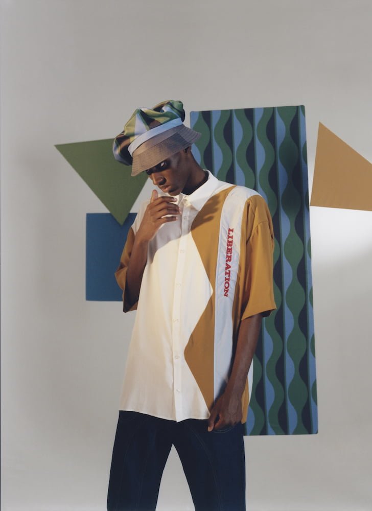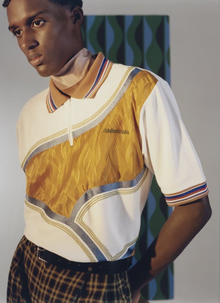 This season’s relaxed silhouettes – layered with various prints and geometric shapes  – are some of Ahluwalia’s strongest looks yet. From strong denim adorned with zig-zag patterns, to spliced-together polo shirts, these are desirable, super wearable pieces with meaning rooted within their seams.