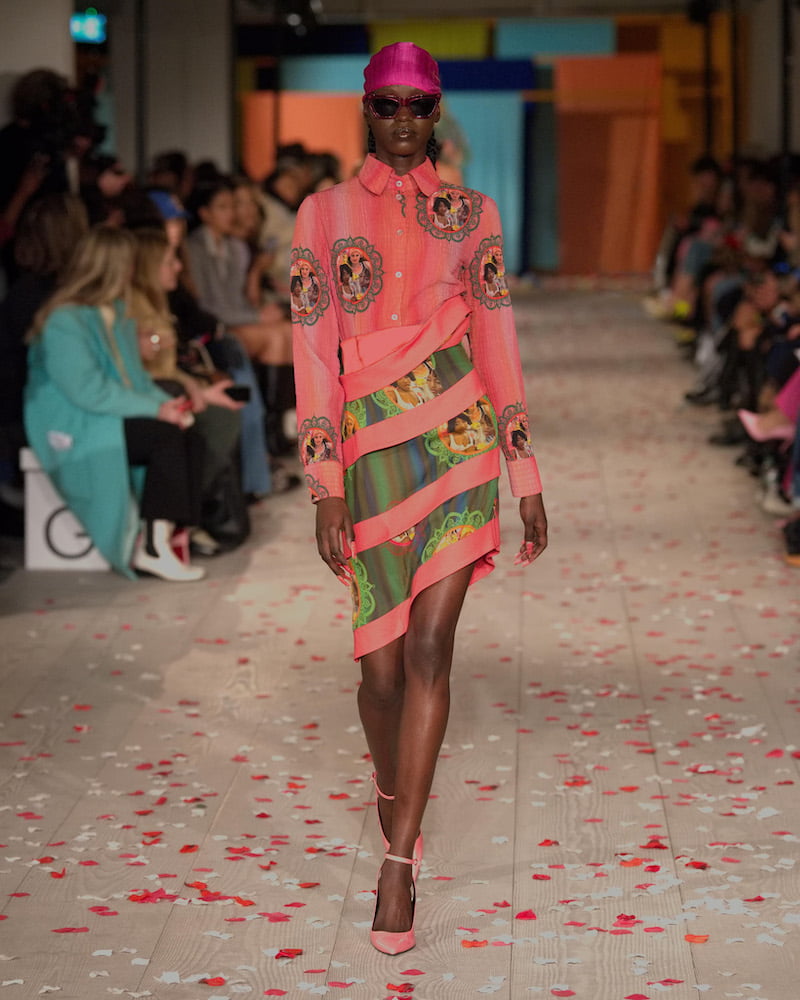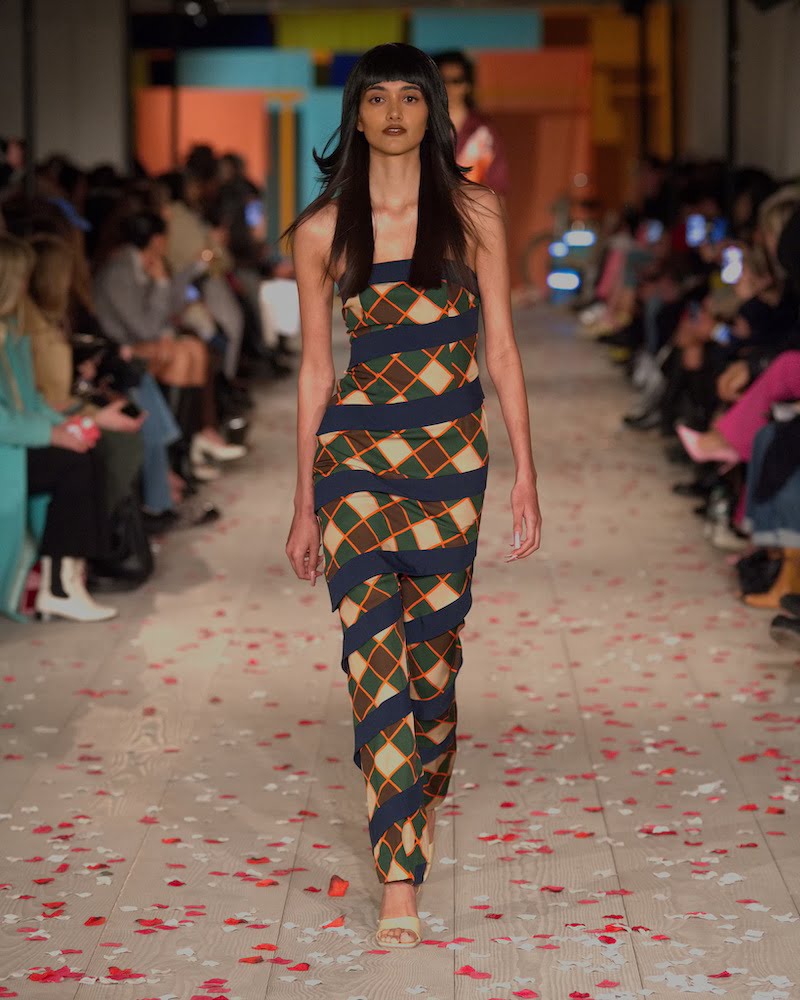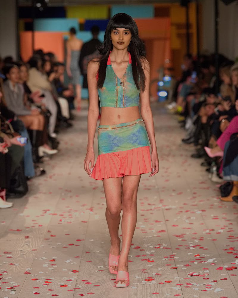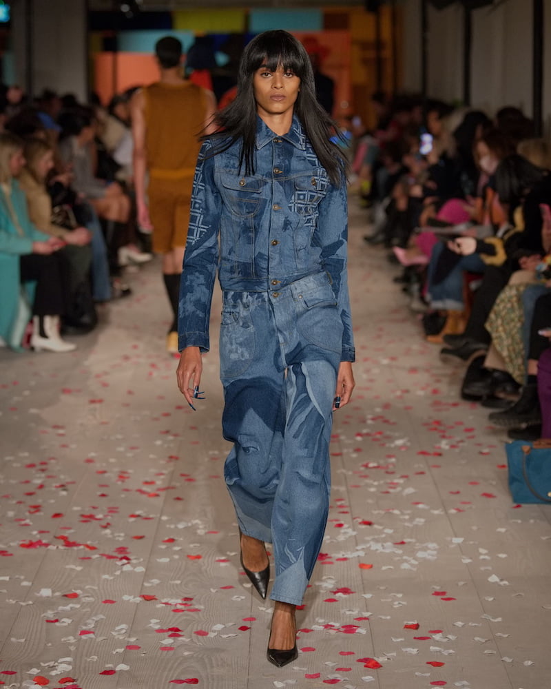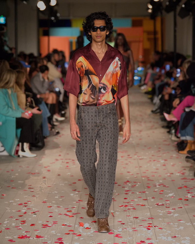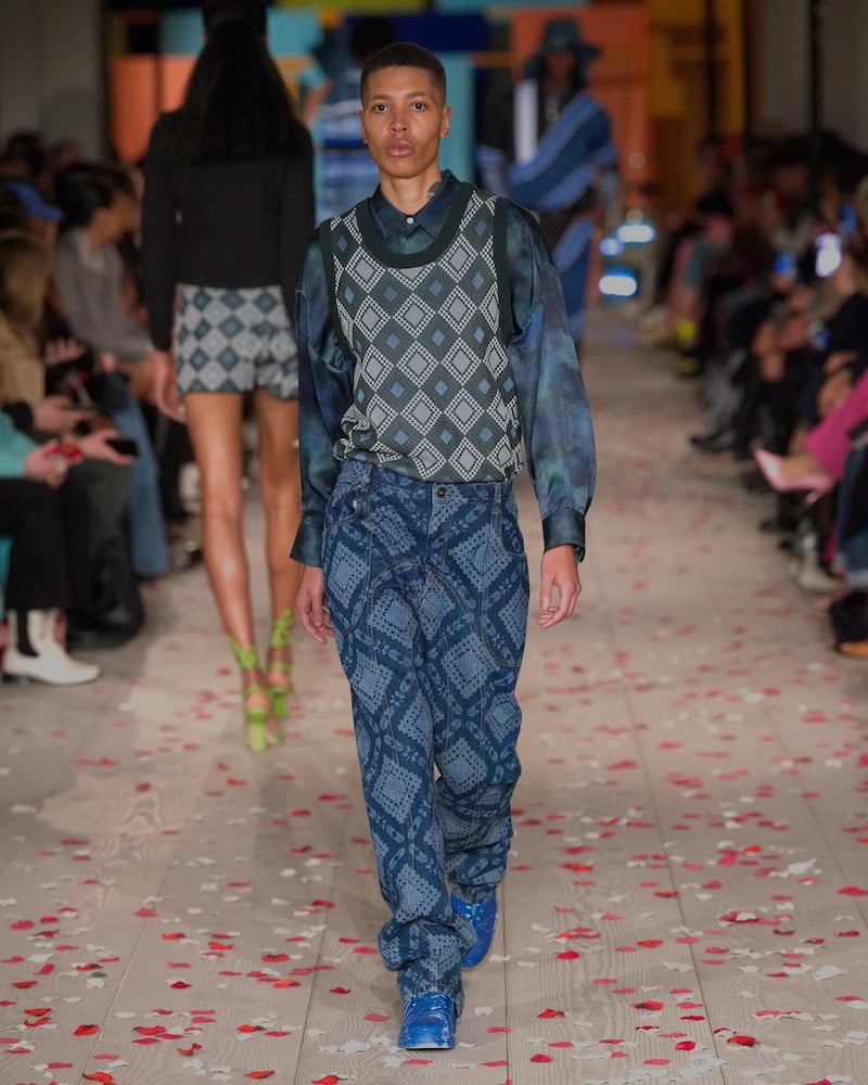 “Both genres have brilliant representations of what it is to be like Black and Brown through their own lenses,” said the designer in a pre-show preview, translating the hand-painted, textural elements of film posters found in local DVD shops in London to loosely-cut shirting and denim twinsets. Ahluwalia was particularly drawn to the romanticism that surrounds the characters in Bollywood flicks, and the sensuality that bleeds from Nollywood, pairing barley-there halternecks and pleated miniskirts in a cocktail of summery hues with draped and twisted fashions derived from traditional saris.