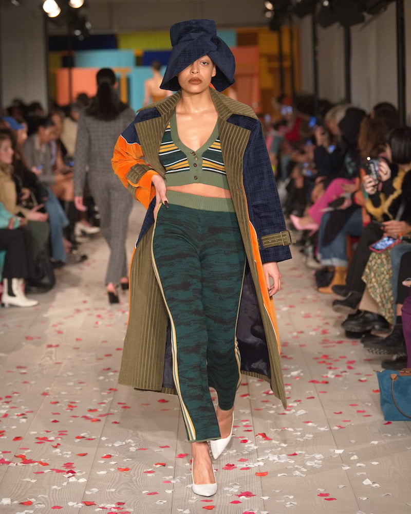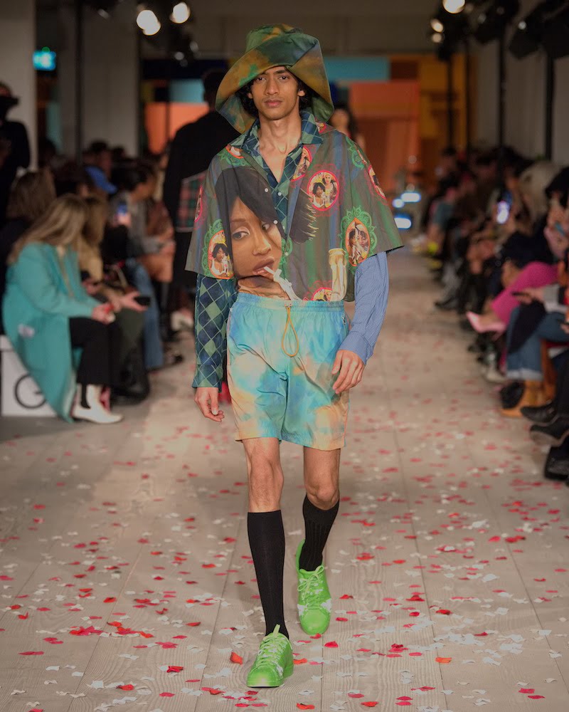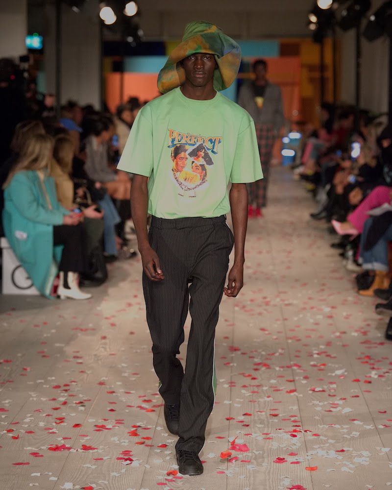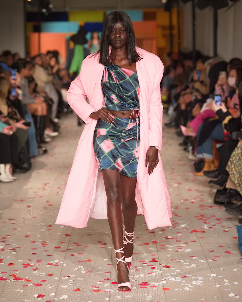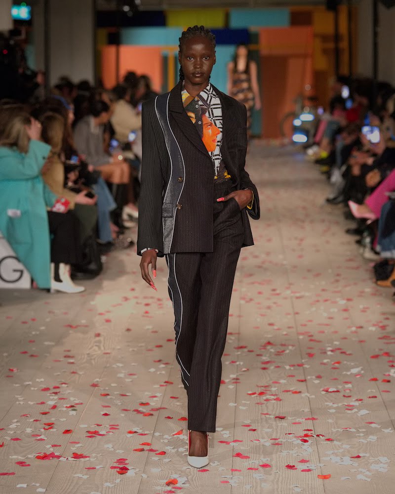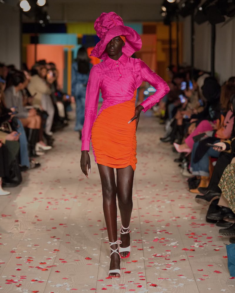 “Both genres have brilliant representations of what it is to be like Black and Brown through their own lenses,” said the designer in a pre-show preview, translating the hand-painted, textural elements of film posters found in local DVD shops in London to loosely-cut shirting and denim twinsets. Ahluwalia was particularly drawn to the romanticism that surrounds the characters in Bollywood flicks, and the sensuality that bleeds from Nollywood, pairing barley-there halternecks and pleated miniskirts in a cocktail of summery hues with draped and twisted fashions derived from traditional saris.