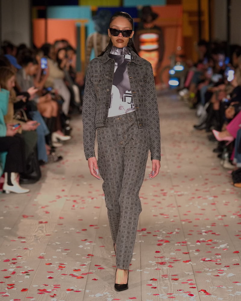 “With both areas of cinema, men are often quite dressed up, so we wanted to step out and show up,” says Ahluwalia, resulting in laser-cut, monogrammed denim met with navy check corduroy coats with broad shoulders, perforated with the brand’s signature waved formations.