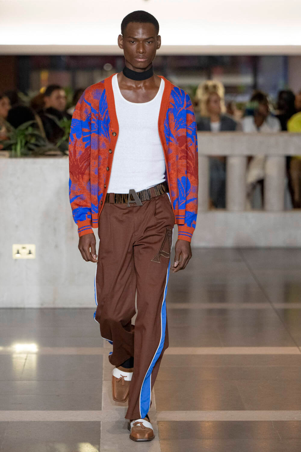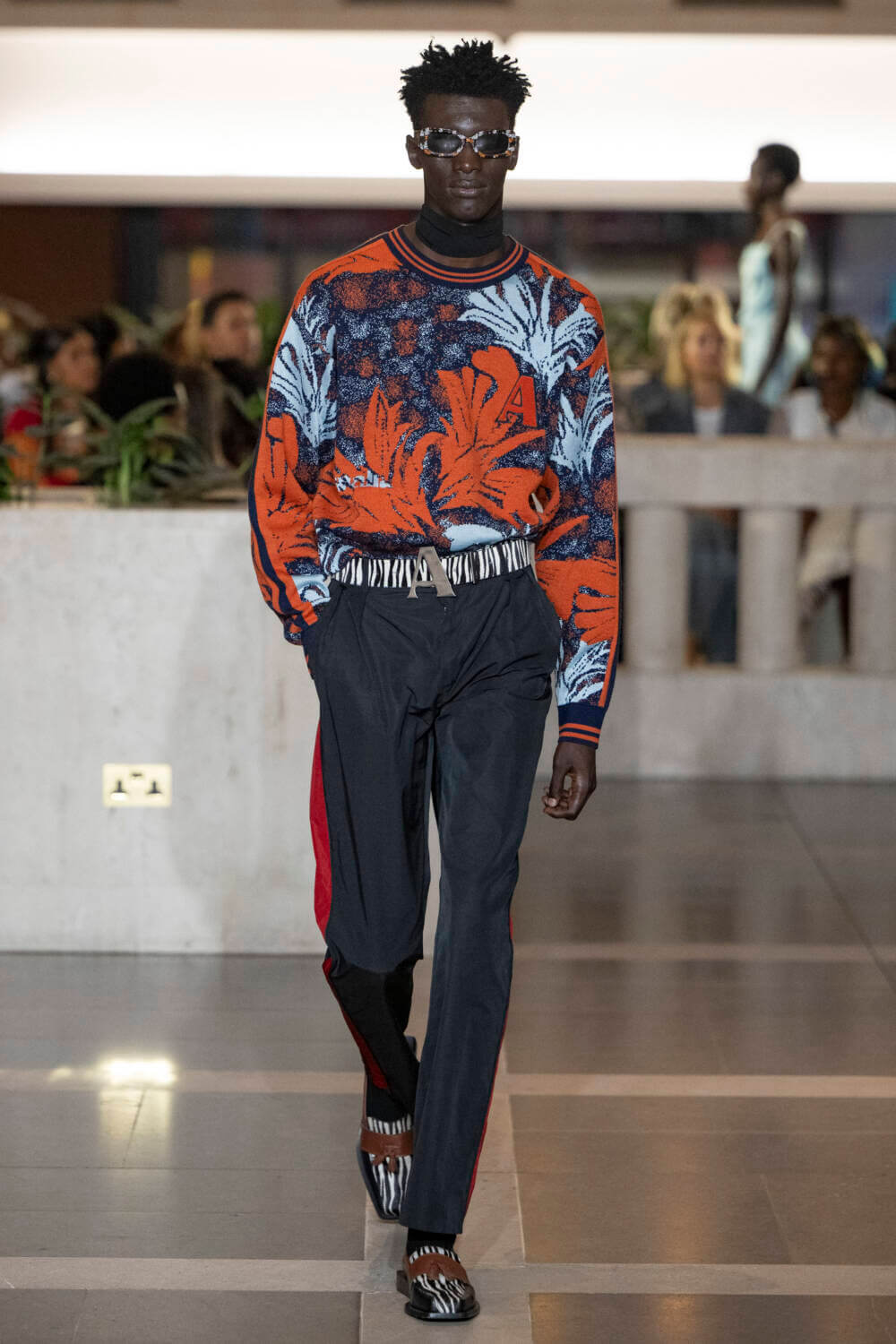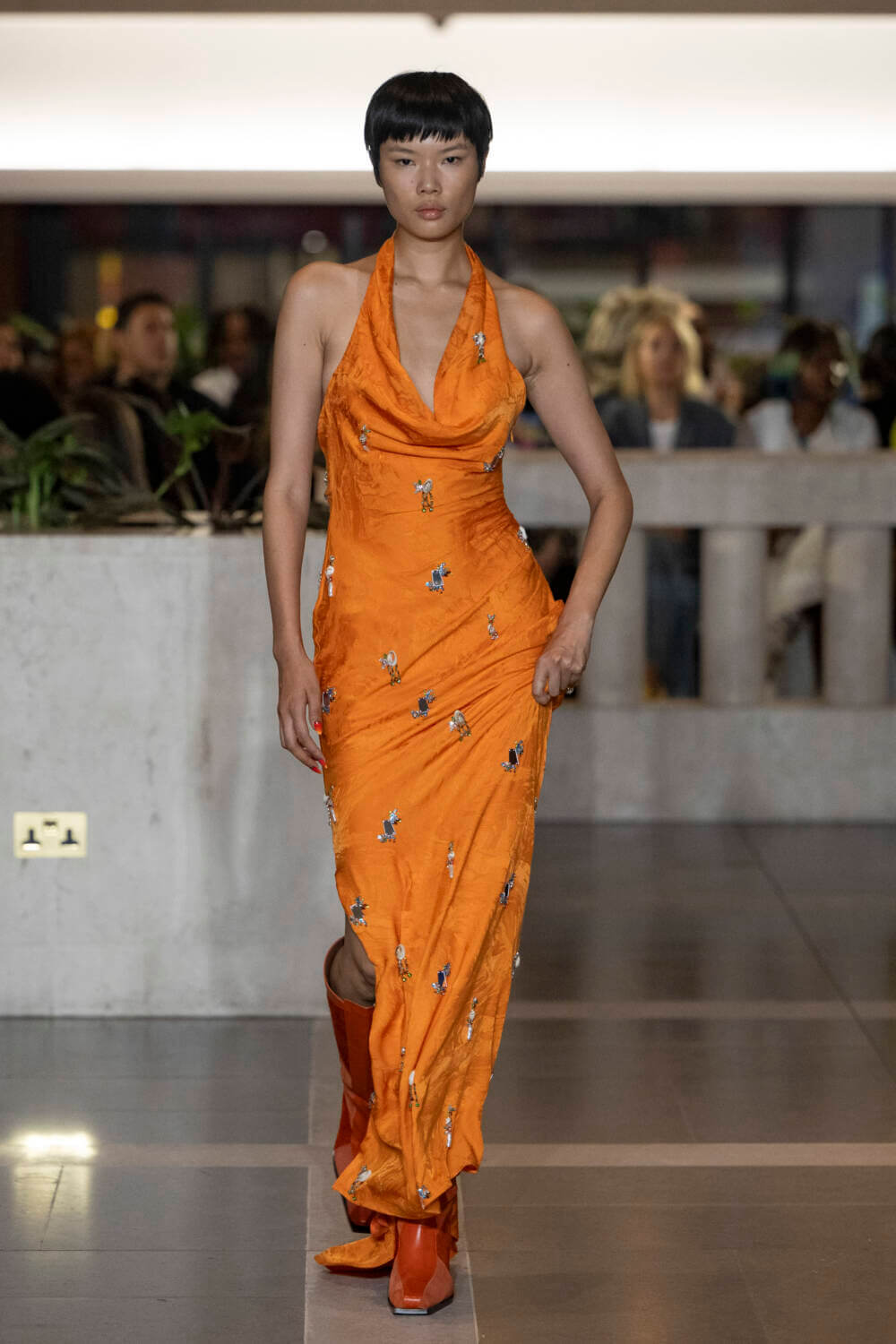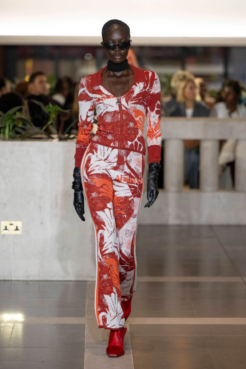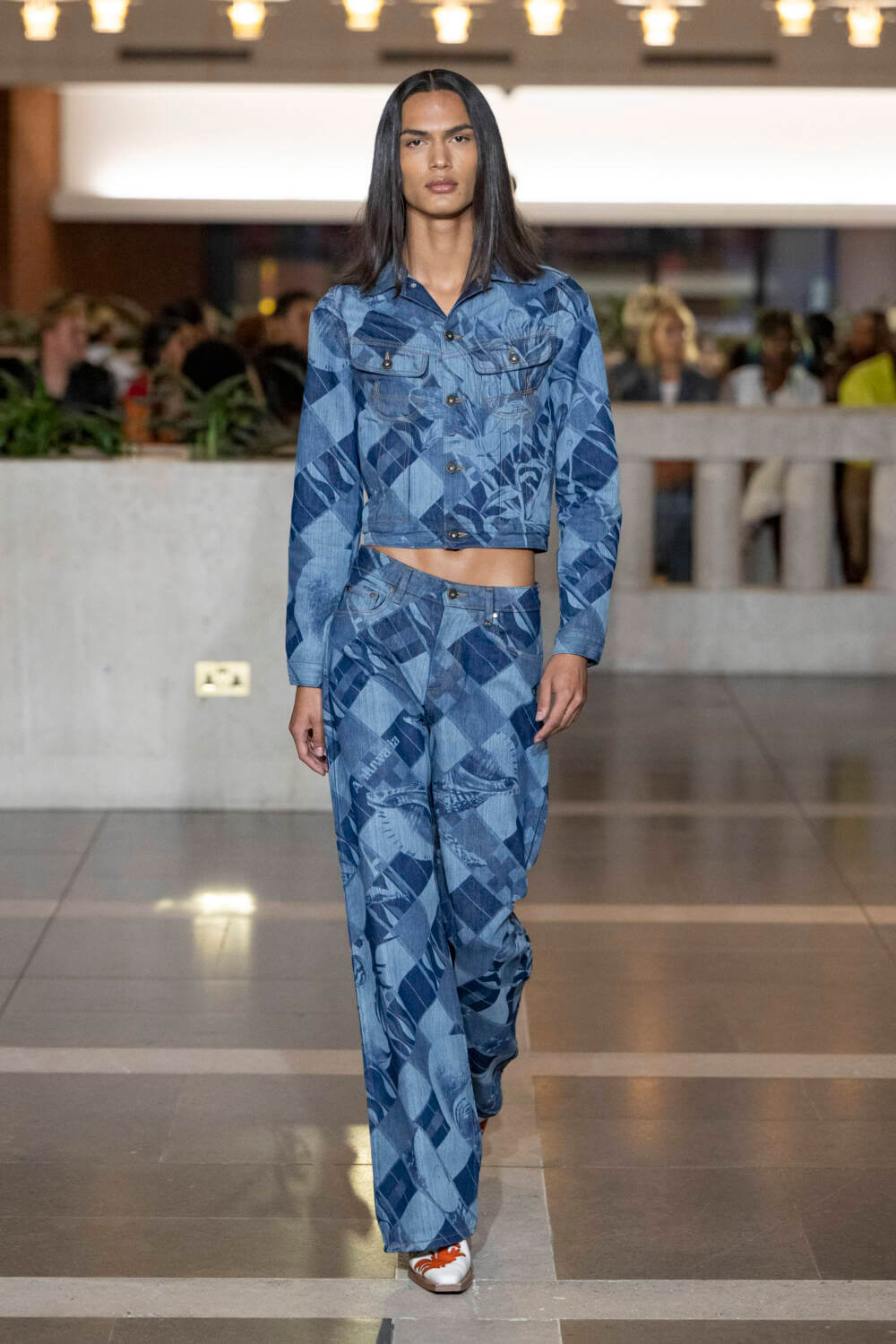 Be it Algerian artist Baya Mahieddine (a key inspiration of Picasso), Bollywood star Madhubala (one of India’s highest-earning entertainers in the 1960s) or drag queen and LGBTQ+ liberation activist, Marsha P. Johnson, each changemaker and forward-thinker played a part in shaping Ahluwalia’s design dialogue this season. The age-old expression of giving someone their flowers was sartorially communicated via laser-etched florals that sprouted across ISKO denim sets, as well as a series of intarsia knits. Elsewhere, Ahluwalia doubled down on the jacquard tailoring and retro-inspired sportswear which has become her signature, whilst continuing to explore eveningwear; a tangerine cowl neck frock that closed the show stood out. It was a striking salute to unsung heroes, beautifully-done.