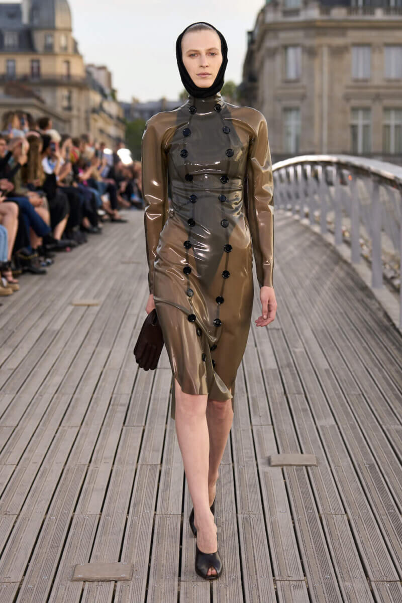 For Azzedine Alaïa, a dress always began with the woman that would wear it. The fashion maestro would build garments directly on his models, draping and sewing swaths of fabric around their bodies before they would elegantly sculpt their frames. Pieter Mulier, the eponymous house’s creative director today, expands on this notion for SS24. Taking place on a padlock strewn footbridge across the Seine, the collection spoke of ways the human figure itself “can be fashioned” through “the push and pull of clothes”, as stated in the collection’s notes.