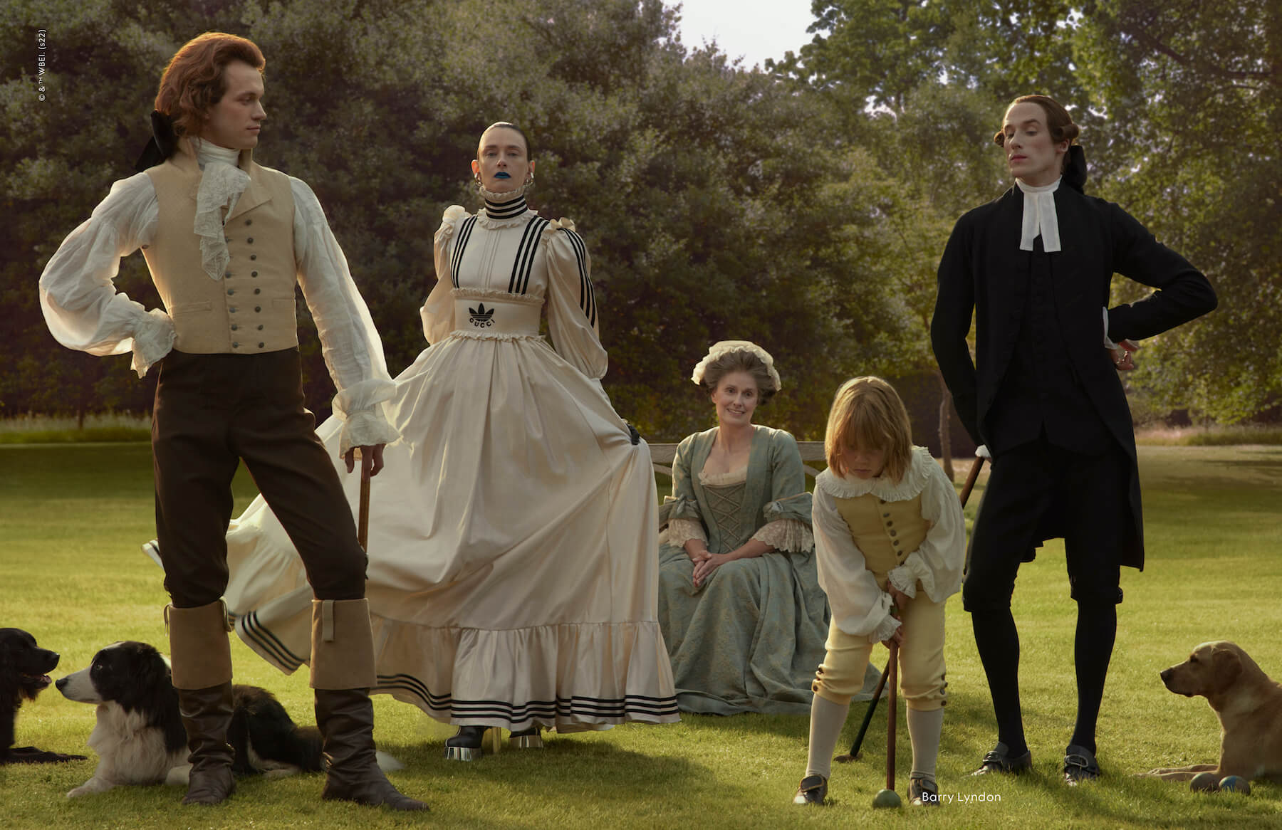 Depicted, an Adidas collab dress appears like a latter-day victorian costume within a scene from Barry Lyndon, cunning and all; gothic garms infiltrate the isolation and insanity of The Shining; a venus in fur, embellished with sensual bourgeois pearls appears like an enigma born from the erotisism and mystery of Eyes Wide Shut; A Clockwork Orange’s fetishism encroaches upon the savage style and eccentric inky eyeliner of the lads enframed; a dreamy evening dress overflowing with soft tulle ruching pervades the aseptic and dystopian vessel and metaphysical oddity that is the Discovery One in 2001: A Space Odyssey.