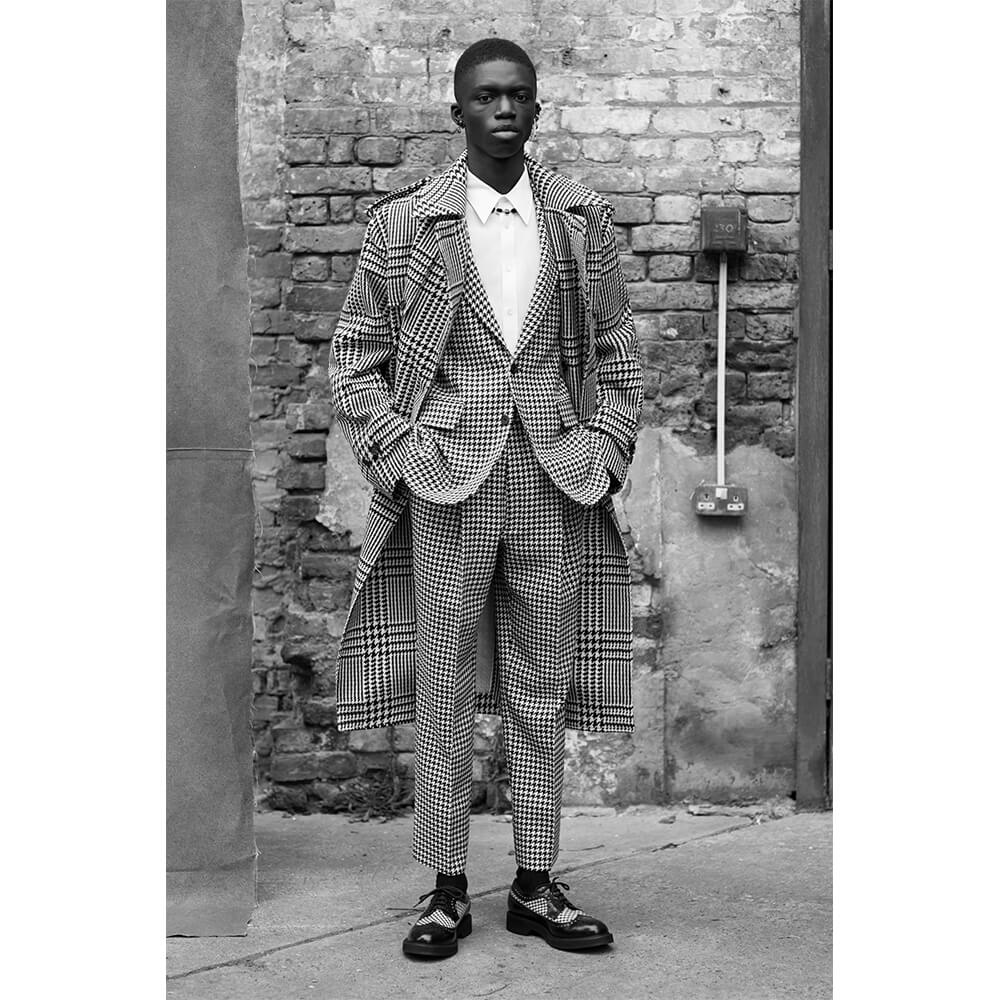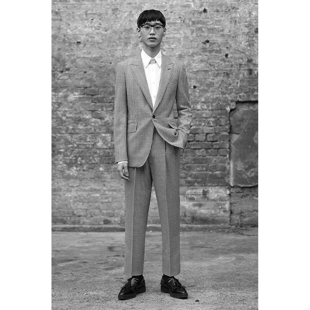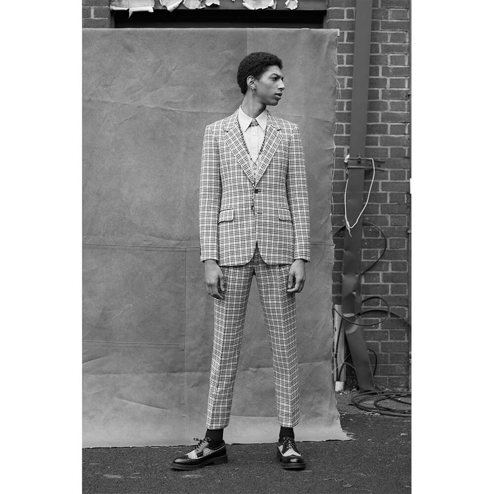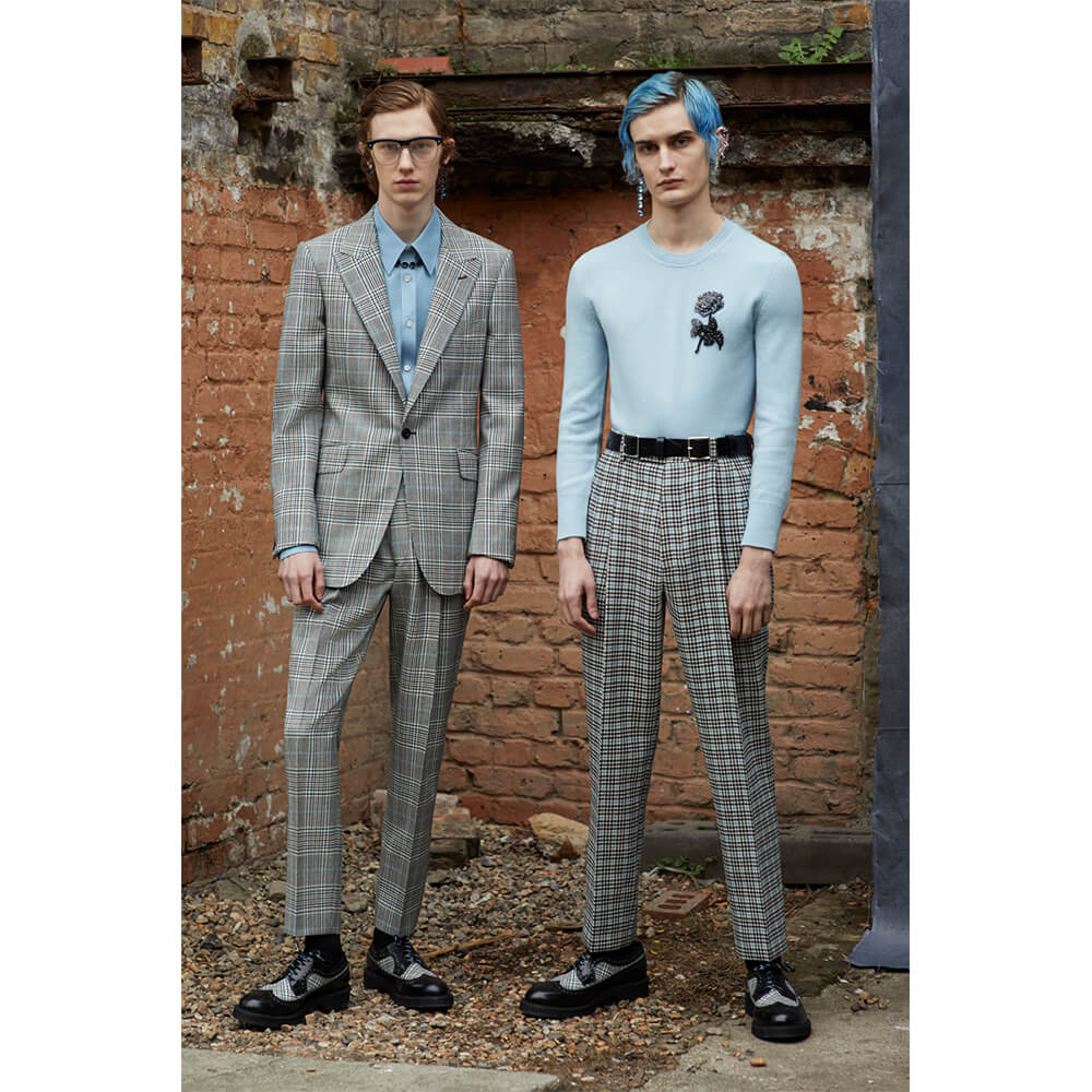 Taking inspiration from the North and Northern Soul, building on her last women’s collection, Sarah Burton veiled the rough, post-war depression with a sense of optimism and creative freedom of the 1980s New Wave. The greyness of steelworks and docks meets the electric energy of The Smiths, New Order and Joy Division. Instead of a documentarian vision of the North in a certain time period, Alexander McQueen’s AW19 menswear collection sums up the romanticised notions of this unique area into a collection of rich, embellished and perfectly-tailored clothes. Suits obviously take the leading word, as it’s usually the case with McQueen – from rough plaids in wool to delicate silks covered in oversized floral prints. Traditional silhouettes get a new, subversive take as feminine and masculine elements collide. Leather pieces and trench coats complete a fantasy wardrobe of a 21st century man with a nostalgia for the past. Turning the frown upside down, all the longing for the days that came before is repackaged into utopian beauty. The final two looks of the collection hit peak couture, with suit jackets covered in crystals and chains, reflective of a 1950s ballroom chandelier.