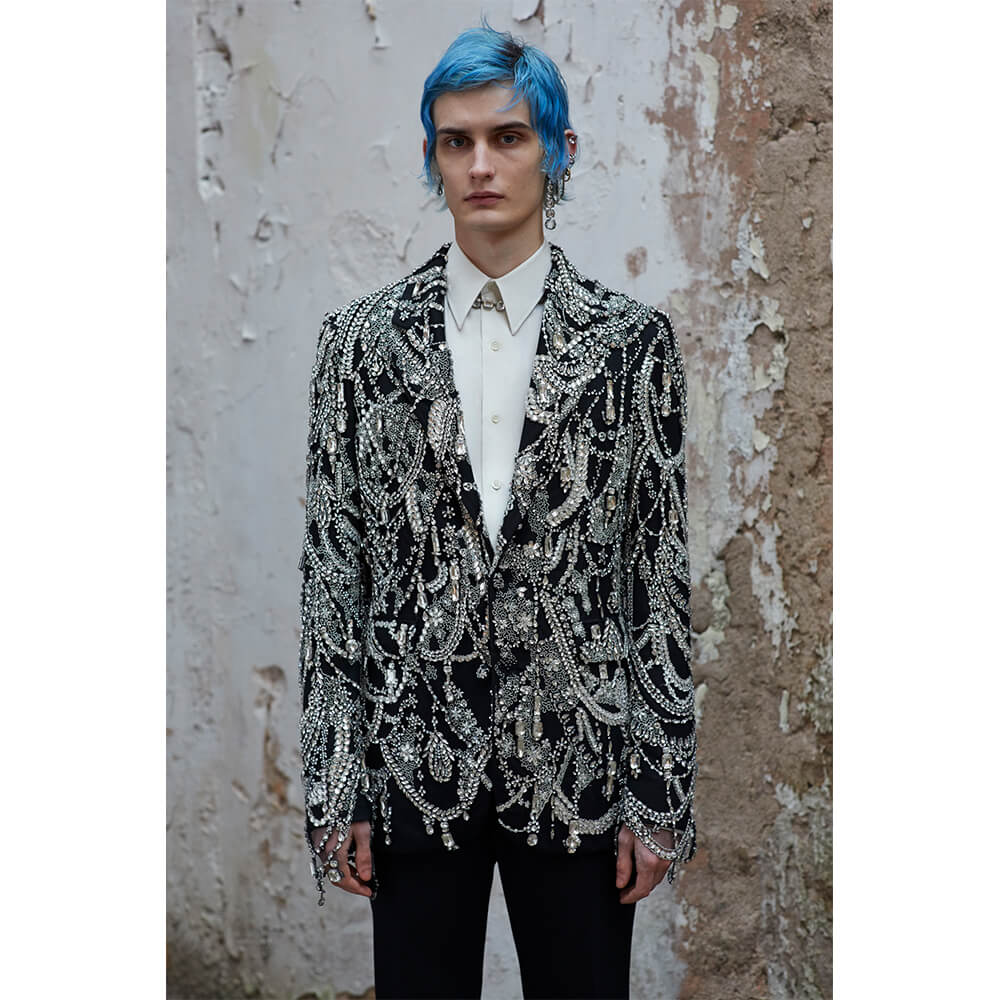 It sometimes feels like fantasising is only allowed when looking at women’s collections. Menswear is just too often focused on forming a reality and portraying a real street in a real city, with real characters wearing those clothes. This collection is an opportunity for all us big daydreamers to see men’s clothes as an opportunity to express our unreal ideas about who we want to be. Thank you for that, Sarah Burton.