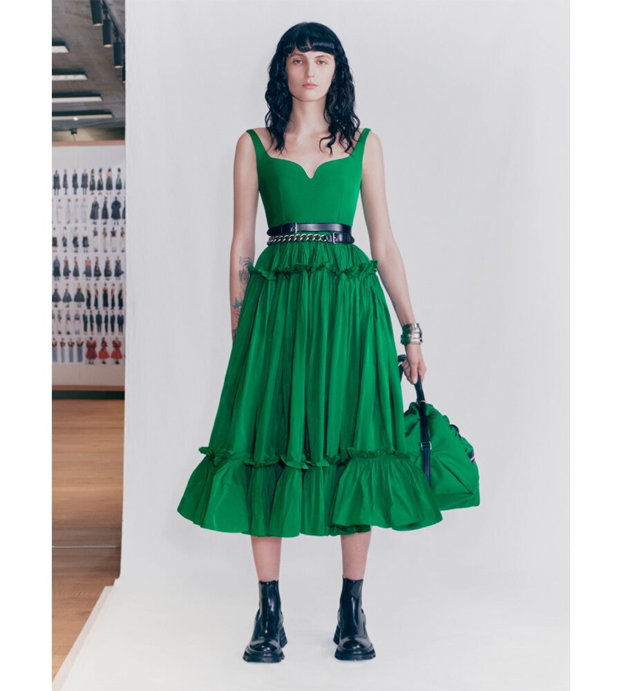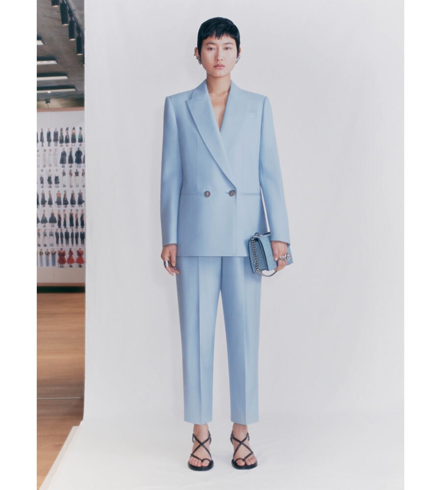Burton’s cutting skills are second to none. You won’t find a better-proportioned trouser suit or tux and she skilfully brings together a leather biker jacket and a denim jacket for a new take on classics. Voluminous flounced dresses in fresh pea-green, royal purple or lipstick-red, come in polyfaille – a remarkable, sustainable polyester that takes on vivid colours and brilliantly holds Burton’s soaring silhouettes. The Curve bag – one of the best new bag designs to emerge in recent years – comes in a fresh array of joyful colours. Just in time for re-opening, McQueen is serving powerful proportions and clothes with a true sense of occasion.