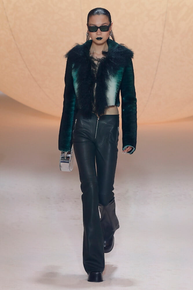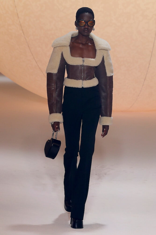 Veering away from the oversized silhouettes of Ambush’s past, Ahn kept tailoring boxy but muted, opting for soft distortions instead. Hard-edge leather outerwear, cropped moto-jackets and blocky blazers with shearling perimeters added a ’70s feel ,while huge shaggy coats and padded vests adopted off-kilter proportions.
