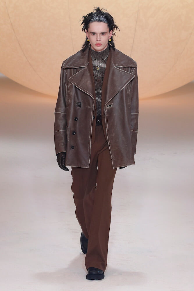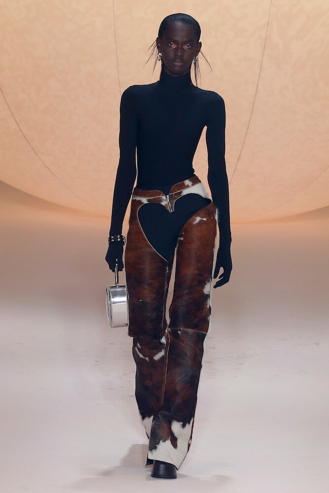 Meanwhile, a yellow leather boiler suit played with Japanese film tropes – anime characters made real and real people made digital – and printed calf coats and chaps gave space cowboys a new name.