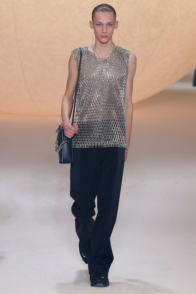 As for the accessories? Ahn is well-known for her complex jewellery designs for Kim Jones’ Dior men’s collections, so it’s no surprise the silver and brass ornaments were a standout, suggestive of the rings around a planet and undulating like a black hole. Her expertises were also echoed in laser-cut letter motifs repeated as AAAplus chainmail dresses, boots and bags.