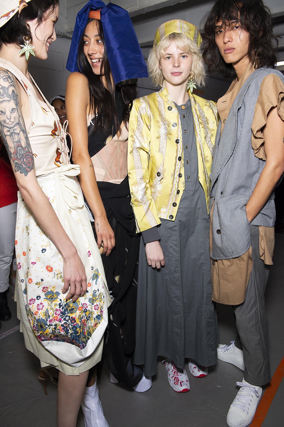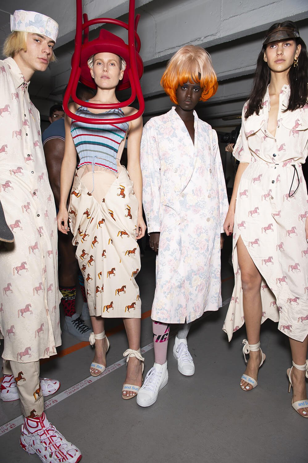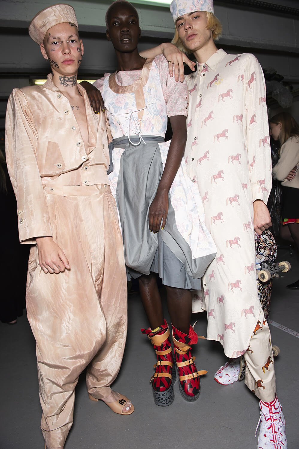 We learnt later that Andreas Kronthaler has been inspired by Jessica-Fulford Dobson’s photographs of the skateboarding girls of Kabul – a group that promotes women’s rights through skateboarding. Kabul girls inspiring dresses worn by boys – why not? Kronthaler and his team don’t think in binary when they design. There were women in the show too. They wore exploded versions of Westwood’s corseted finery, layered up and balanced atop Buffalo flatforms. Kronthaler’s twisted tea dresses were worn by women and men and the show was punctuated by three muscle bound hunks whizzing around on electric scooters modelling a new men’s underwear line of rainbow coloured budgie smugglers. It was surprising and fun – a joyful cacophony of interesting characters. How very Westwood.