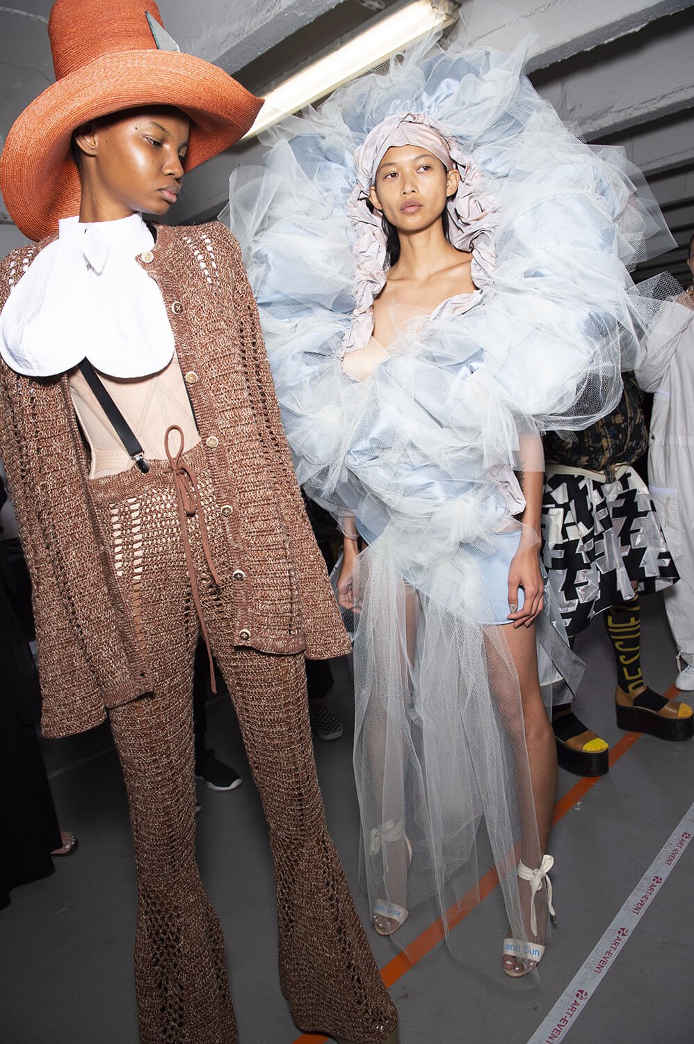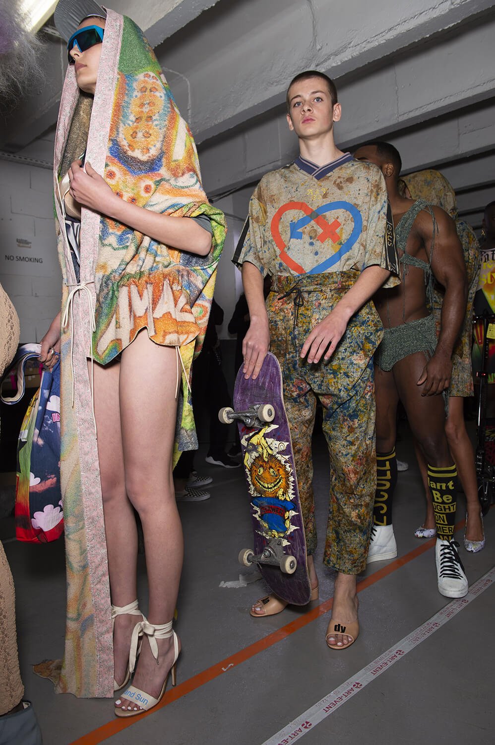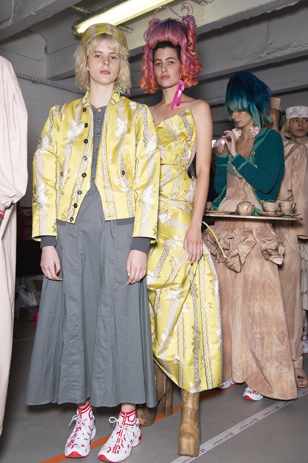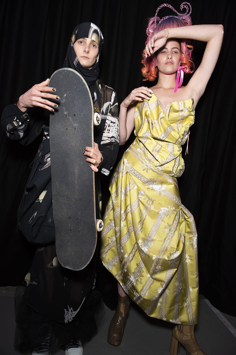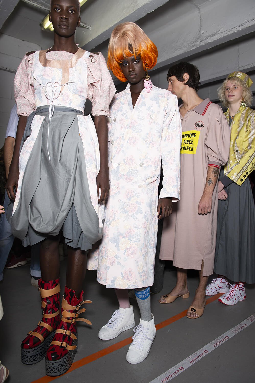 In a parking garage in northern Paris the Vivienne westwood crew was hard at it. Gary Card, the ace set designer and his team carried on scrunching and fixing swathes of paper to the set as the models rolled around the catwalk. Rolled? The show opened with skater boys wearing loose Westwood dresses and mid-heeled mules, nonchalantly wheeling round the catwalk.