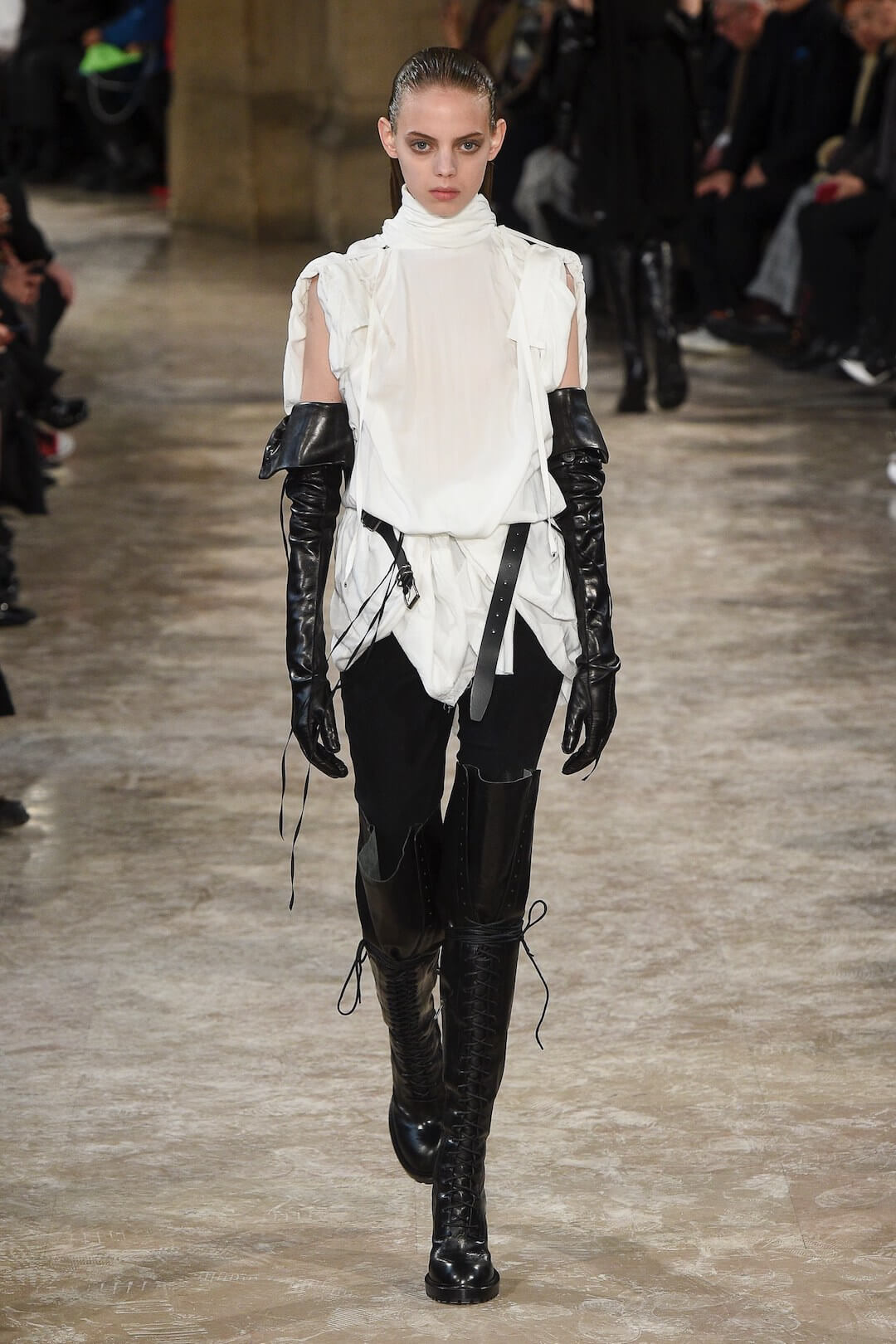 A classic Ann Demeulemeester break of pure white, like a sigh of relief in sheer chiffon added a disguised, ethereal feel to it all. Tricky. Ribbed necklines on knits fell freely in jumpers and dresses and waists were cinched with shiny leather corsets. Bauhaus’ ‘Bela Lugosi’s Dead’ rumbled through the finale, “The bats have left the bell tower, the victims have been bled… The virginal brides file past his tomb… Undead undead undead.” These girls are very much alive and thriving in the dead of the night. We can hear bats screeching, bell towers ringing and girls chanting on their way to battle… We’re getting carried away.