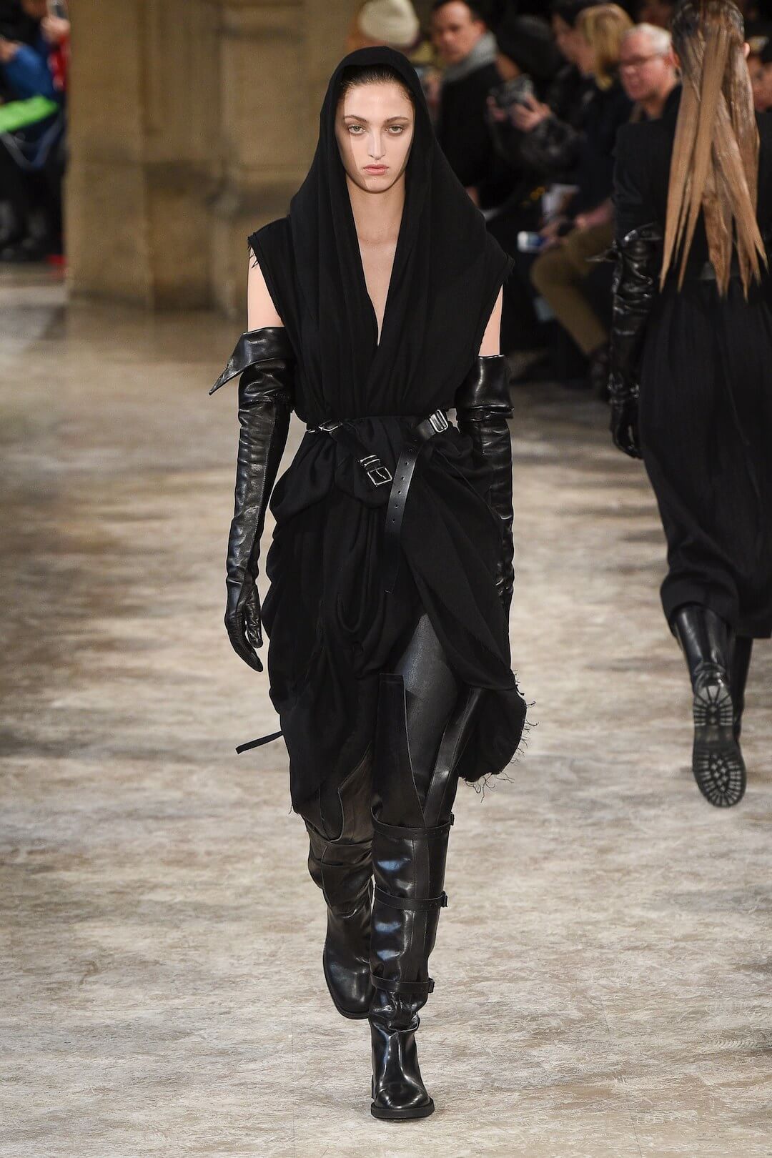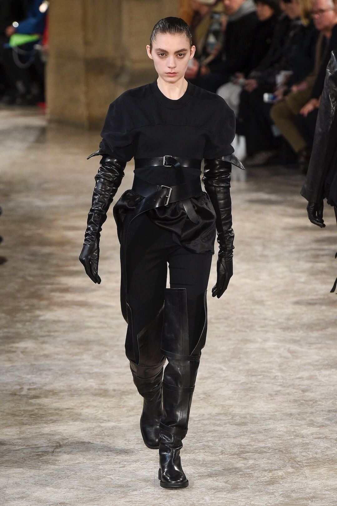 Move bish, get out the way. Ann Demeulemeester’s army is coming, hard and fast. Sebastien Meunier did not veer from the true Demeulemeester deep-into-the-night darkness for this collection. Wickedly good. Black on black and dangerous. Our people. Yes, intense, but put together in such a way that it didn’t feel heavy. Subtly peaked shouldered coats were light, leather harnesses fell away around the waist and black gloves crawled up above the elbows, Gila style. 1940s heroines in their dark, twisted ways. Shoulderless overcoats made way for skin, cutting into all that noir. Hoods scooped up, these women were fighters, off to battle in a futuristic, troubled world. Vampires in a Hunger Games situation but much better dressed, obvs.