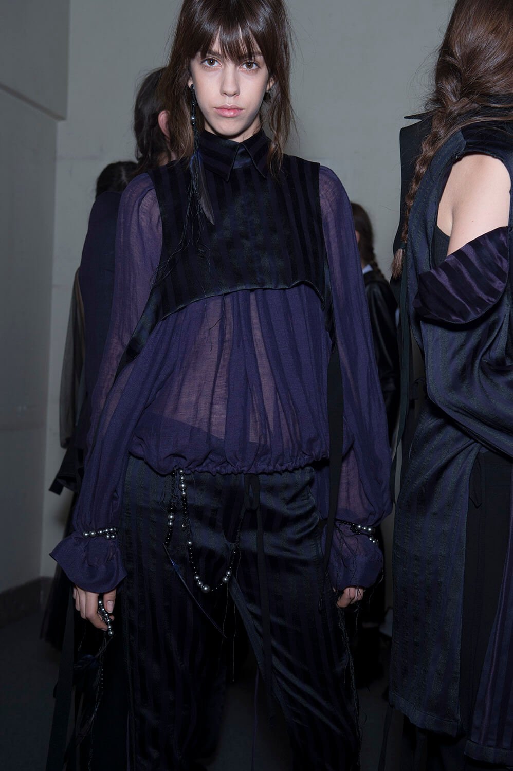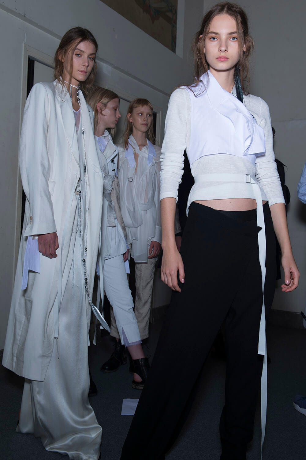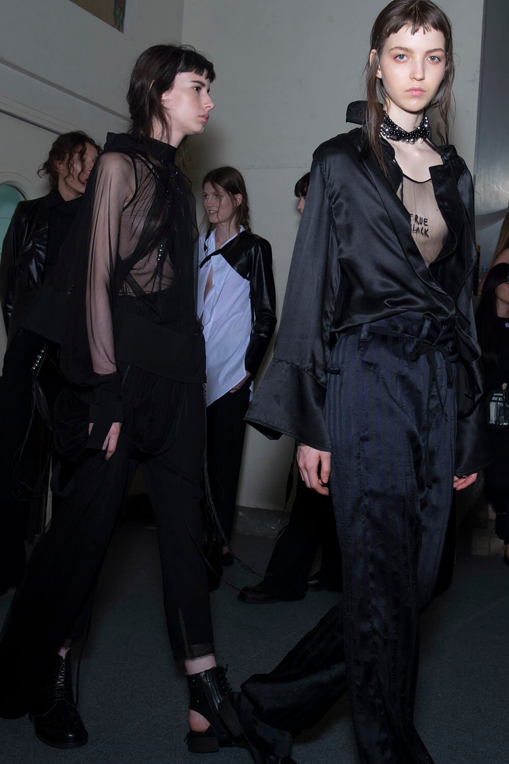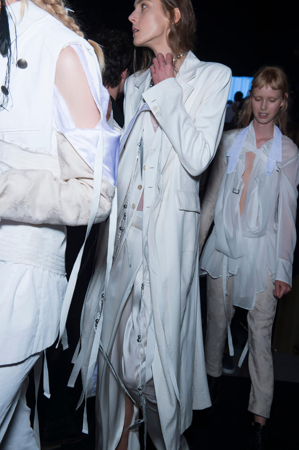 Ann Demeulemeester’s coven was out to play. Coven of the night. Leonard Cohen’s voice vibrated though the room, “Magnified, sanctified, be thy holy name, Vilified, crucified, in the human frame. A million candles burning for the help that never came. You want it darker.” Super crisp white shirts sliced and restitched for that off kilter Demeulemeester construction were layered under backless vests and one shouldered sleeves giving structure to the looser, pulled apart tailoring. Rosary beads hung off straight leg boy pants and wrapped themselves around shirt sleeves with trailing cuffs. The girls were tied and fastened into a collection that felt dark, complex, deep and troubled. It was unravelling. This was their moment. Their chests branded with the words True Black. Their coven’s name. The finest mesh peeked out under deconstructed suits in inky blacks and bruised sky purples you only see at midnight. Women of the underworld that only come out at night.