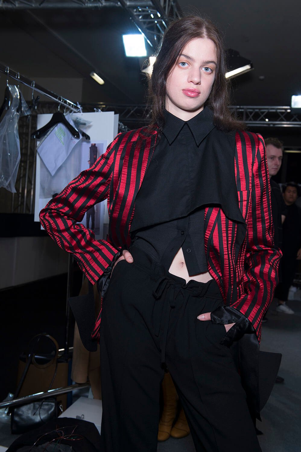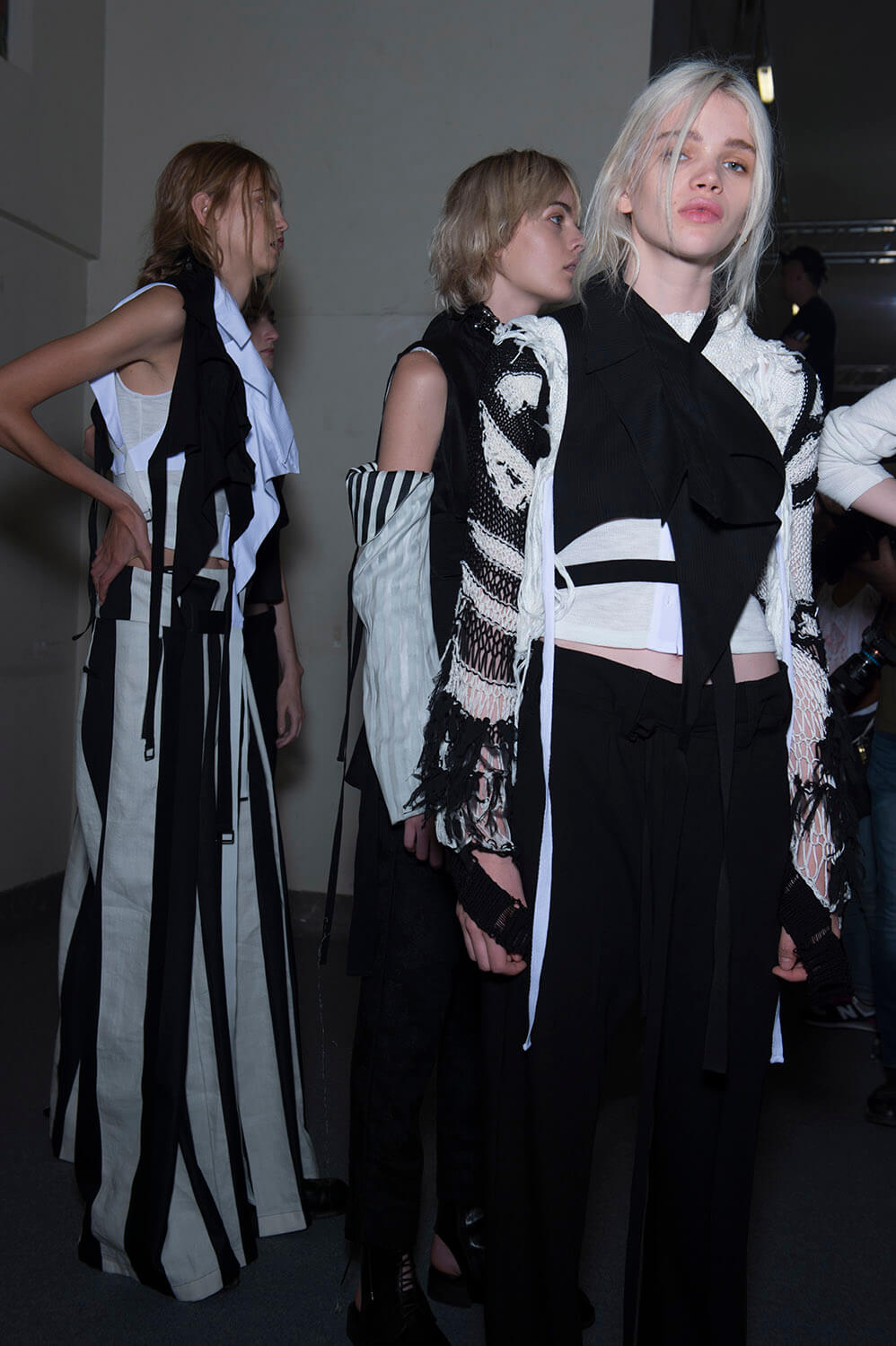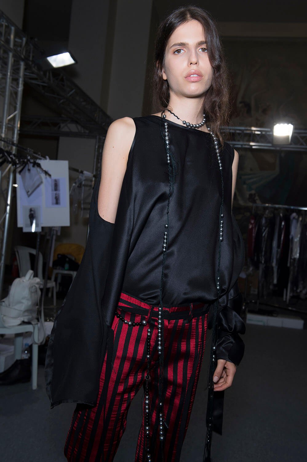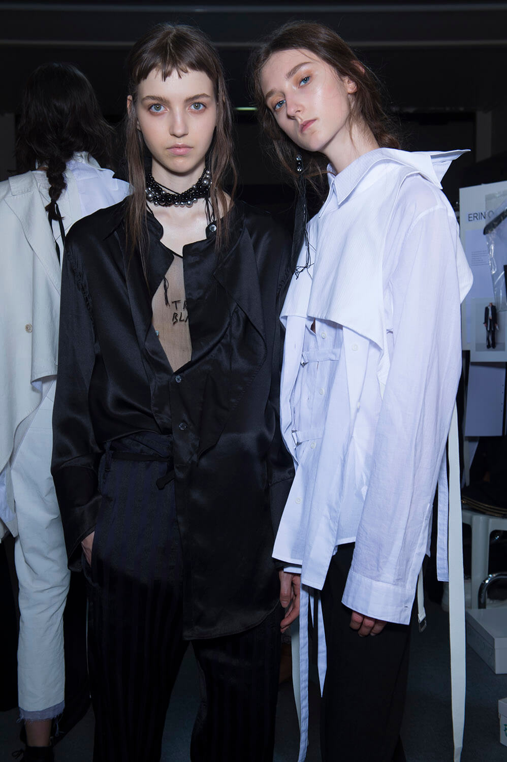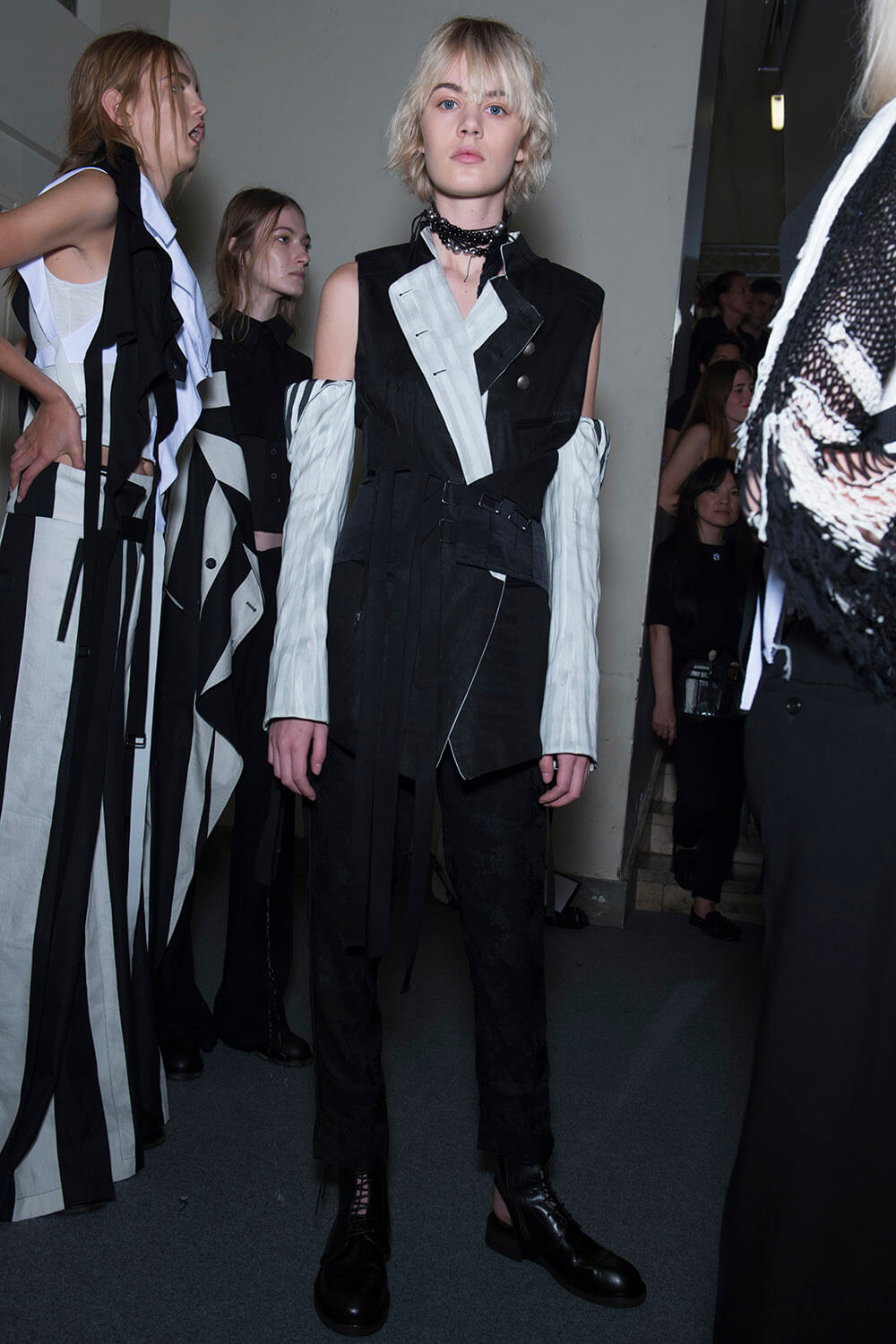 Ann Demeulemeester’s coven was out to play. Coven of the night. Leonard Cohen’s voice vibrated though the room, “Magnified, sanctified, be thy holy name, Vilified, crucified, in the human frame. A million candles burning for the help that never came. You want it darker.” Super crisp white shirts sliced and restitched for that off kilter Demeulemeester construction were layered under backless vests and one shouldered sleeves giving structure to the looser, pulled apart tailoring. Rosary beads hung off straight leg boy pants and wrapped themselves around shirt sleeves with trailing cuffs. The girls were tied and fastened into a collection that felt dark, complex, deep and troubled. It was unravelling. This was their moment. Their chests branded with the words True Black. Their coven’s name. The finest mesh peeked out under deconstructed suits in inky blacks and bruised sky purples you only see at midnight. Women of the underworld that only come out at night.