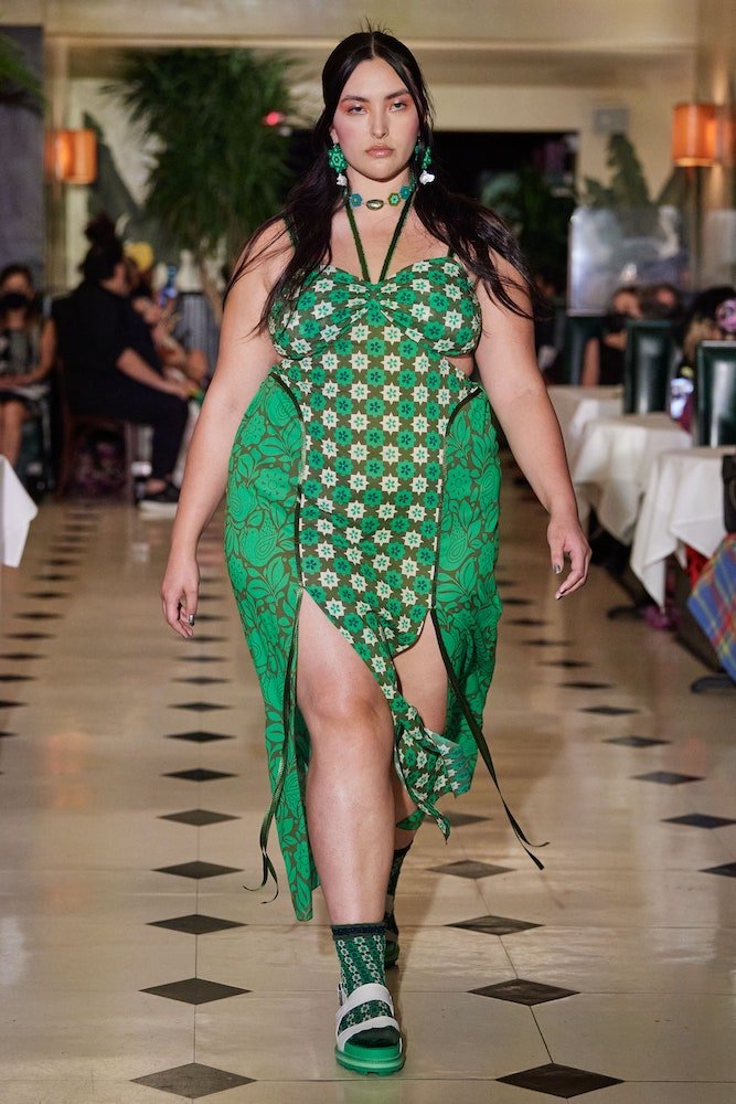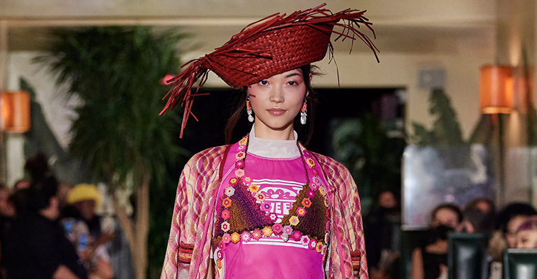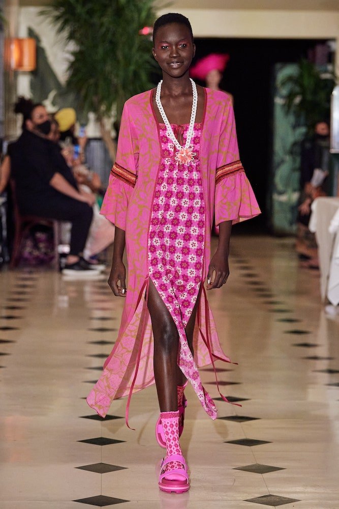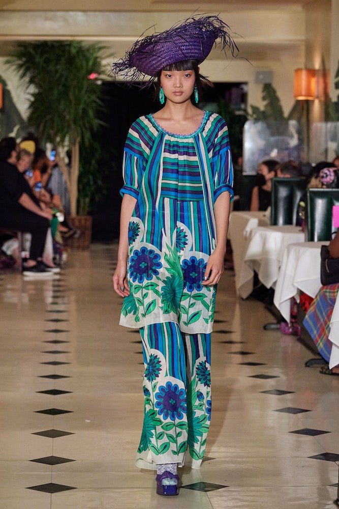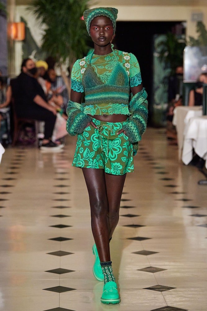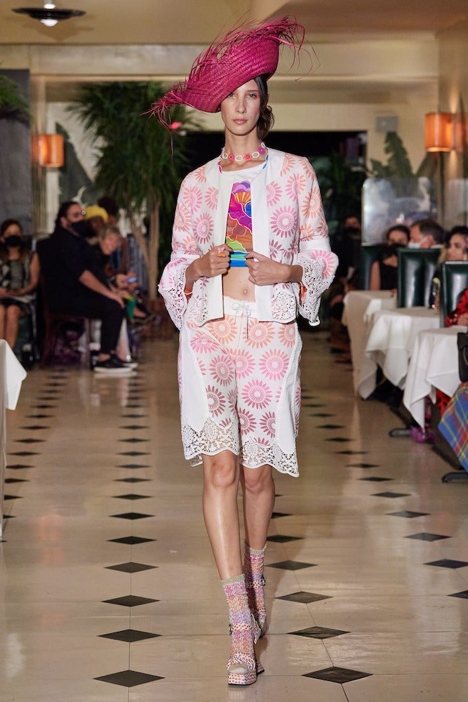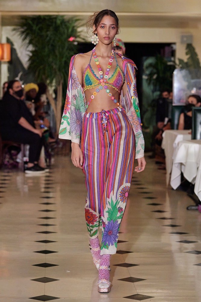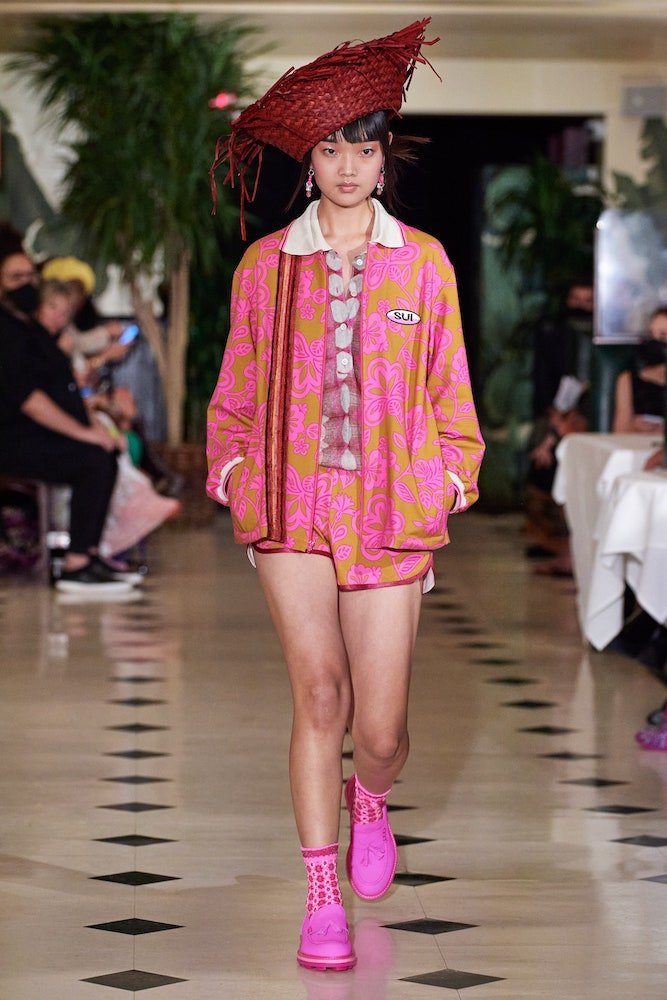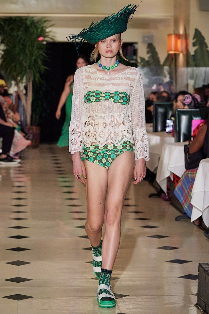 Inspired by a dreamy holiday escape where the sun forever shines and the ocean waves constantly crash against the shore, Anna Sui’s SS22 collection is enchanted by a day in paradise. Maintaining her classic upbeat and bright aesthetic, crochet bathing suits are layered with scuba shirts and bright coloured sandals, whilst tropical printed shirts have been reimagined with French terry cotton and mesh fabrics, cruising with a dad-on-vacation vibe all the way through.