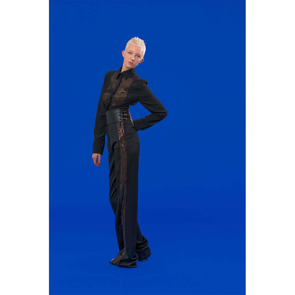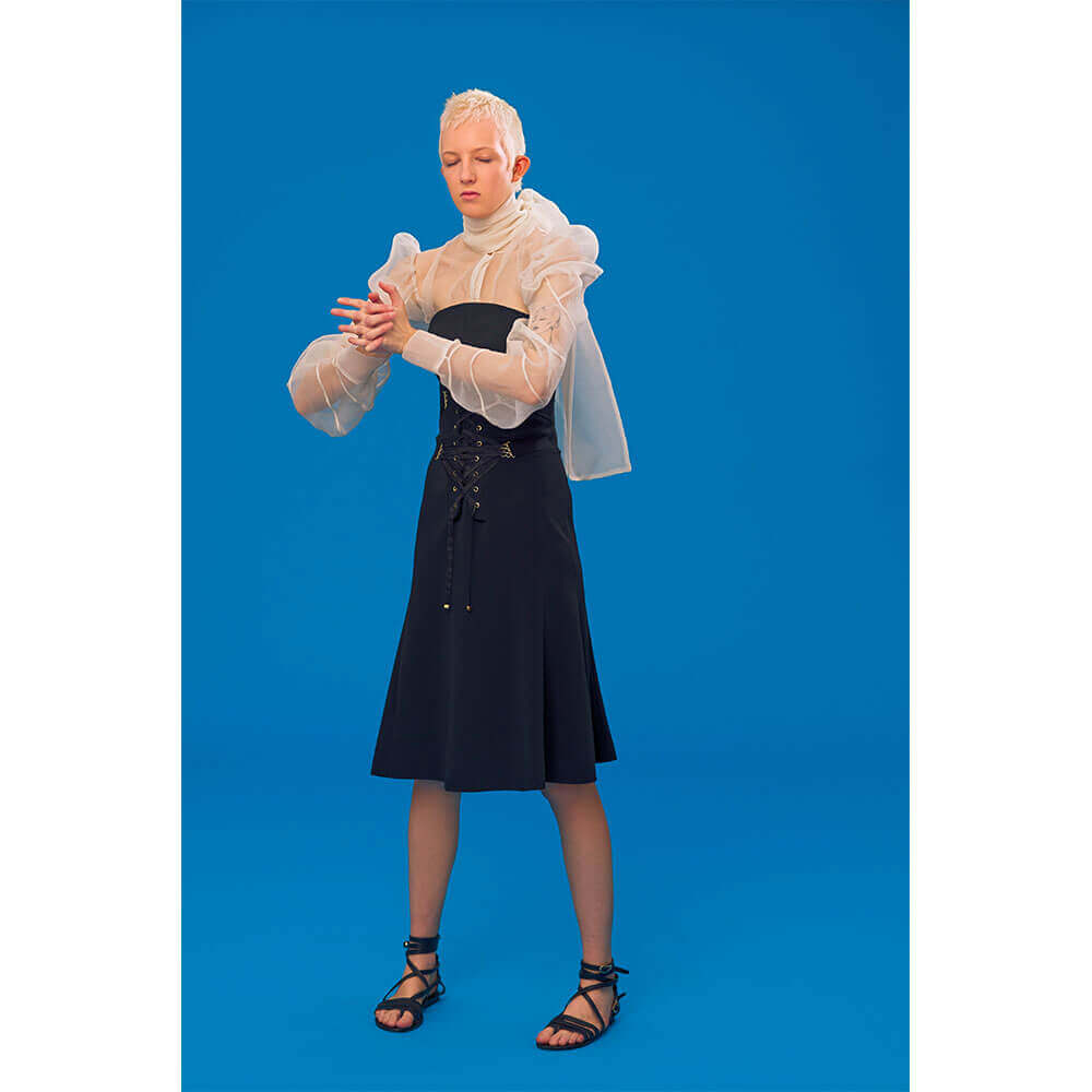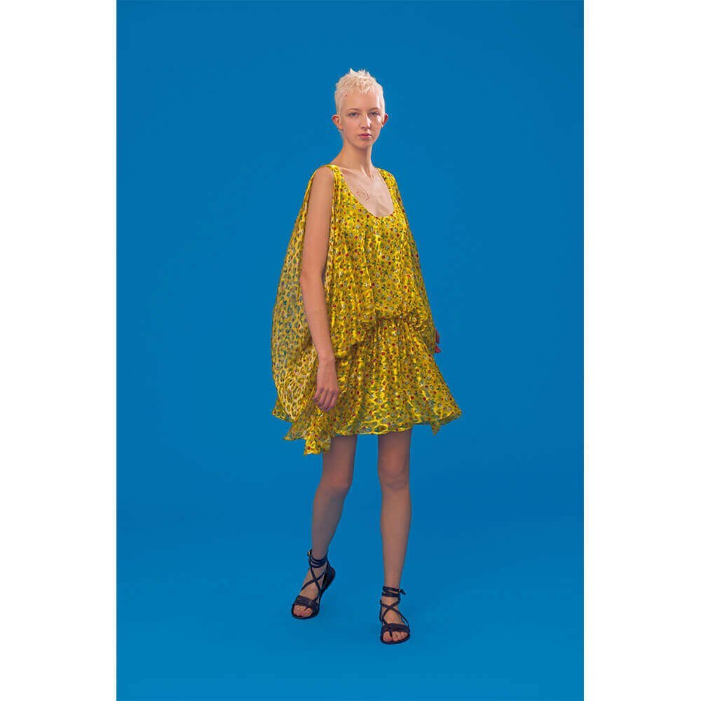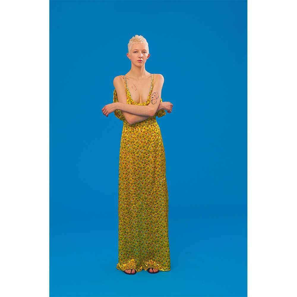 High-waisted matador trousers and classic black shirting is perforated with gold lining, topped off with classic gladiator sandals. Nipped-in blazers are fitted with a corsetry finish, cut into tulip printed chifon, whilst ruched organza shirting is worn beneath a slender navy dress – styled by our very own Editrix Sophia Neophitou. The star of the show however was a buttercup yellow silk animal devoré, printed with dainty florals which was used to make floor-length gowns and a fluted sack-back dress meets roman tunic – when can we place our orders?