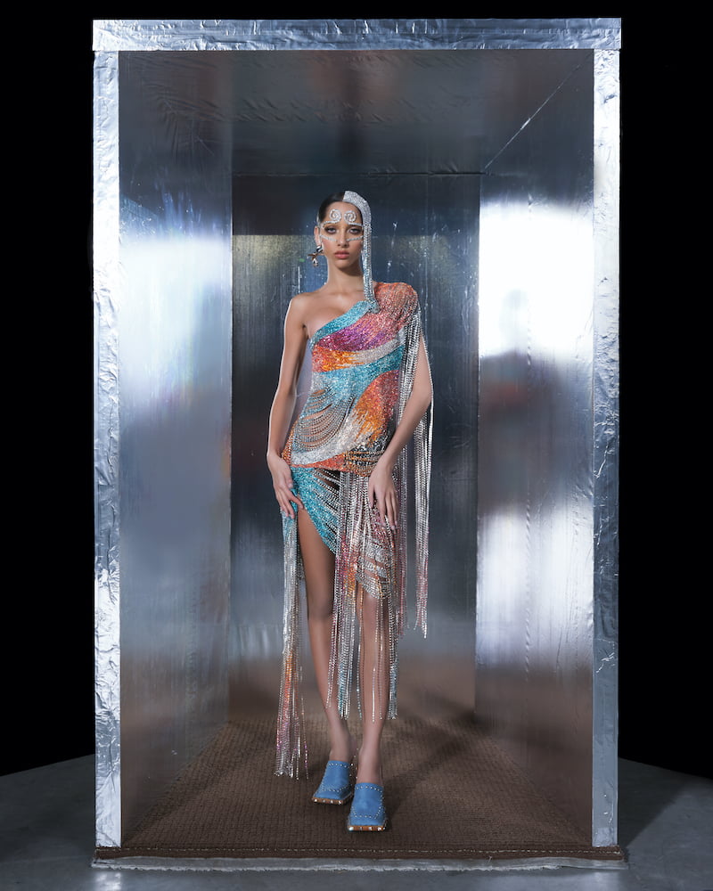 From the Big Apple to the glistening lights of (digital) Haute Couture week, Area is taking its quest for inclusive glamour to tremendous new heights. Founded by Beckett Fogg and Piotrek Panszcyzk in 2014, the New York label is known for its glistening, Swarovski-laden collections that are overtly luxurious yet rooted in dressing real people of all ages, sizes, genders and nationalities. After spending the past five or so years building up a cult following – plus a trusted cliental that buys bespoke each season – the Covid shattering of the traditional fashion calendar pushed the designers to steer into a new, exciting direction.