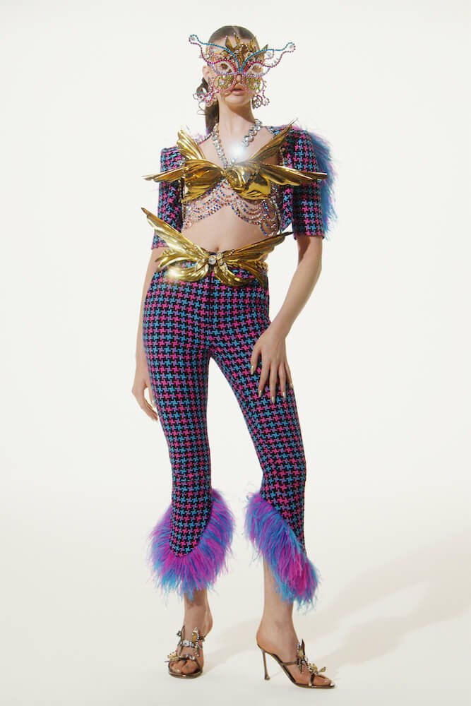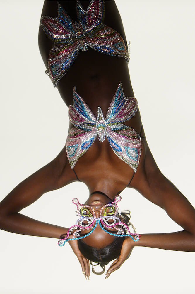 Whether it’s corset-shaped blazers and bodysuits, flared pants with bedazzled body jewellery, barely-there butterfly lingerie, fur-trimmed booty-revealing hot pants and a denim jacket for the off-duty dancer, or logo laden thongs, Area is about the lux life and it couldn’t be clearer: This is a collection for the girls that just want to have fun. These clothes crave a dance and are meant to be worn out–out, whether it’s evenings spent at the nightclub or a masquerade ball.