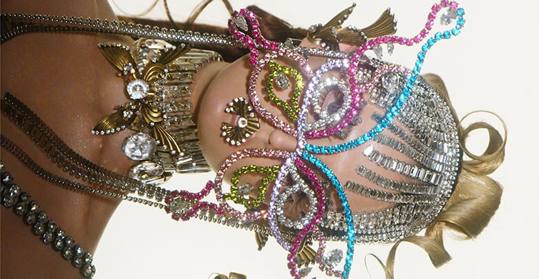 Exploding with colour, bulbous structures like modernist sculptures come covered in obsessive beading and excessive embroidery. Meanwhile, the audacity on display brought just the right amount of drama. Think elegant masquerade masks and mouthpieces, gold metalwork wings on everything, embellished brasiers and elaborate body harnesses, all paired with crystal platform mules and feathered stilettos for a brilliant, bourgeois look.