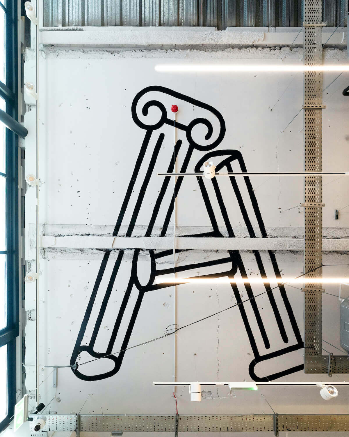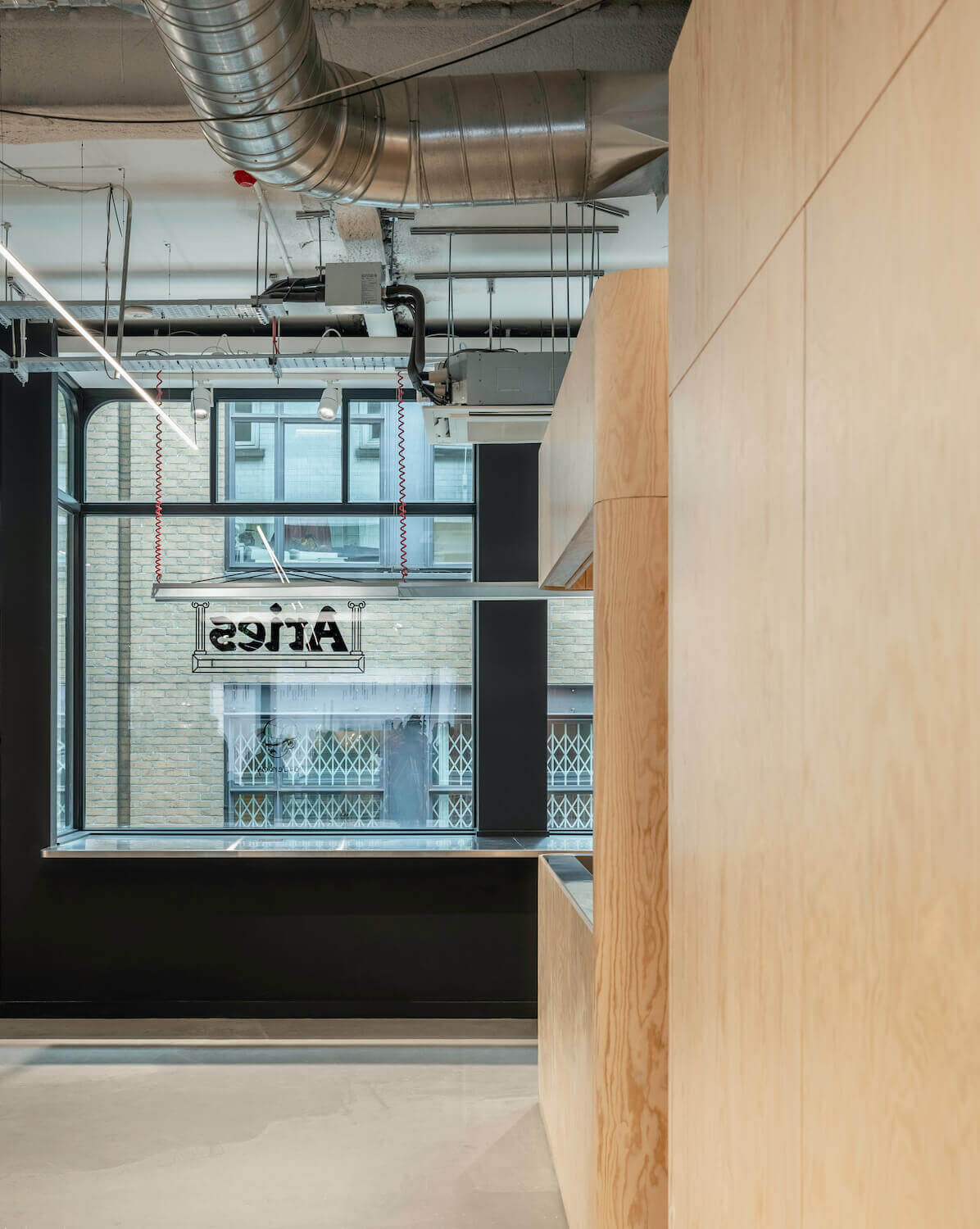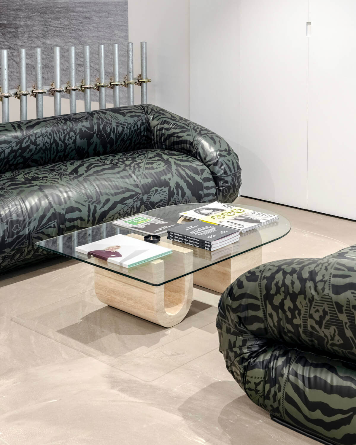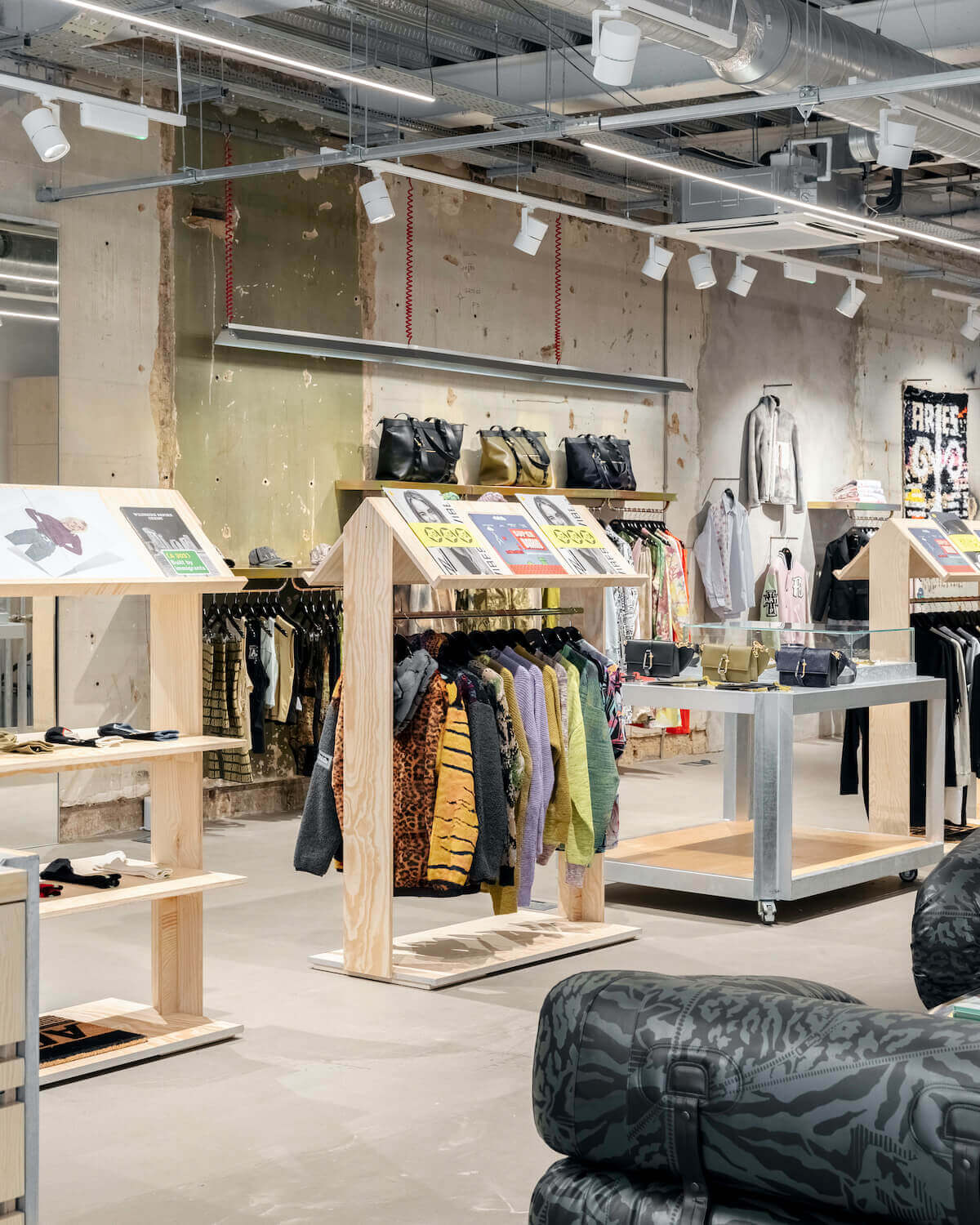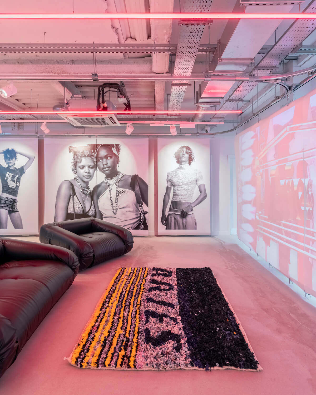 The interior (which doubles as an art space), designed in-house and in collaboration with London-based design consultancy Brinkworth and Wilson Brothers, articulates the brand’s British design identity. An original grand scaffold staircase that features handpicked marble treads becomes the cynosure. Bespoke Italian leather Anfibio sofas by Giovannetti – made in Italy and lined with Aries’ integral “animal” print – sit alongside mid-century style coffee tables and plush tufted rugs. Italian manufacturing can be found in certain design features too, such as the bespoke mid-floor wooden cabinetry and oversized furniture. Set against industrial Hilti walls with modular fixtures throughout, it’s an ever-evolving, modular space, fitted for constant reconfiguration.