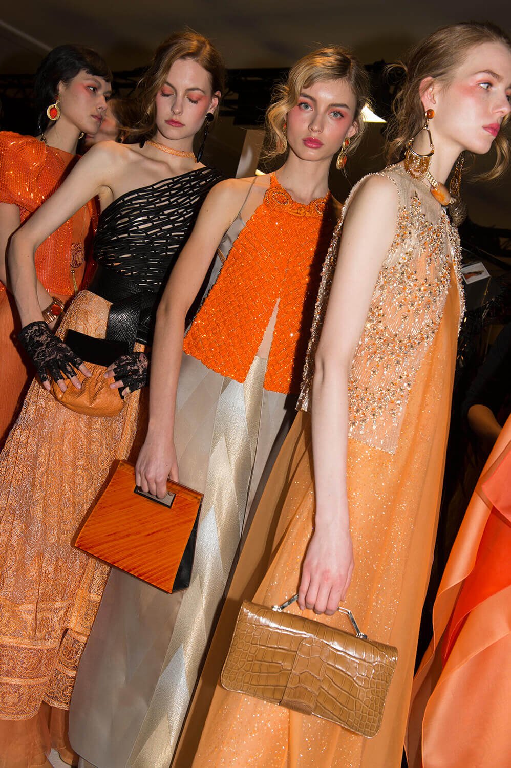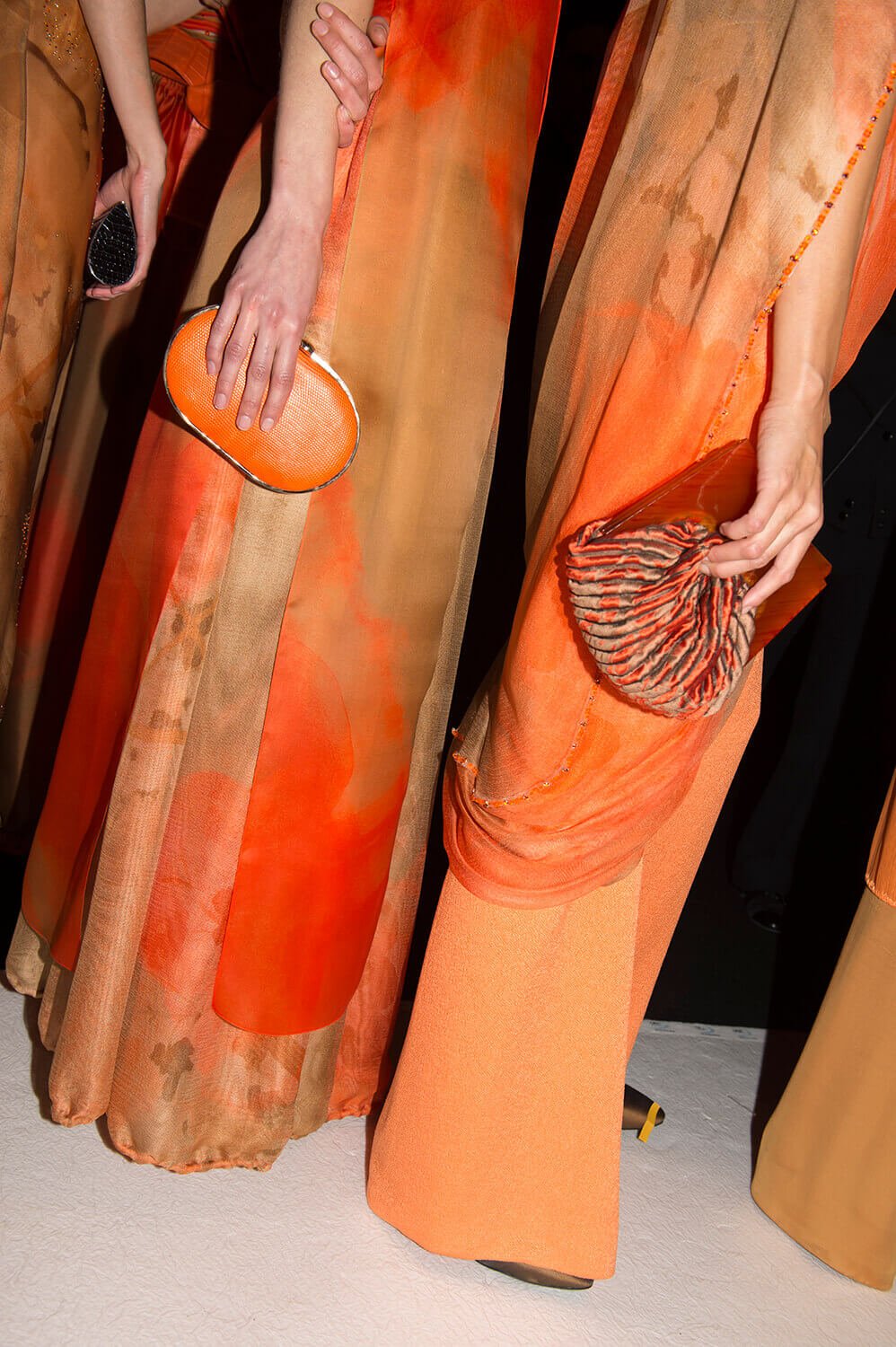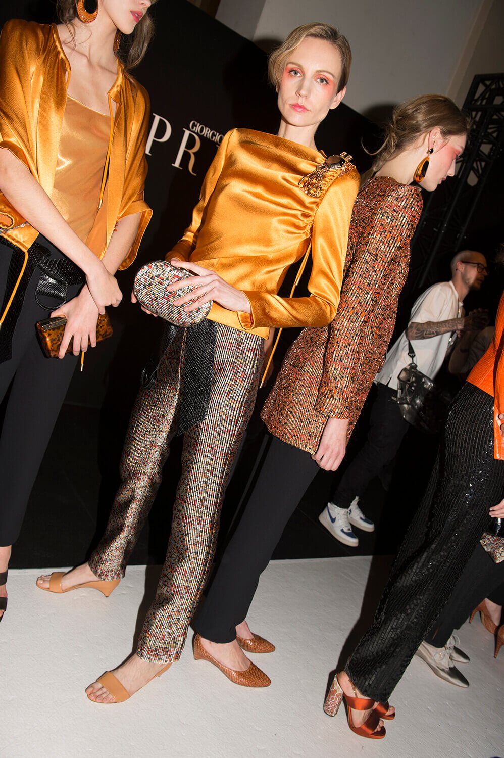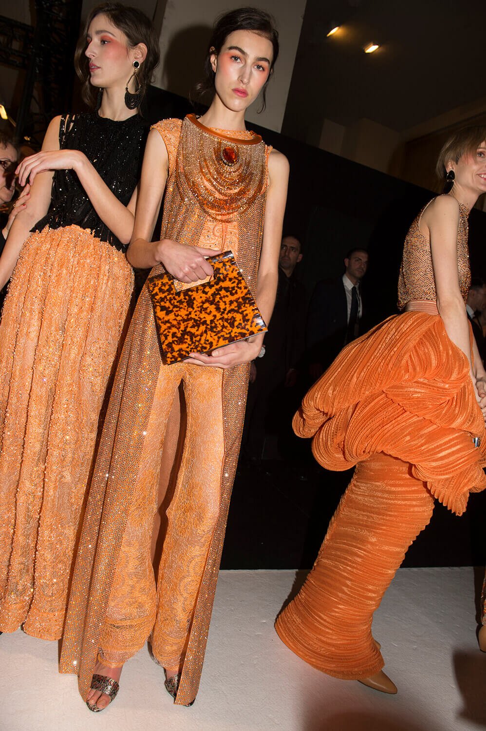 To quote those really quite annoying adverts that used to come on just before a film in the cinema: the future’s bright, the future’s orange. They, of course, were referring to the mobile phone network, but here, we are referring to Mr Armani’s latest Armani Privé offering. Which, unlike those, was neither annoying, nor has anything to do with mobile telecommunications. But it was certainly orange. Glorious, glorious orange, in shades of – let’s call it Moroccan sunset. A declaration, once and for all, that he’s not just the master of greige. Talking of Moroccan, there was something of the world traveller about this. Jet-set, first class passenger obviously – wide-leg silk trousers, almost kaftan-esque gowns, touches of animal print, all combined with the treasures she might find there – shimmering crystal bibs, chunky jewellery. And, as it unfolded it became a bit of a world tour – a shimmering jacket with Eastern-style buttoning sat next to flamenco frills, embellishments that veered towards Indian and, naturally, a touch of the Italian Amalfi-coast gentlewoman. Tis’ Armani, after all. To finish, a selection of gowns to get those couture customers on the front town applauding – delicious concoctions of plisse pleats and incredible, rich embellishments. How do you say more, more, more in Italian?