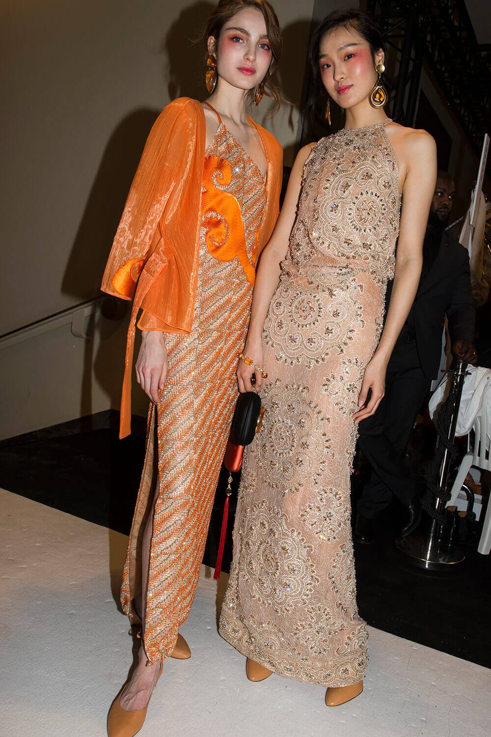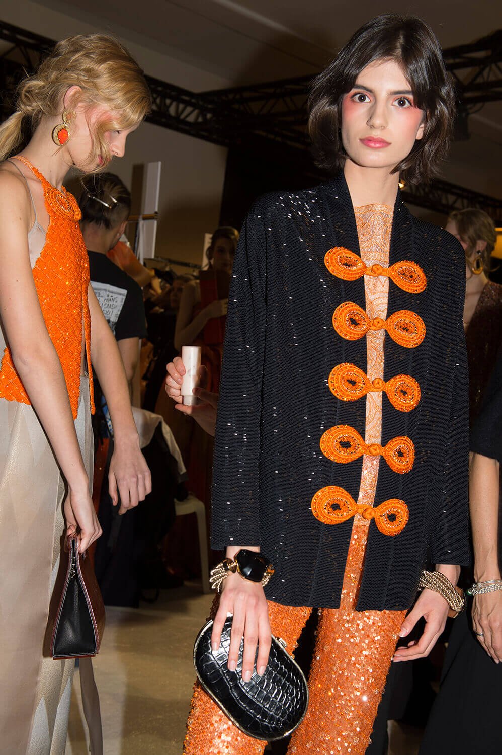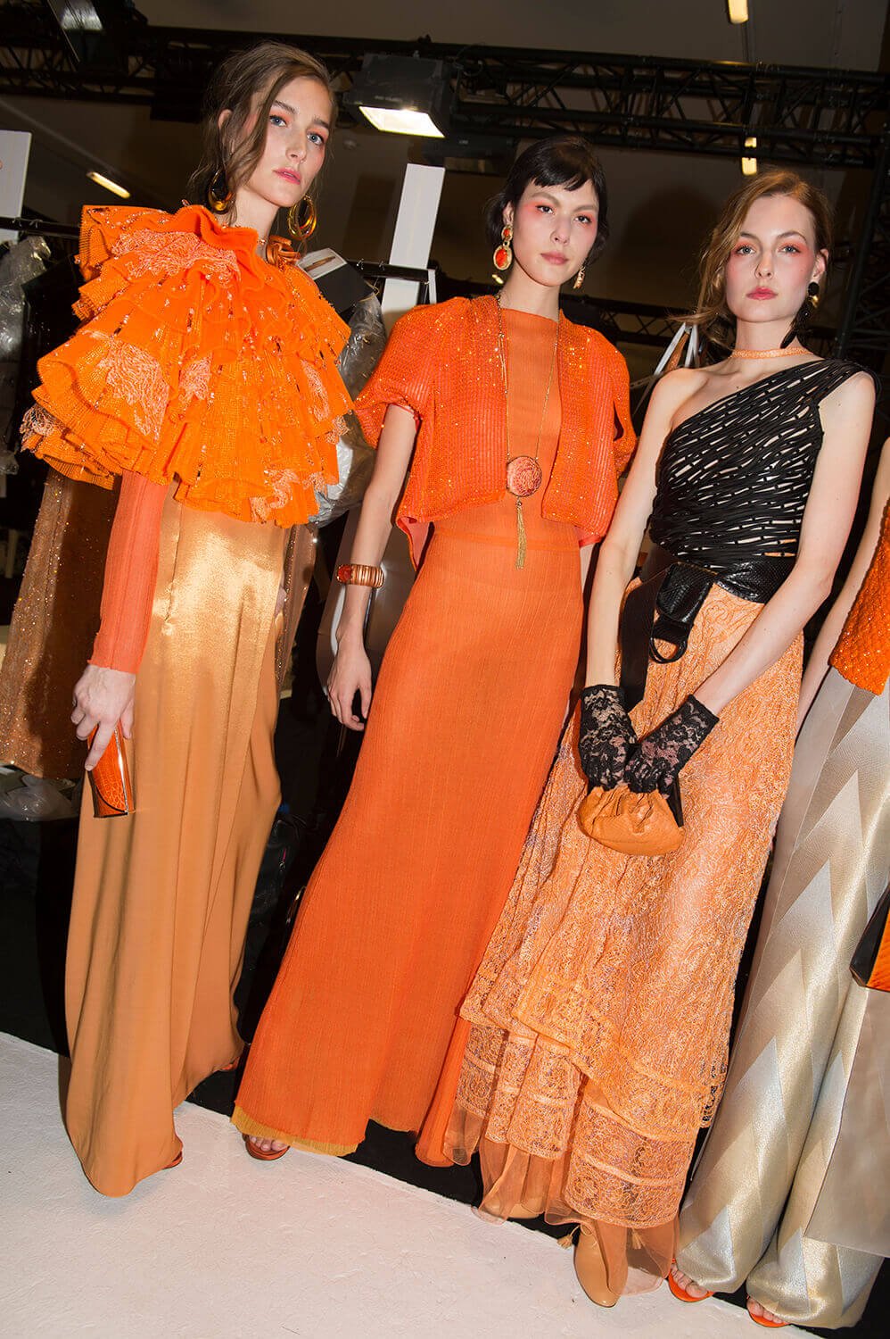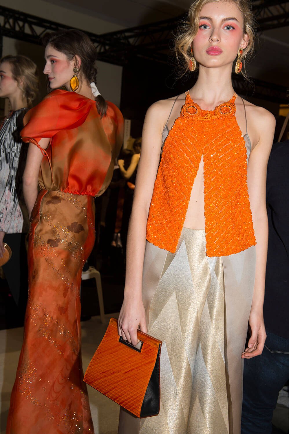 To quote those really quite annoying adverts that used to come on just before a film in the cinema: the future’s bright, the future’s orange. They, of course, were referring to the mobile phone network, but here, we are referring to Mr Armani’s latest Armani Privé offering. Which, unlike those, was neither annoying, nor has anything to do with mobile telecommunications. But it was certainly orange. Glorious, glorious orange, in shades of – let’s call it Moroccan sunset. A declaration, once and for all, that he’s not just the master of greige. Talking of Moroccan, there was something of the world traveller about this. Jet-set, first class passenger obviously – wide-leg silk trousers, almost kaftan-esque gowns, touches of animal print, all combined with the treasures she might find there – shimmering crystal bibs, chunky jewellery. And, as it unfolded it became a bit of a world tour – a shimmering jacket with Eastern-style buttoning sat next to flamenco frills, embellishments that veered towards Indian and, naturally, a touch of the Italian Amalfi-coast gentlewoman. Tis’ Armani, after all. To finish, a selection of gowns to get those couture customers on the front town applauding – delicious concoctions of plisse pleats and incredible, rich embellishments. How do you say more, more, more in Italian?