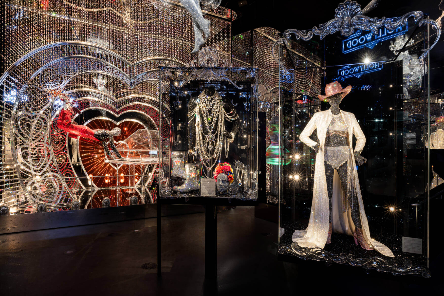 Also on display is a crystal-studded leotard once worn by Olympic-winning gymnast Simone Biles and a crystal-encrusted frock envisioned by Catherine D’Lish for burlesque icon, Dita Von Teese.
