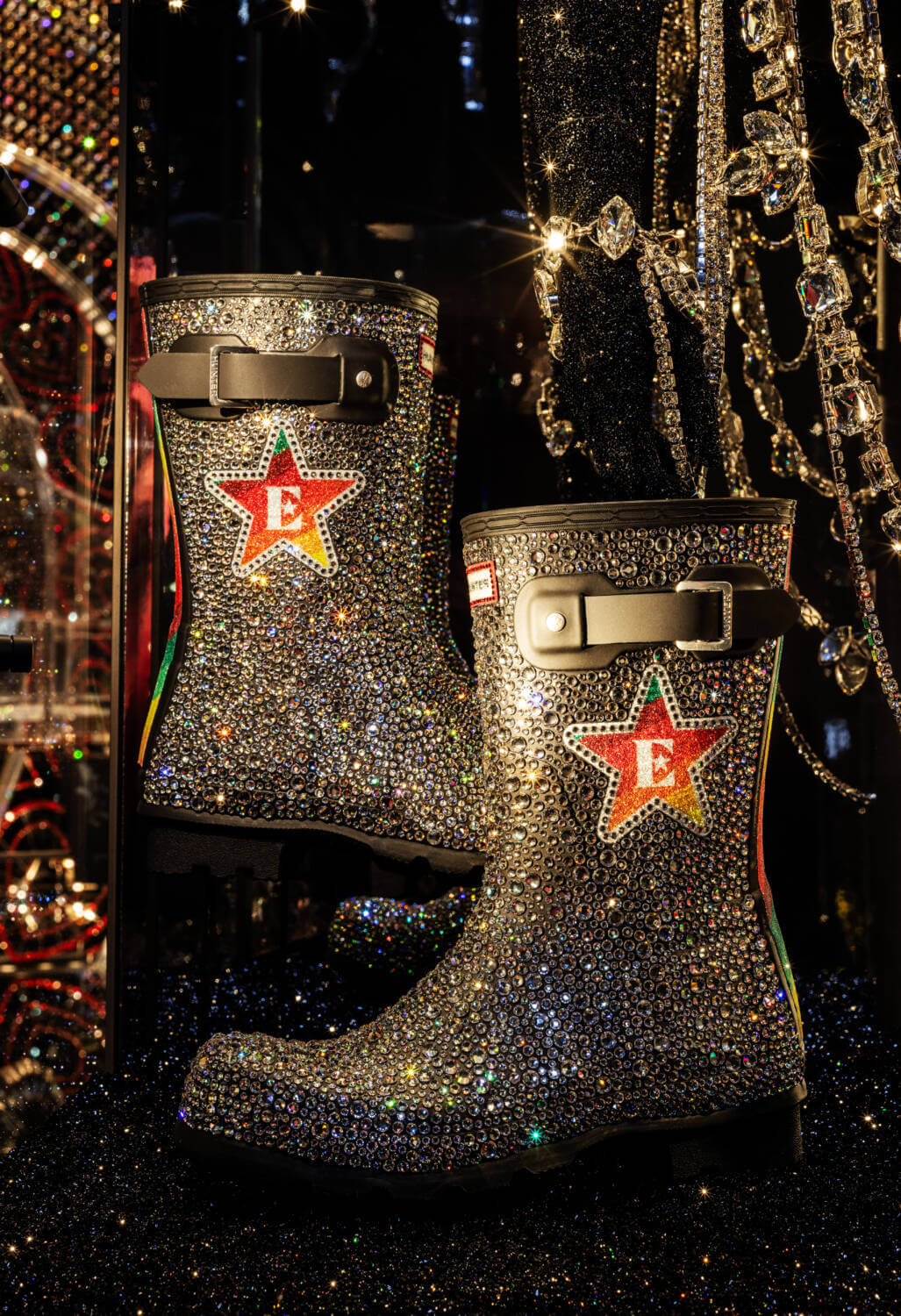 Throughout the exhibition, it’s pop that packs a serious punch. There’s a cowboy-inspired getup worn by Lady Gaga during her Joanne album cycle, a pair of bedazzled Hunter wellies made for Elton John’s Glastonbury headline slot last summer and the Moschino chandelier dress Katy Perry walked the pink carpet in at the 2019 Met Gala.