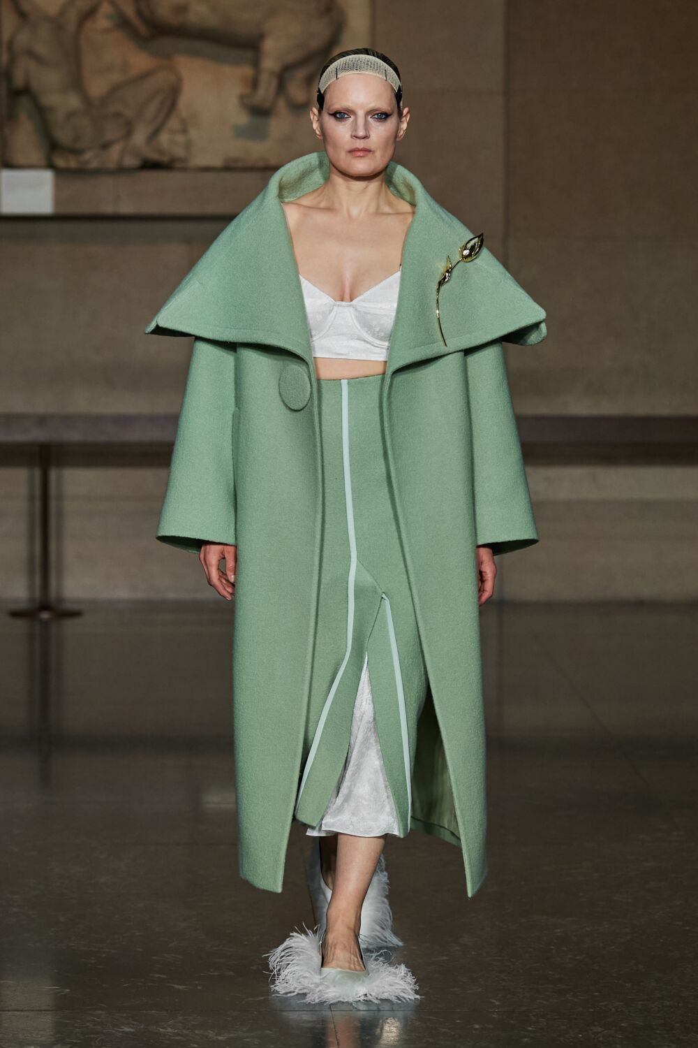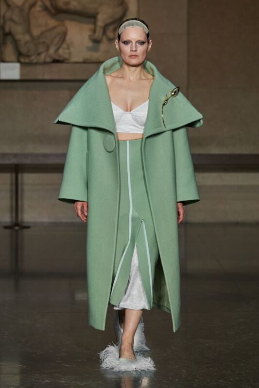 There is a sense of intimacy in the collection – lingerie-inspired details, structured silk pyjamas and a sense of the clothes worn in her own time, off stage. I find the complexities of any character can be the most interesting things. It’s the contrast between public grandeur and personal intimacy and vulnerability that I wanted to explore. The show opened with an opera coat with an exaggerated shawl collar in pistachio boucle wool, worn with a reserved pencil skirt with exposed seam details, which emphasised the idea of Maria Callas’ public and private persona.”